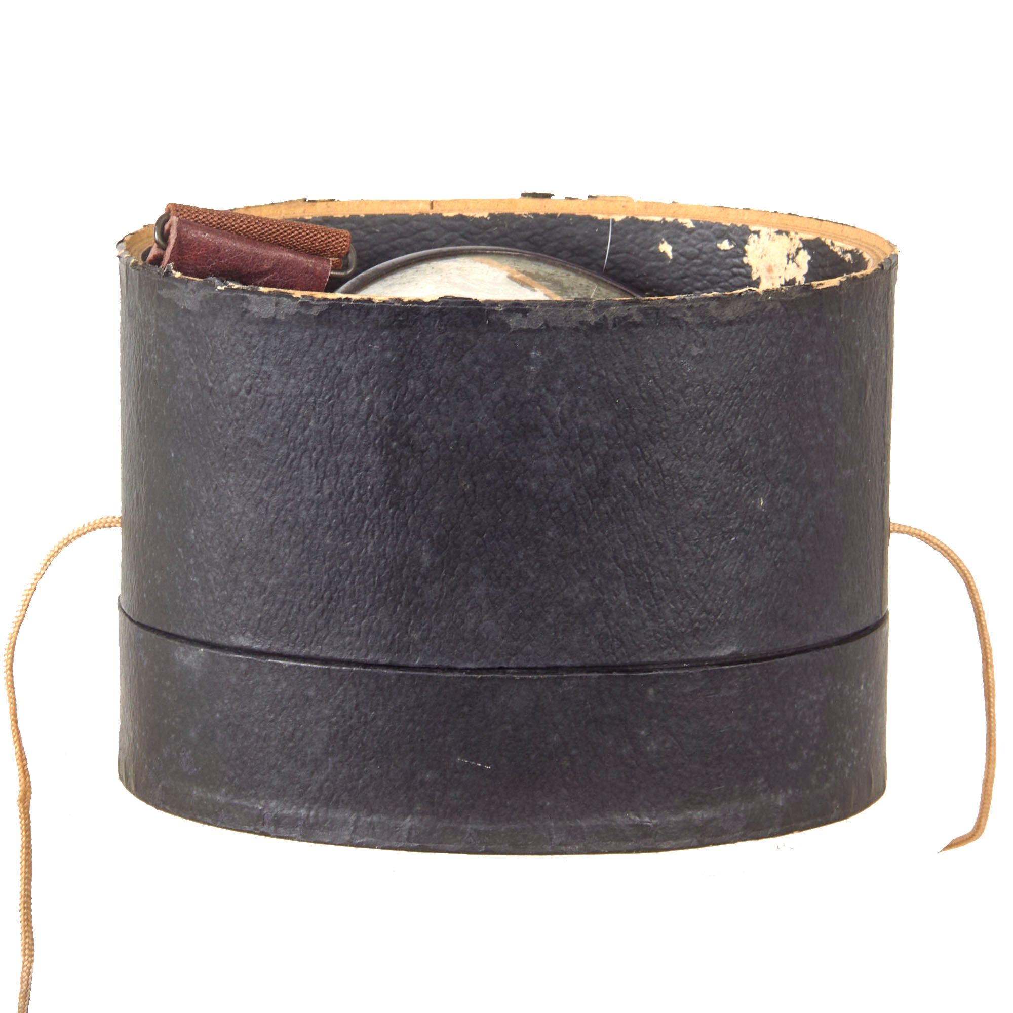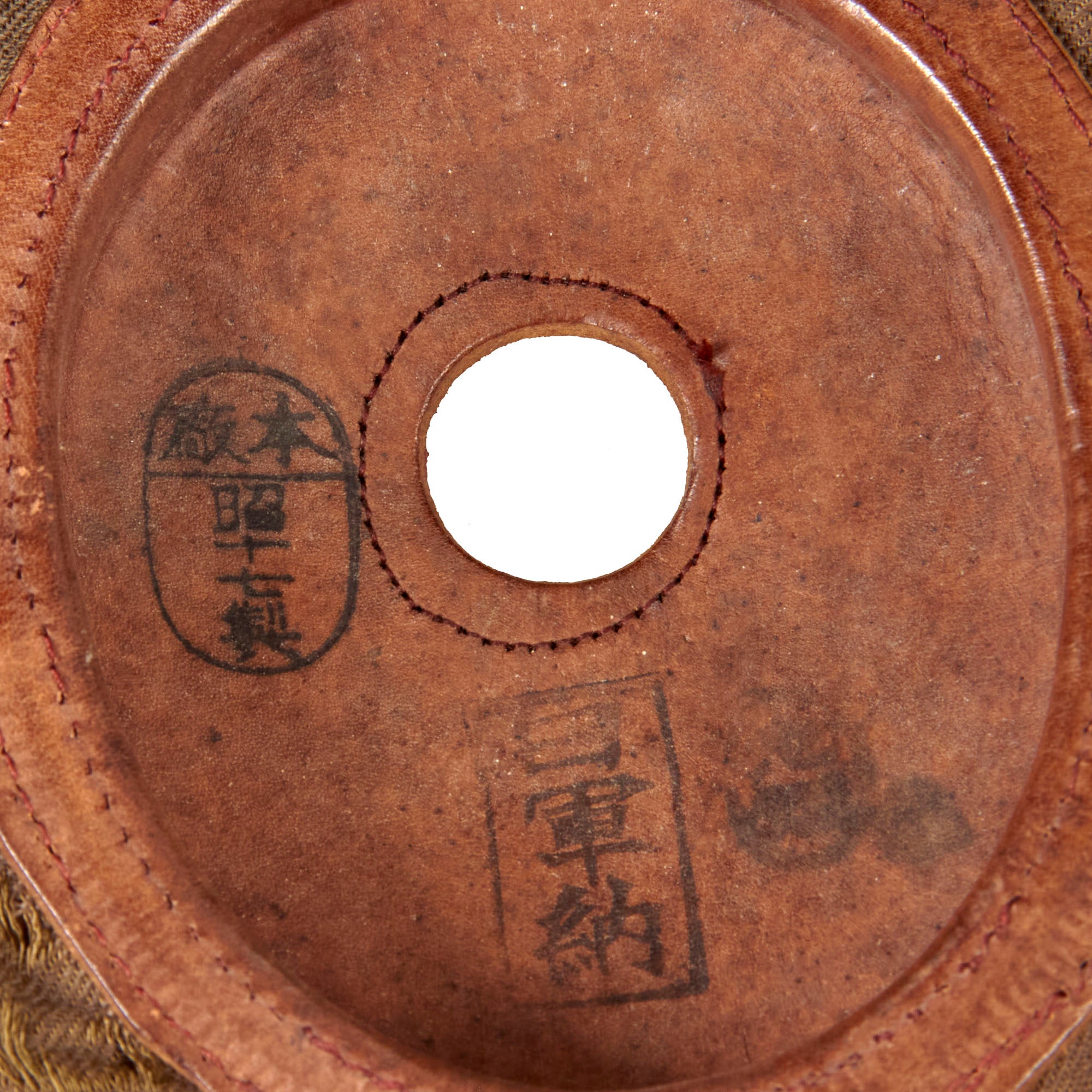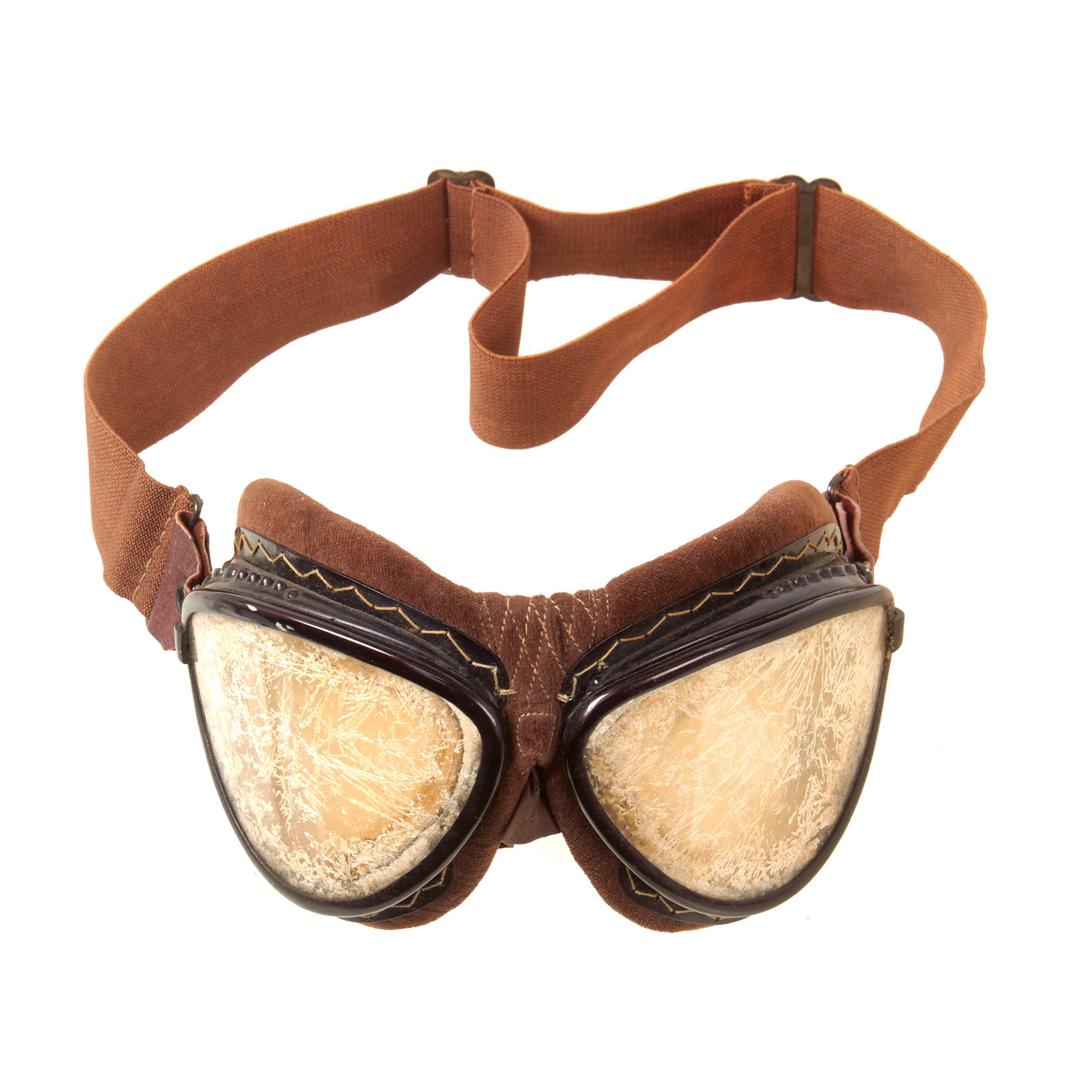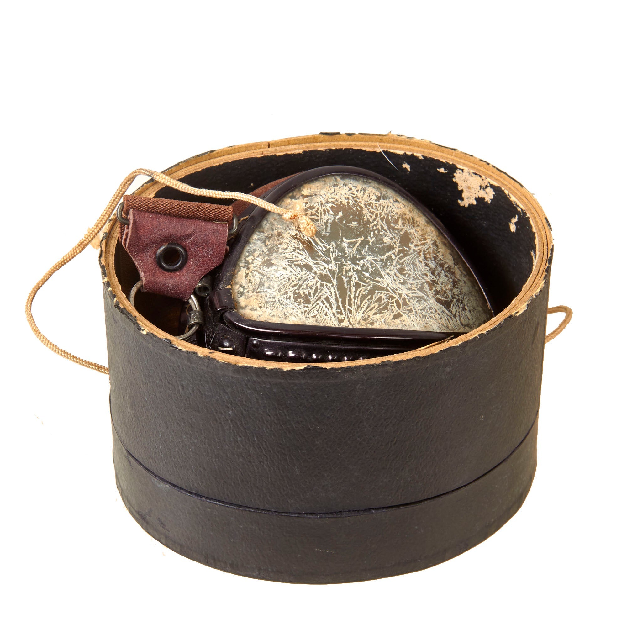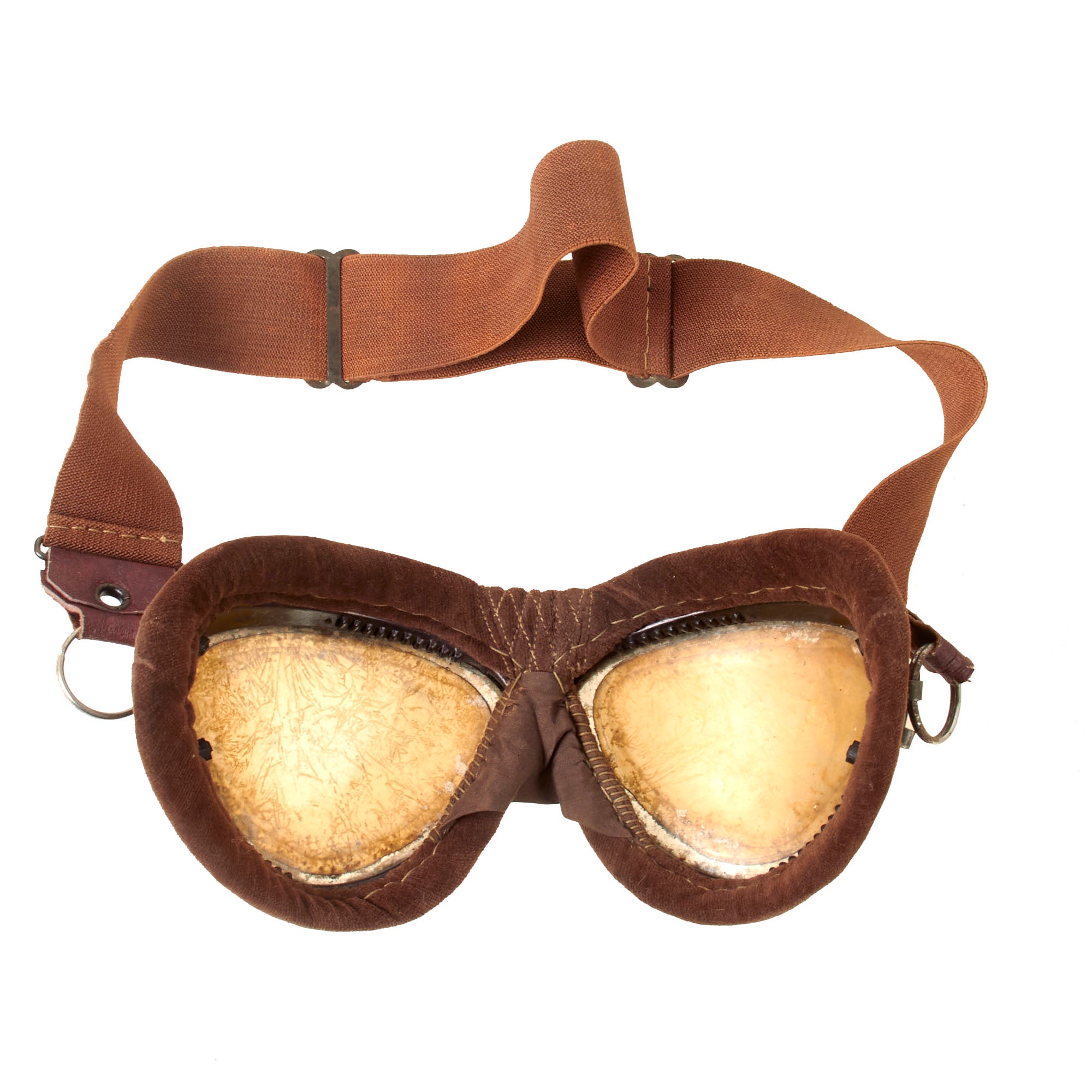 Included with the helmet is a set of original Japanese velvet-lined pilot’s goggles which come in their partial original case with the original velvet rag for cleaning. The case retains the pull string but one end of the case is missing. It comes with a velvet rag marked with an airplane insignia over Fukazawa Aircraft / Kanagawasaki.