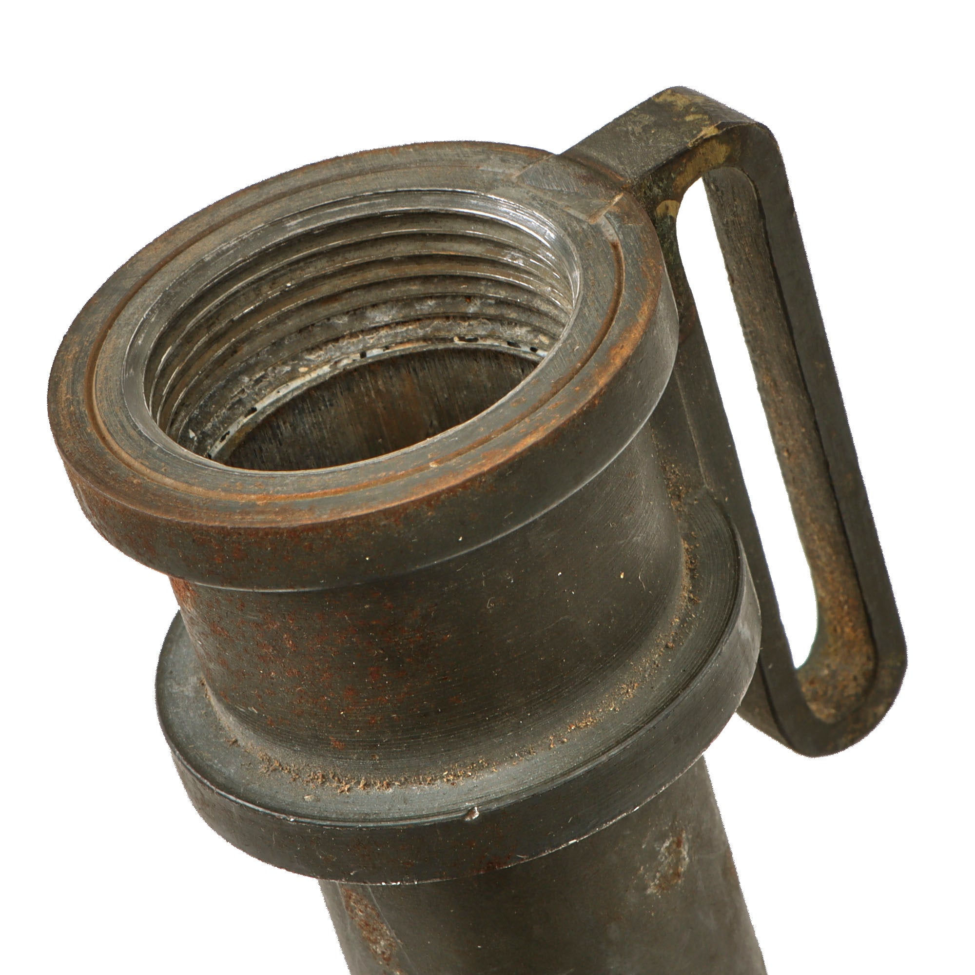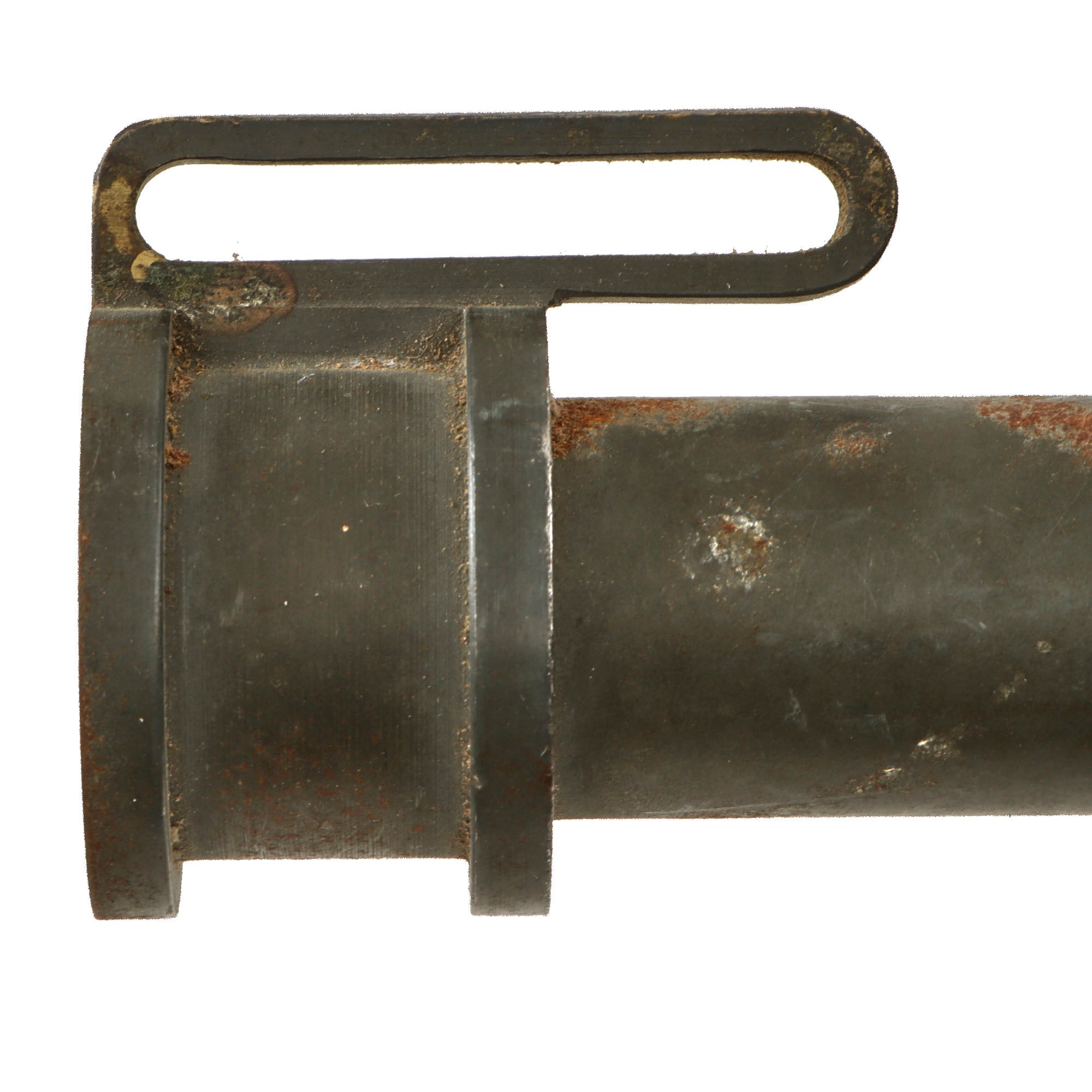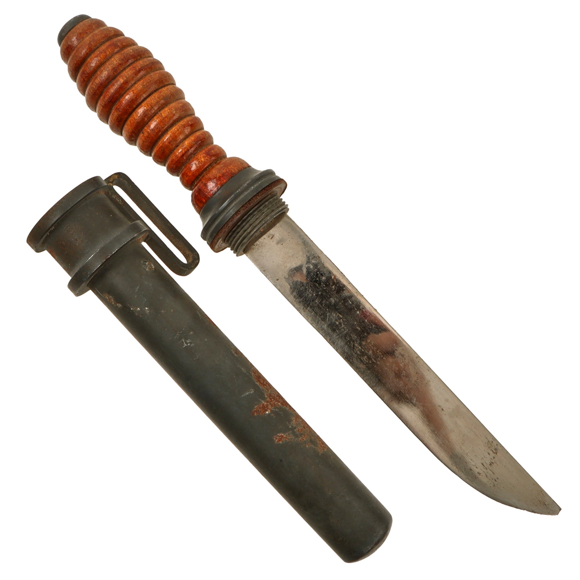 The 7 ¾” alloy scabbard shows moderate oxidation spotting but retains its finish well otherwise. There are no markings we could find across the knife or its scabbard, which is correct for this model. The reference available shows that these began production around 1940. The loop for attachment of a leather strap is still intact, but the strap is gone. The scabbard still screws on just fine, and the overall length with the scabbard on is about 12 ½”.