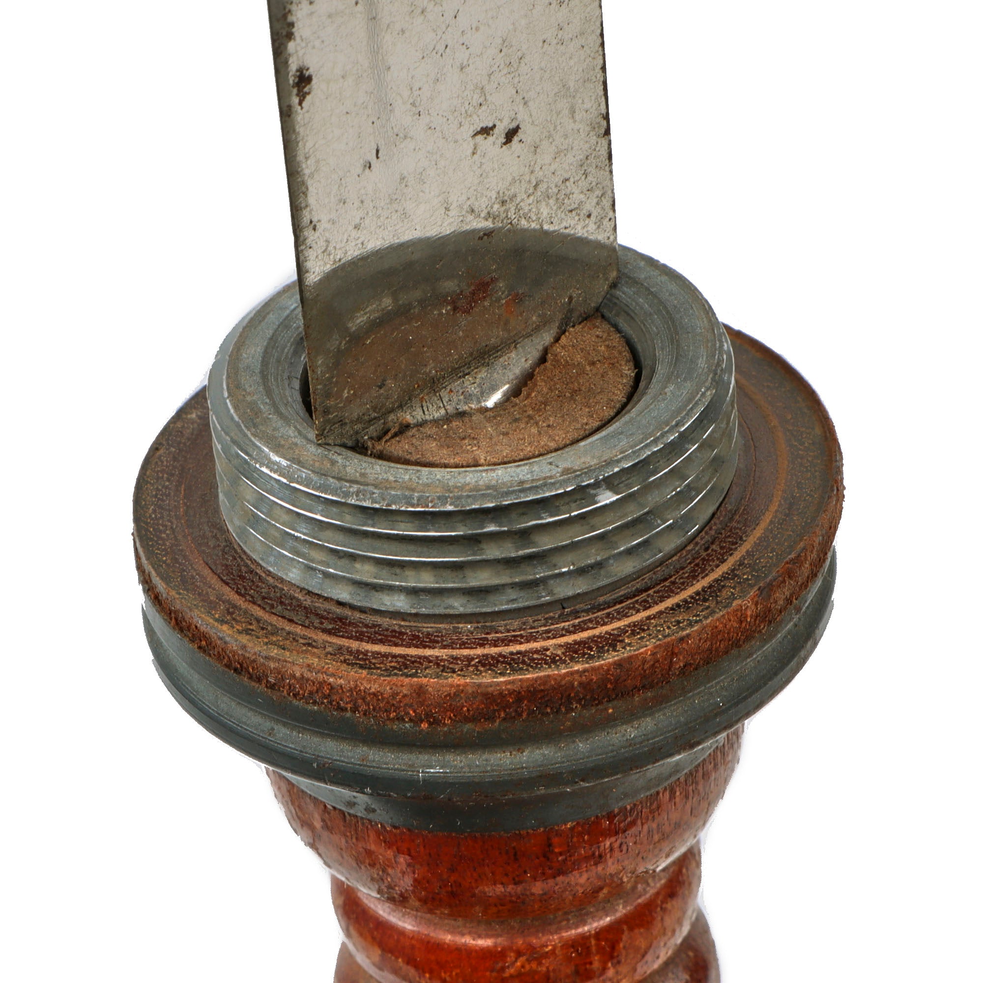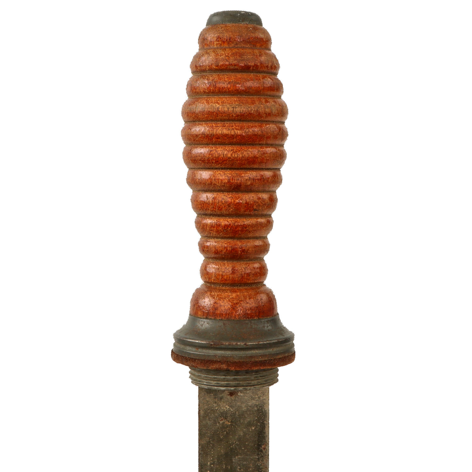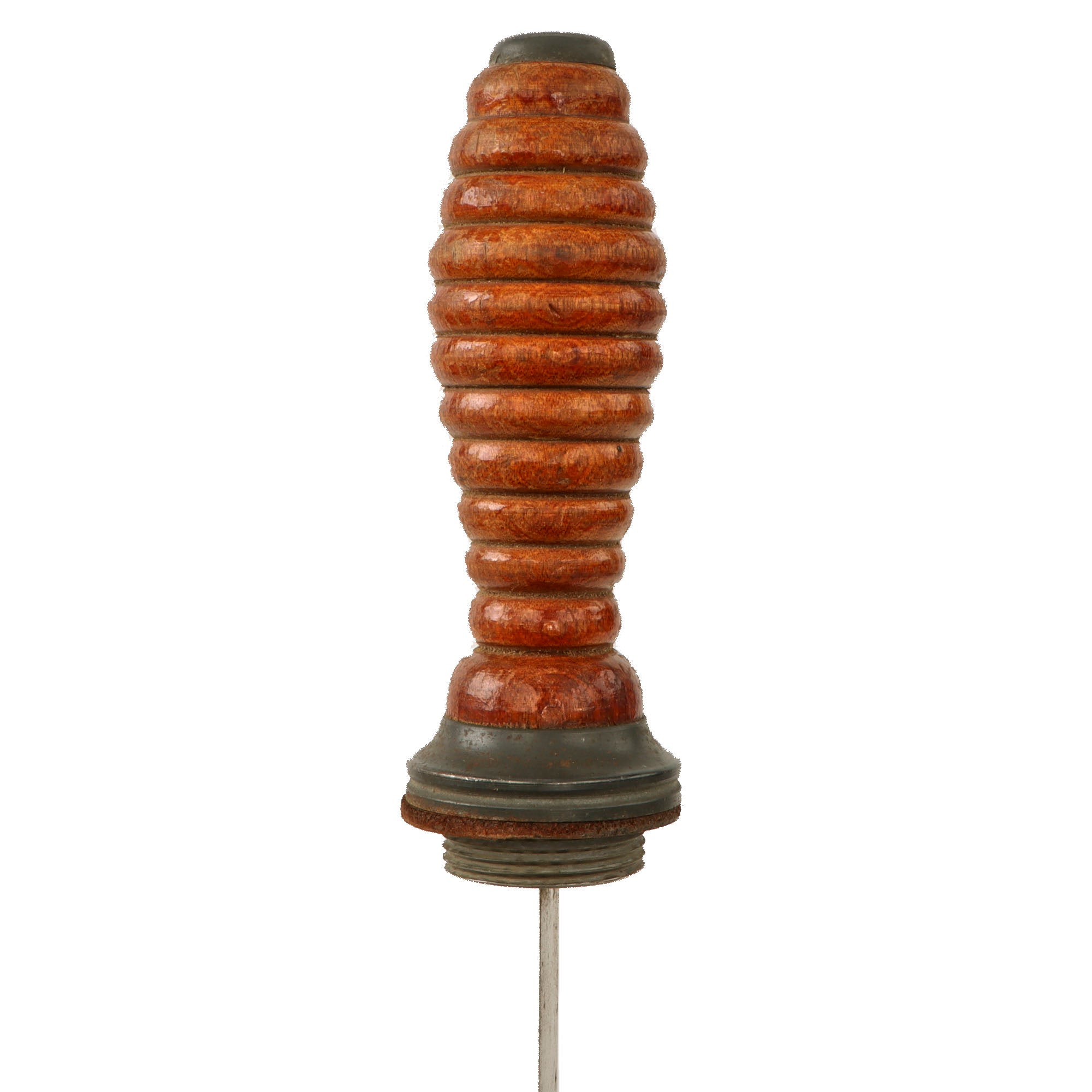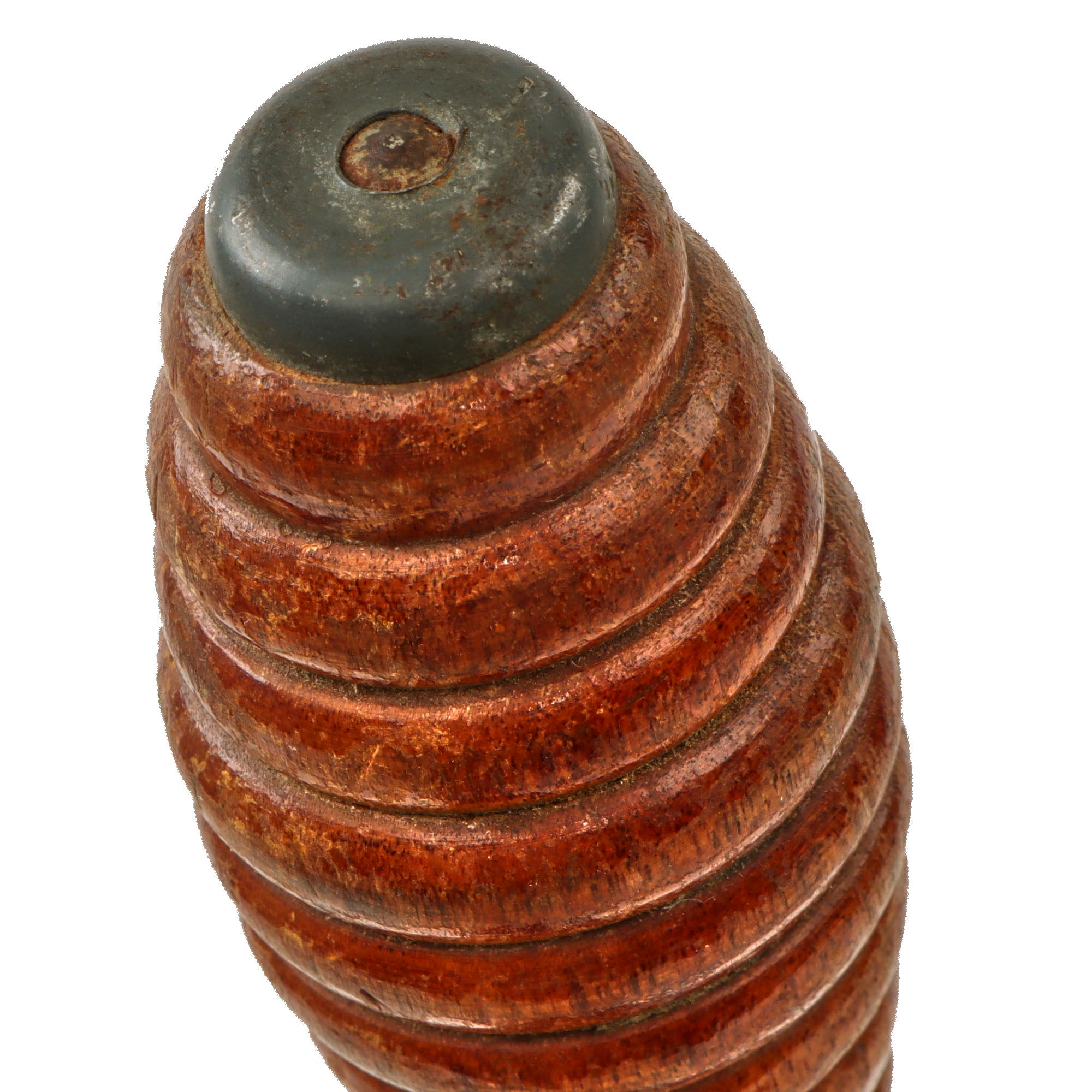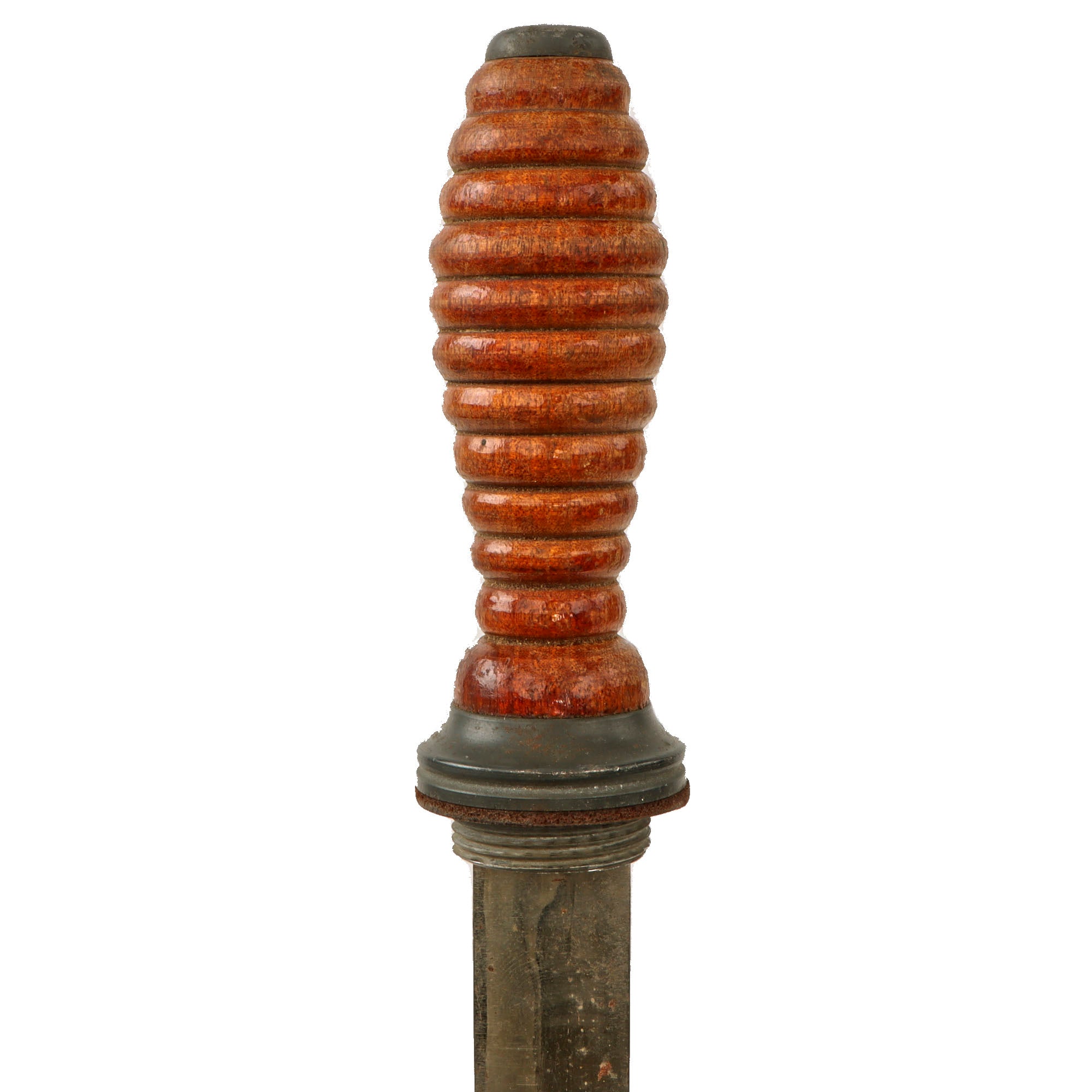 The 6 ⅞” blade shows some scattered oxidation spotting, and unfortunately the very tip of the blade has broken off, so the original length was likely 7”. The overall length is about 12” long, and the ribbed wood handle is in fantastic condition for its age. The blade appears seated between a piece of wood which is in good order. The leather buffer is still intact as well.