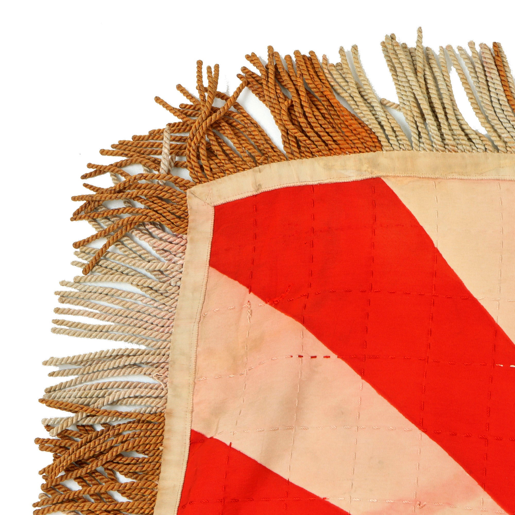 The flag shows heavy wear and light soiling, and the tassels seem to be fully intact, overall very good condition.