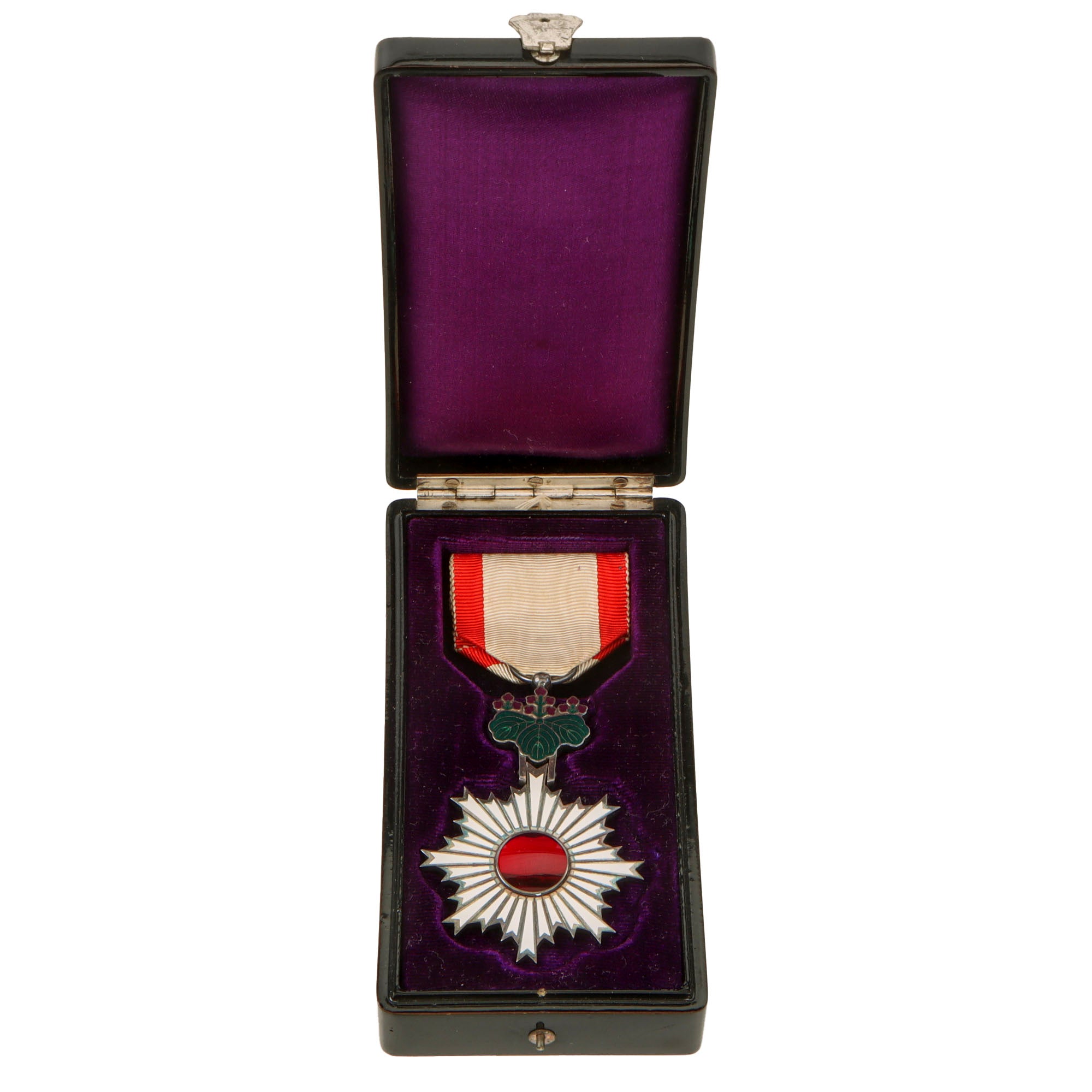 This is a very good example of the 6th Class Order of the Rising Sun, with the borders and metalwork all silver plated. These are identical to the 5th Class award, however that has part gold and part silver plating. The order is in fantastic condition with the enamel very well-retained. This example comes in its original purple velvet-lined presentation case, which is marked on the lid in "seal-style" script with 勲六等單光旭日章 (Order of the Rising Sun, 6th Class). It still has the original ribbon and 3-5-3 Paulownia flower device, however it is missing the rosette that would have come with the award.