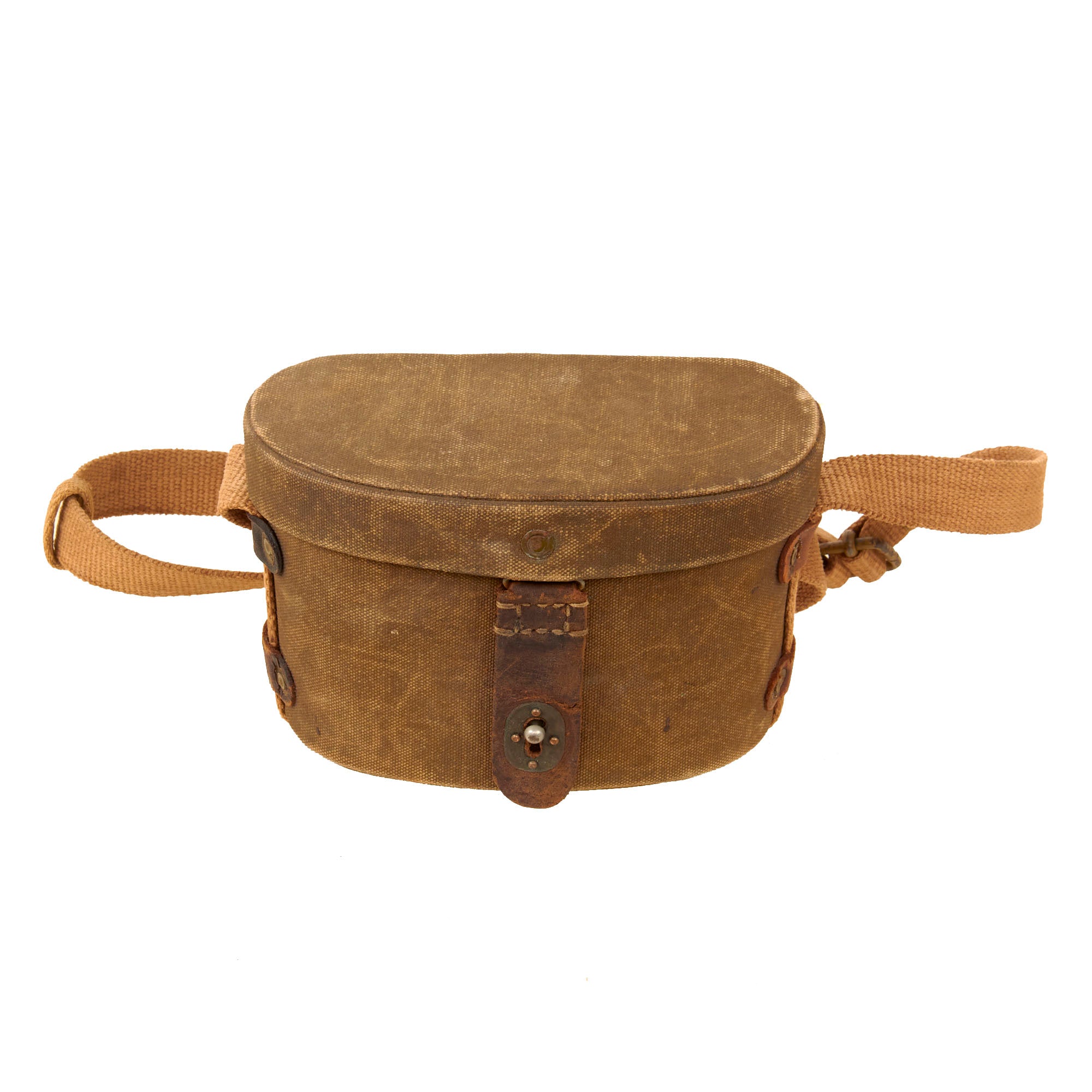 The case is of the painted canvas type, common for tropical use, and is in good condition, with the carrying strap and closure strap still retained, but the strap is worn and aged. The woven canvas belt loop is very well-retained.