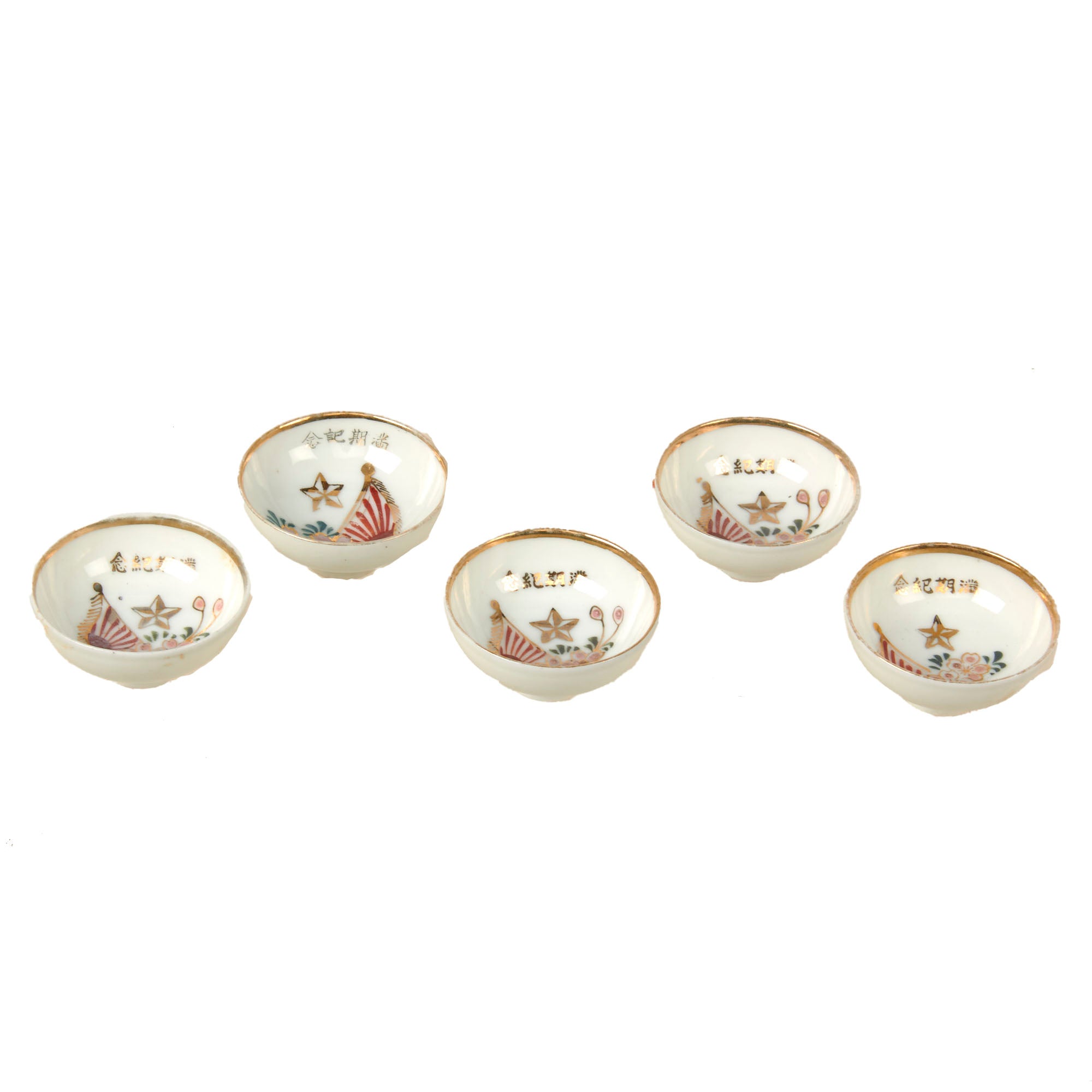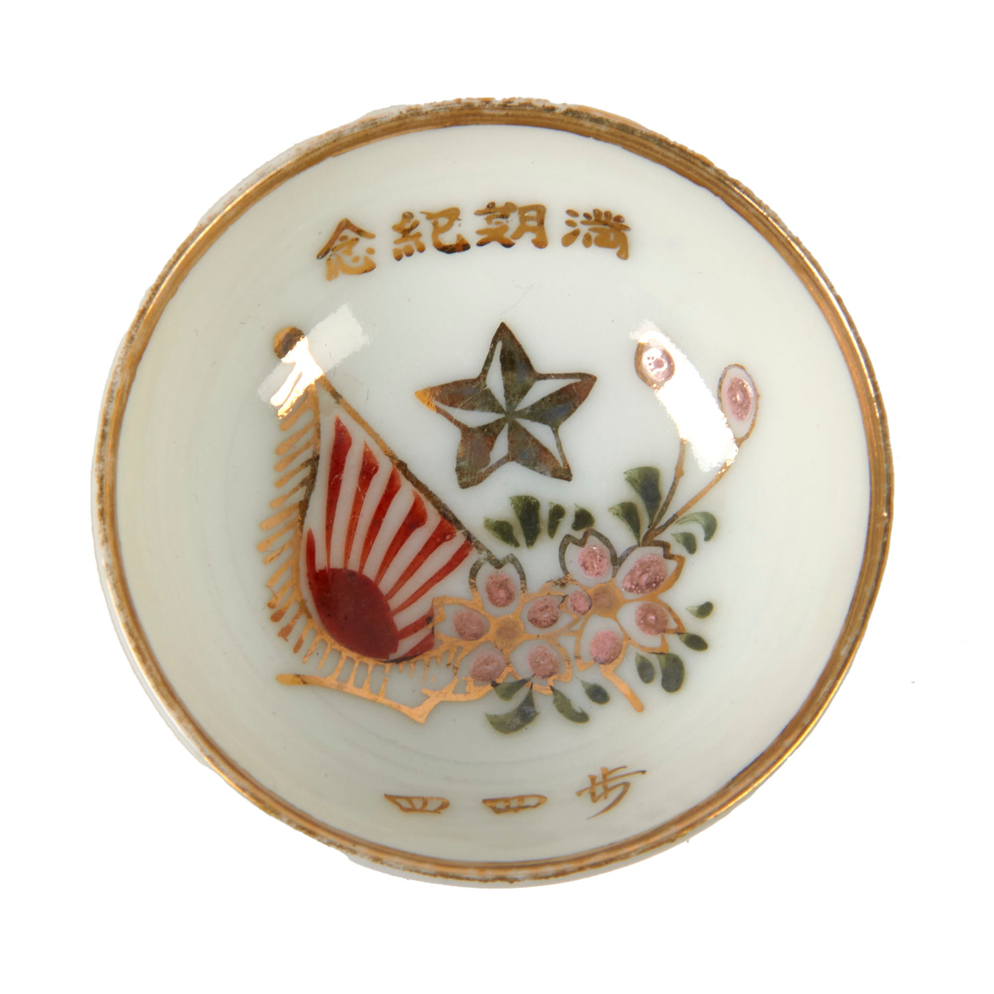 There are six sake cups in this lot, all of which feature a lovely painted floral motif with Rising Sun flags of Japan. Each cup features different writing, worthy of being translated and researched further.