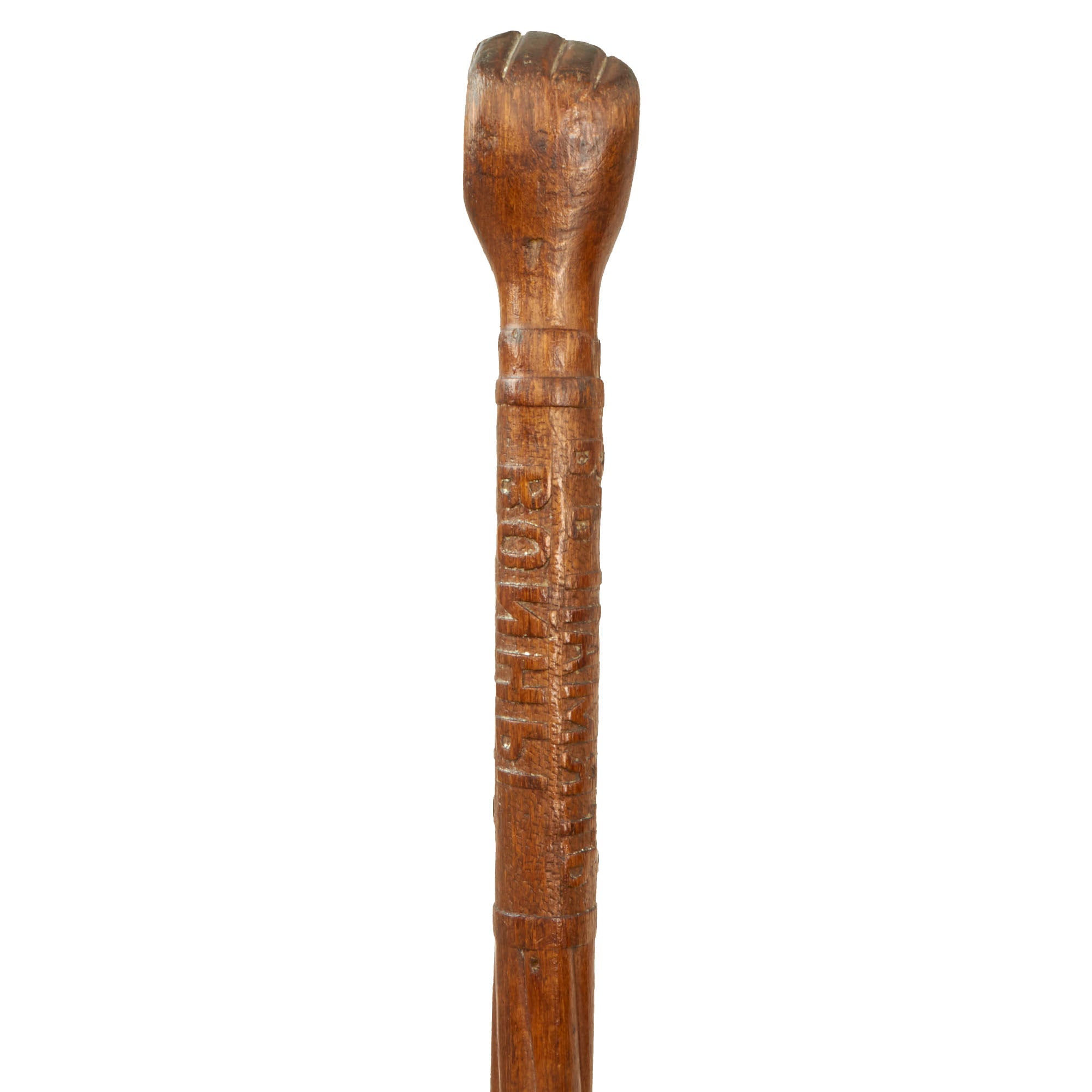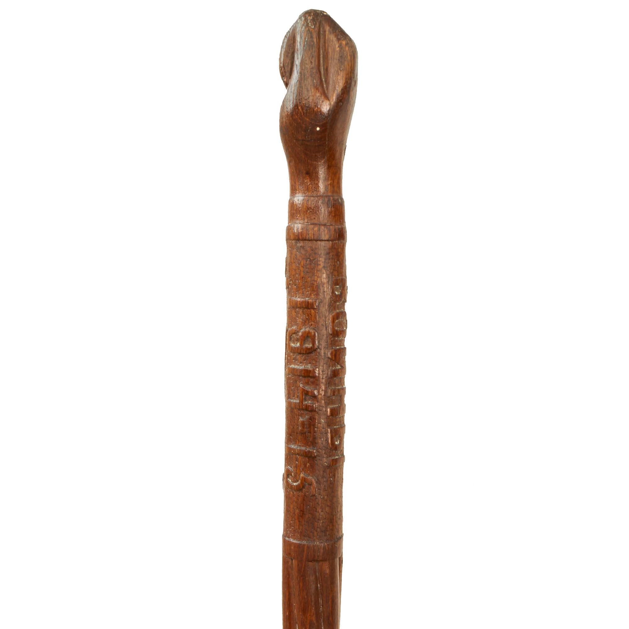 Original Item. One-of-a-Kind. This is a very tremendous piece of Russian “trench art”, a hand-carved swagger stick made by a soldier in 1915, as below the handle is carved the dates 1914-1915, indicating the year it was made. Above this, in Russian, is the phrase, In Memory of the Warriors, meant to commemorate the 1,000,000+ Russian soldiers who had already become casualties.