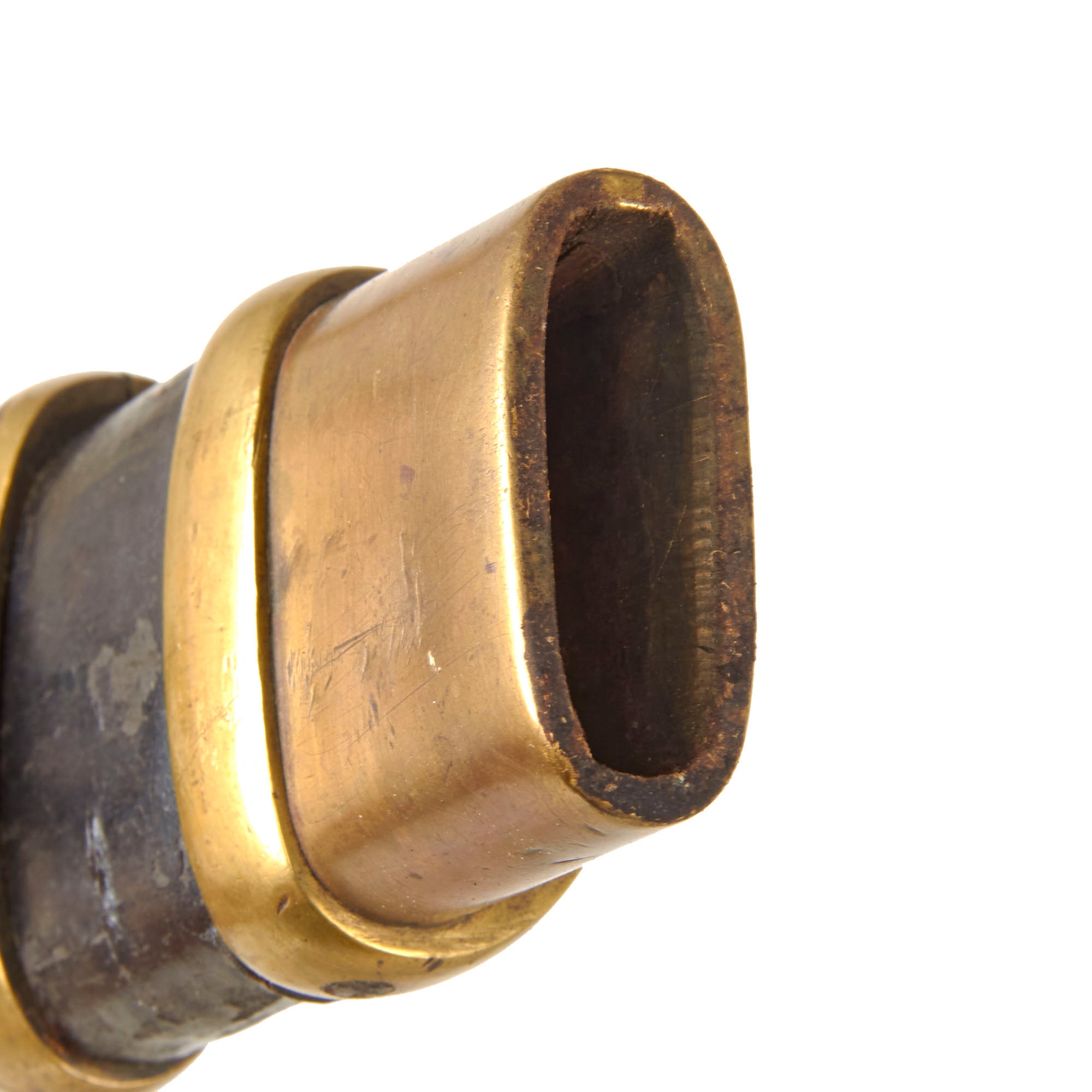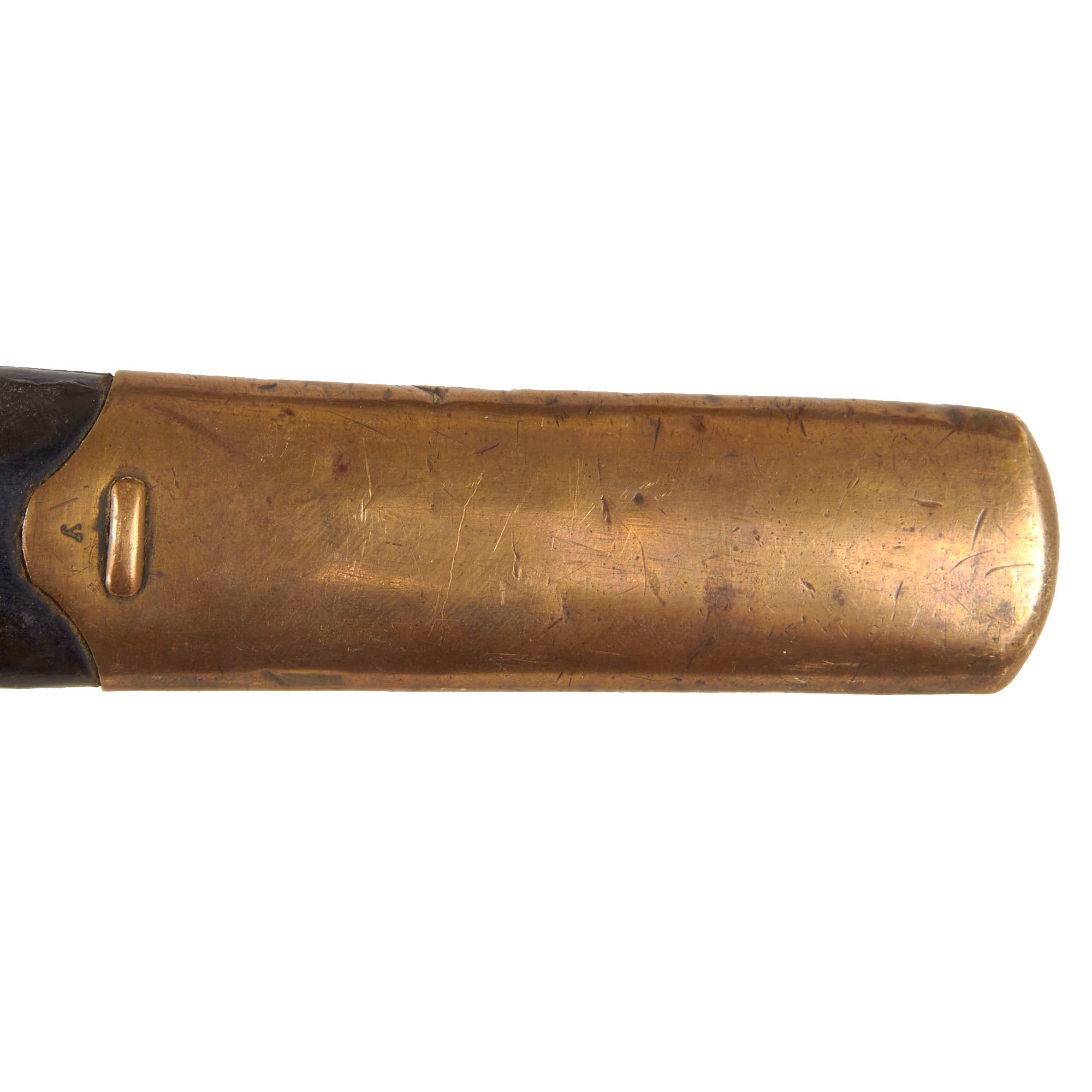 The Included scabbard is the correct leather covered wood, with intact brass fittings. Some scabbards were also outfitted to hold a Mosin-Nagant bayonet, and this is an example of that, though there is no bayonet there now. The condition is very good, with almost all of the leather and finish intact. These were worn edge up, so often the top of the scabbard would see more wear and denting than the bottom. The suspension ring is intact.