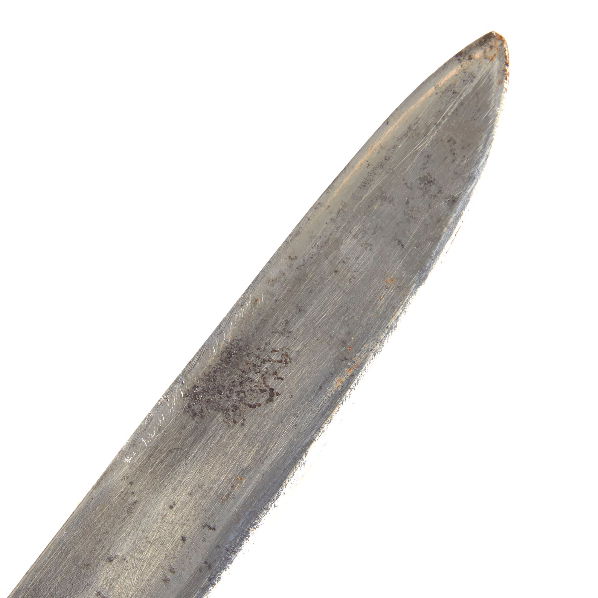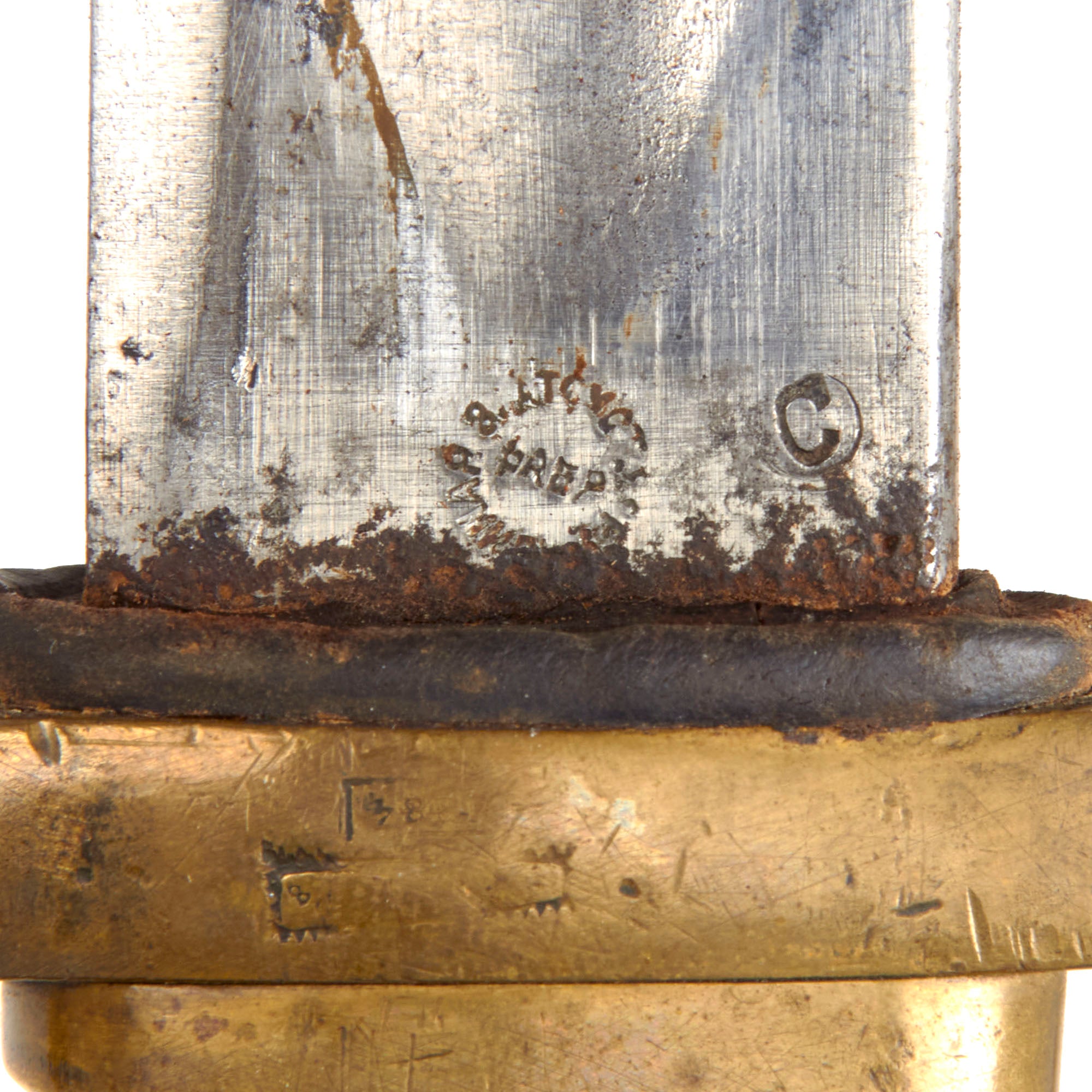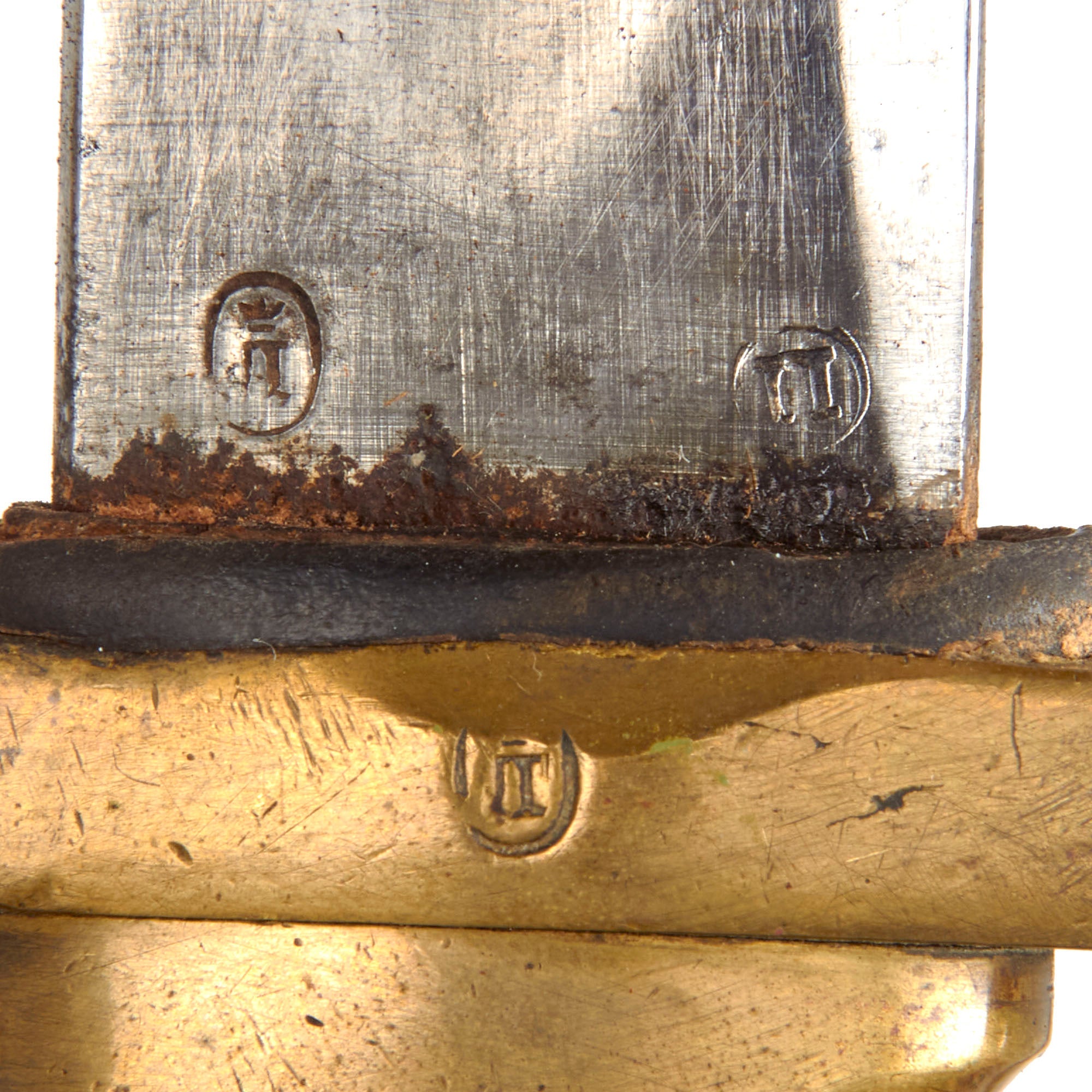 The 34 1/4 inch long blade is in very good condition, though it definitely does show use and age. It has been plated and then sharpened, and there are some small nicks and dents near the point, with heavy oxidation peeking through the plating. This looks to be a sword that saw some real use during its life, and is still relatively sharp. The blade ricasso has clear unit / regiment markings, and there are visible Zlatoust (Златоуст) factory markings on the blade, with a marking on the crossguard that appears to read 1884, but we cannot say this for certain. There are several other small markings on the blade and crossguard.