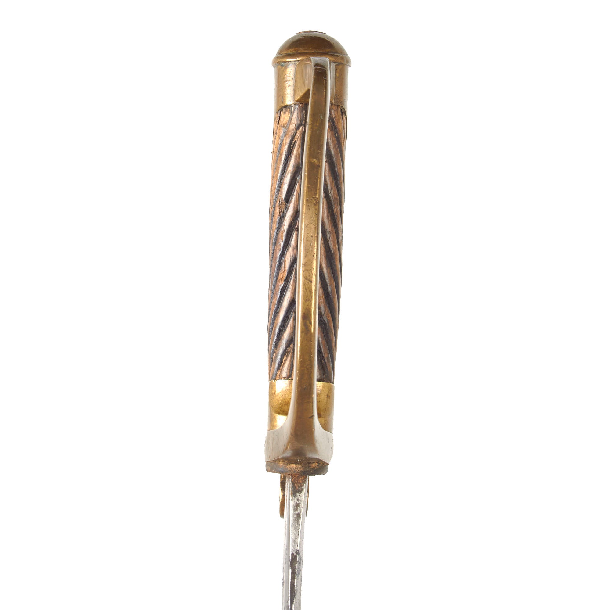 The hilt is still very snug on the tang, with no wobble, and the original leather blade buffer is present as well. The tang nut does not show any signs of turning any time recently, and is level with the pommel. The hilt overall has a lovely patina, and the grooved wooden grip is still in very good shape with a small bit of looseness.