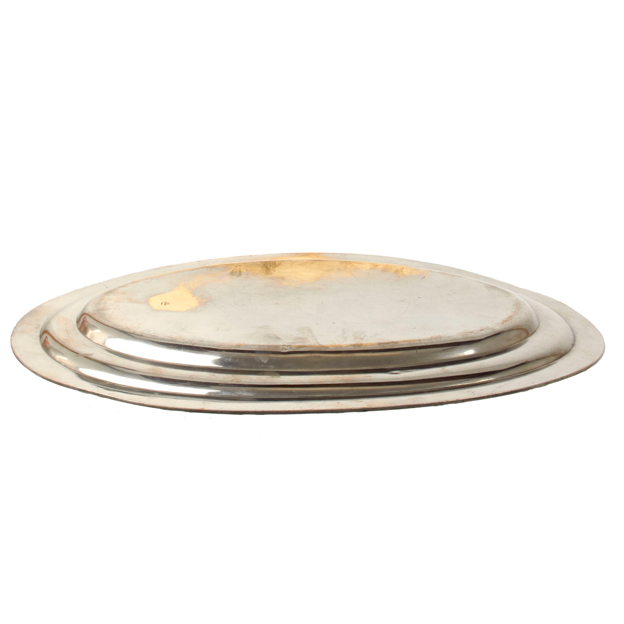 The Serving Tray is silver plated with a ribbed border around the edge, which has crossed ribbon devices about every 2 inches. The tray retains most of the original plating and all of the artwork is still visible. The only damage or discrepancy would be the plating wear and tarnishing.