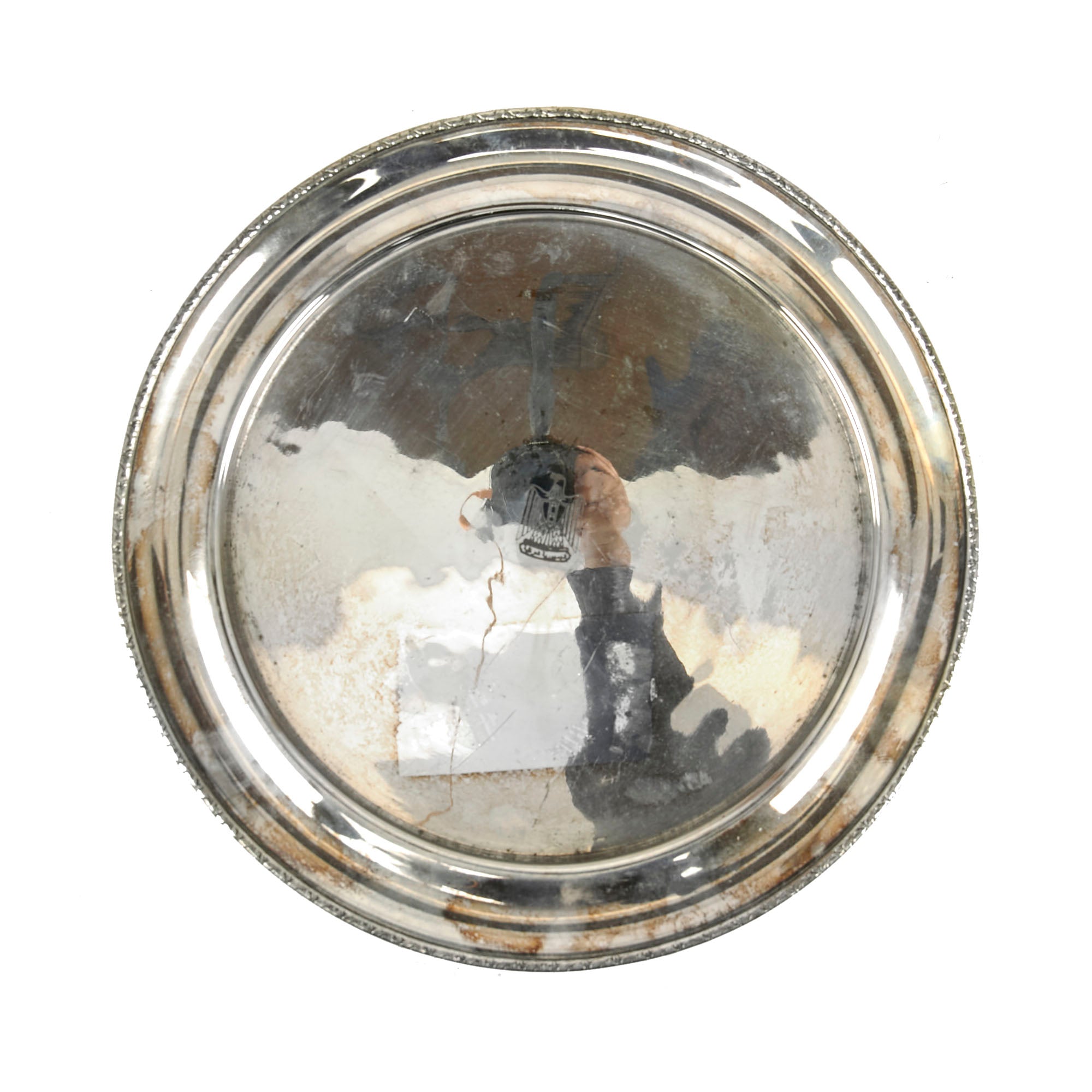 Original Iraq War Saddam Hussein Silver Plated Round Serving Tray with Iraq Coat of Arms - From Basra Airport - Christofle Silver