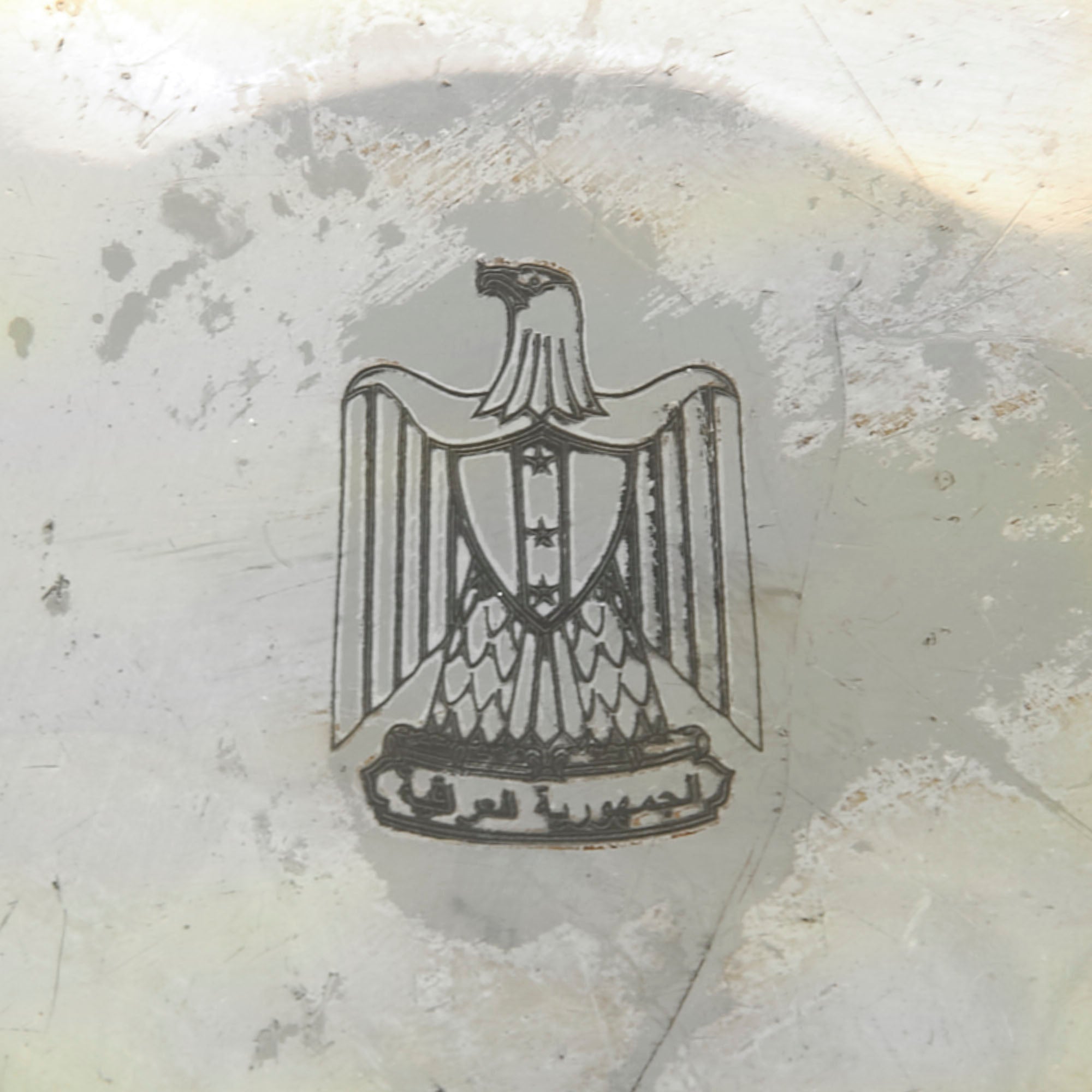 The center of the tray features a beautiful roll-stamped Iraq Coat of Arms that was used from 1965 to 1991. Roll Stamping is similar to Impression Marking, but involves a flat die and a round part. The flat die is pressed into the round part as it rolls across the periphery. Rolling a die over a part creates less stress since all of the pressure is not being applied to the marking area at the same time.