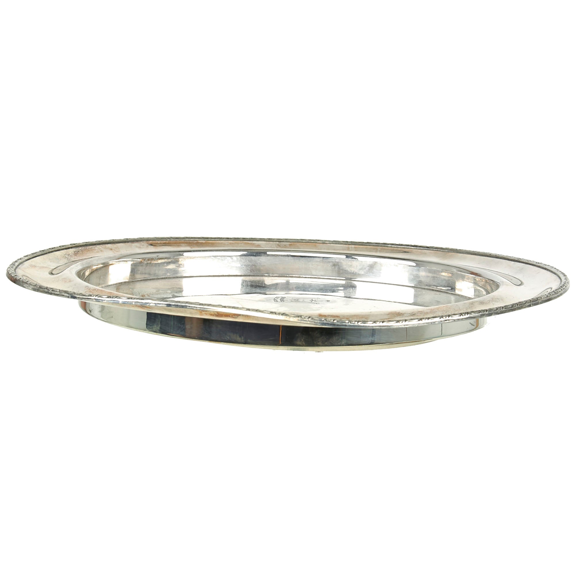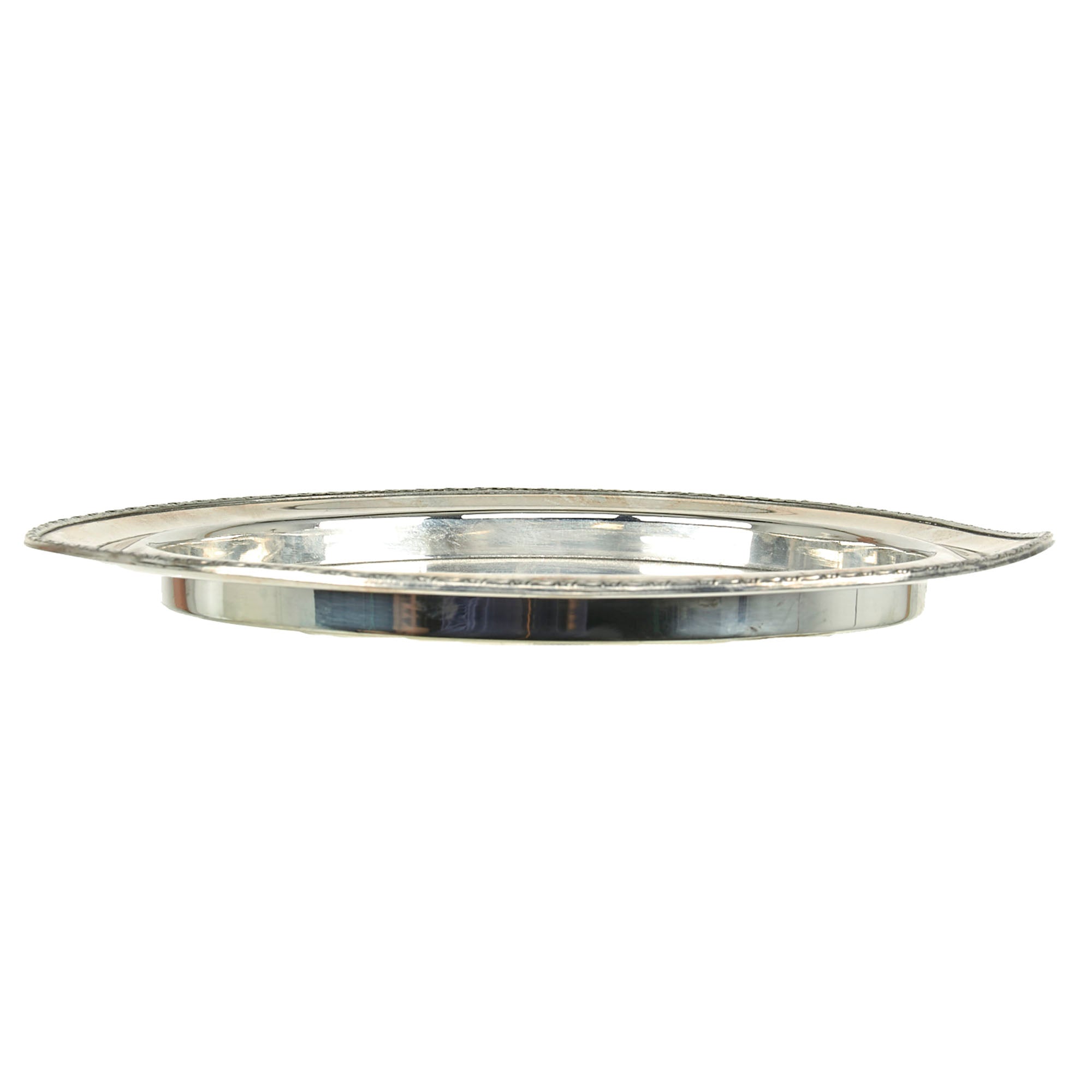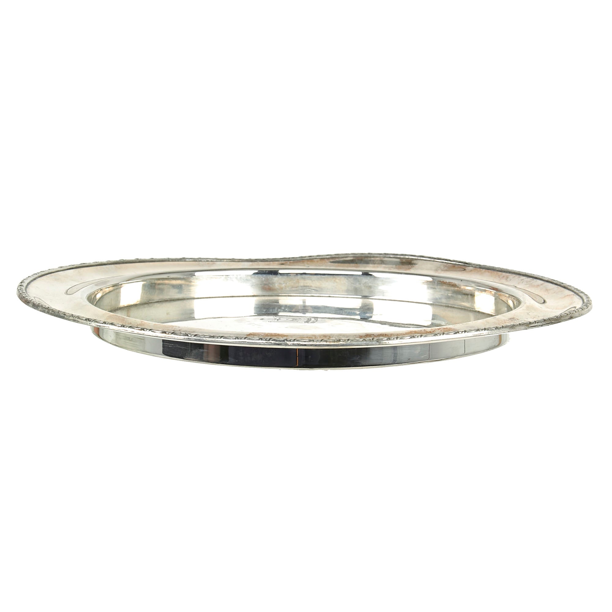 The Round Serving Tray is silver plated and measures 10 3/4 inches in diameter, with a 8 1/4 wide flat center recess, looking very much to be for a cake or something similar. There is a lovely repeating foliate motif border at the very edge. The tray retains most of the original plating on both sides, with some scrapes on the bottom from handling. It does not look to have been used much when compared to other types of trays we have seen. The only damage or discrepancy would be the plating wear and tarnishing.