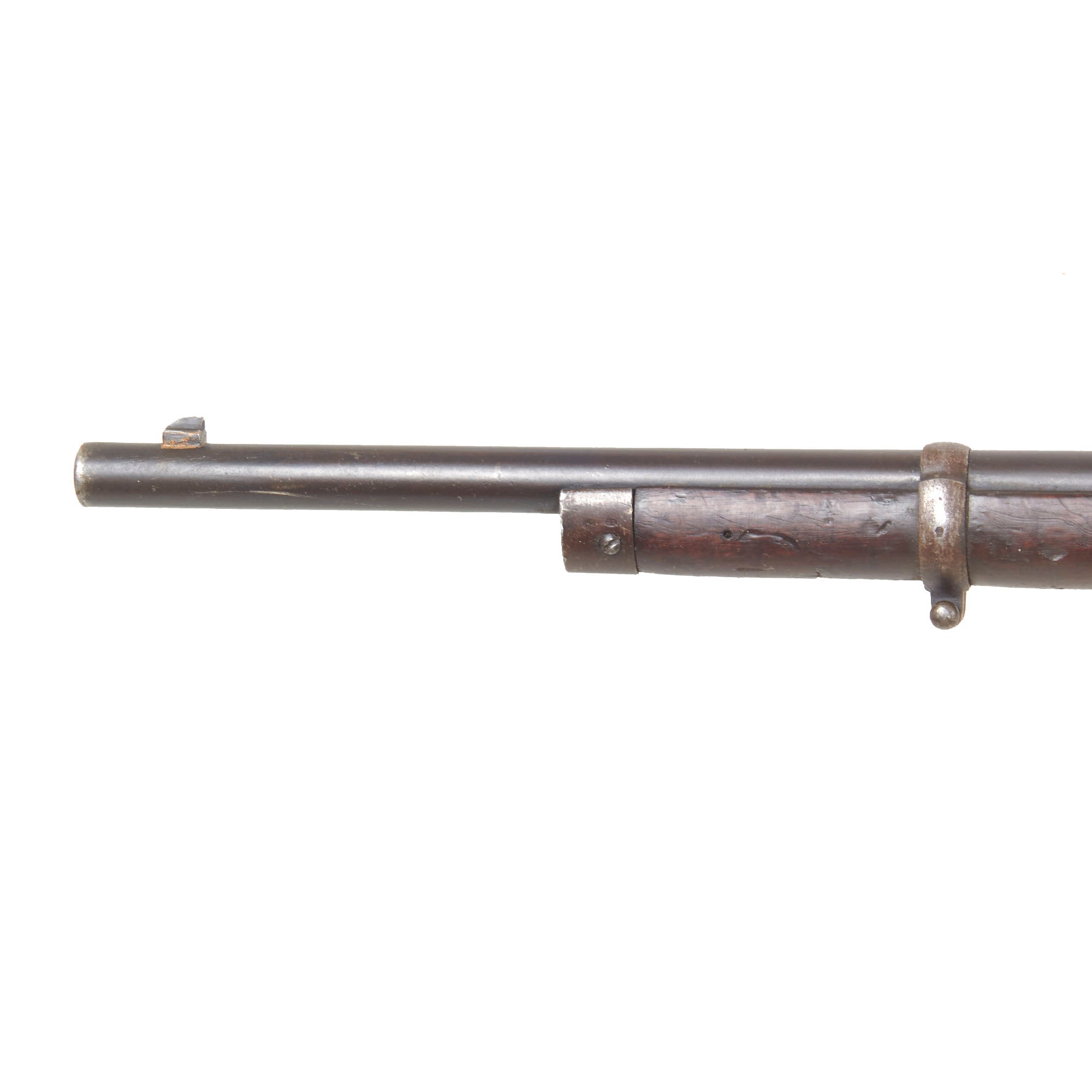 Stock is in very good condition, looking to have been reconditioned at arsenal long ago. It has a great finish with a lovely color, and really looks great. The serial number was definitely overstamped, so it was swapped at arsenal. The original cartouches are unfortunately completely gone. There is no major damage or repairs that we can see, aside from the filled in areas from the second magazine conversion. The original cleaning rod is unfortunately missing.