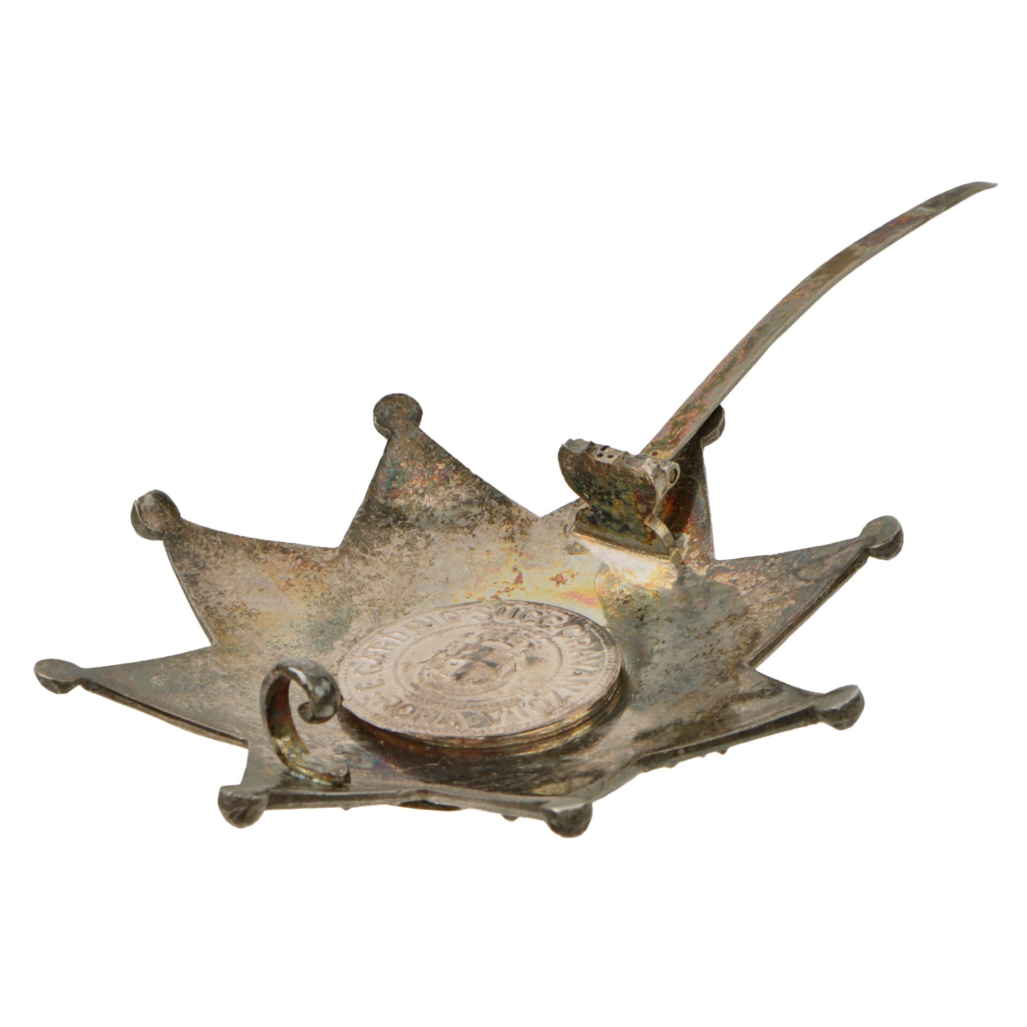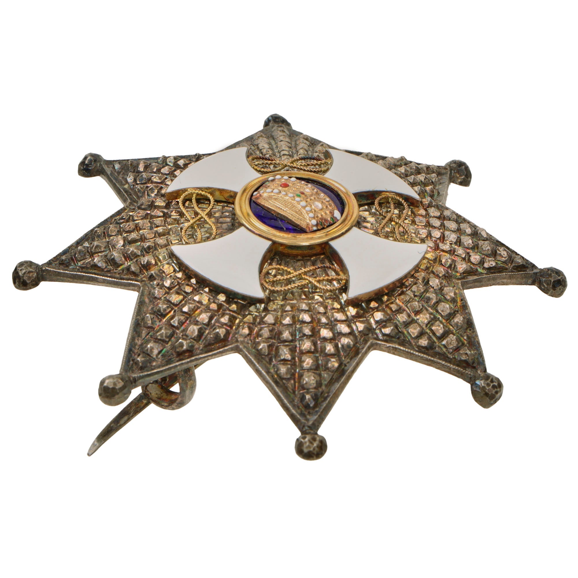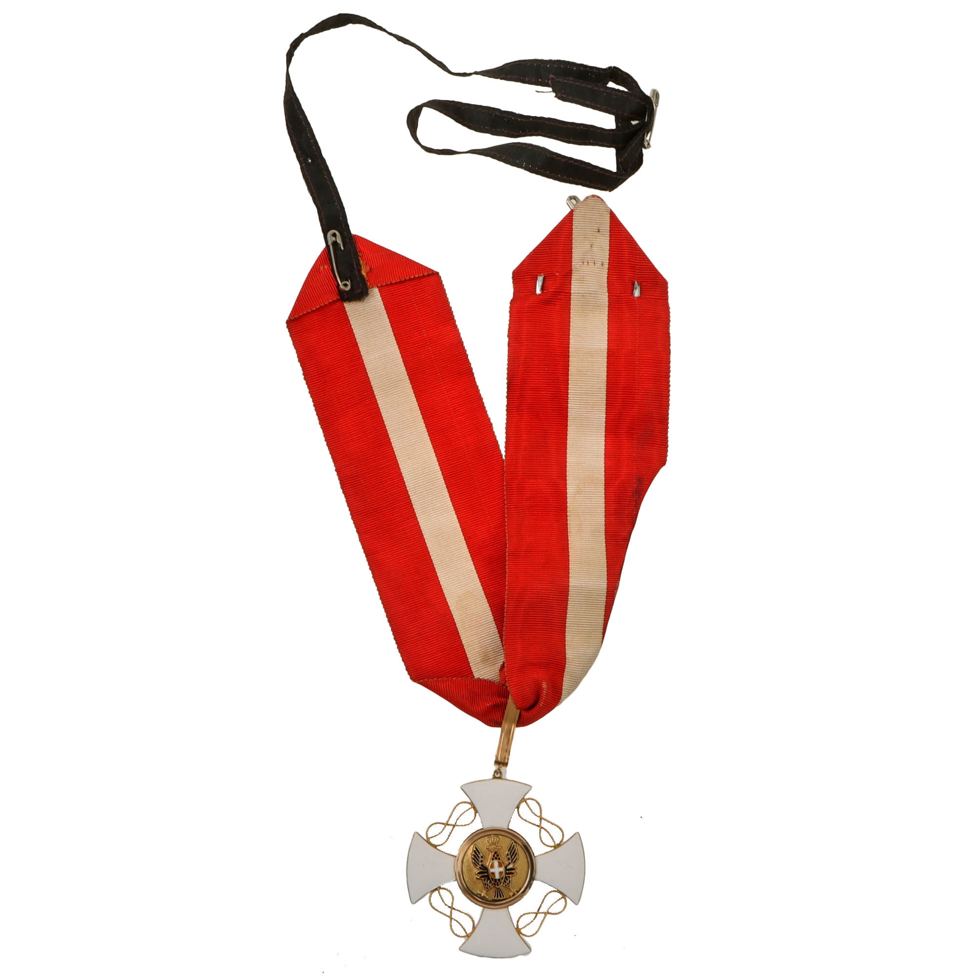 This is an outstanding WWI era issue Order of the Crown of Italy medal set, including the neck order and the star to be worn on the left chest, denoting the Class of Grand Officer. The neck order is in great condition with the ribbon retaining its colors well. The black string which connects around the neck is in good order with some tearing. There is a museum catalog tag on the back of the ribbon, reading 1964.9.4a.