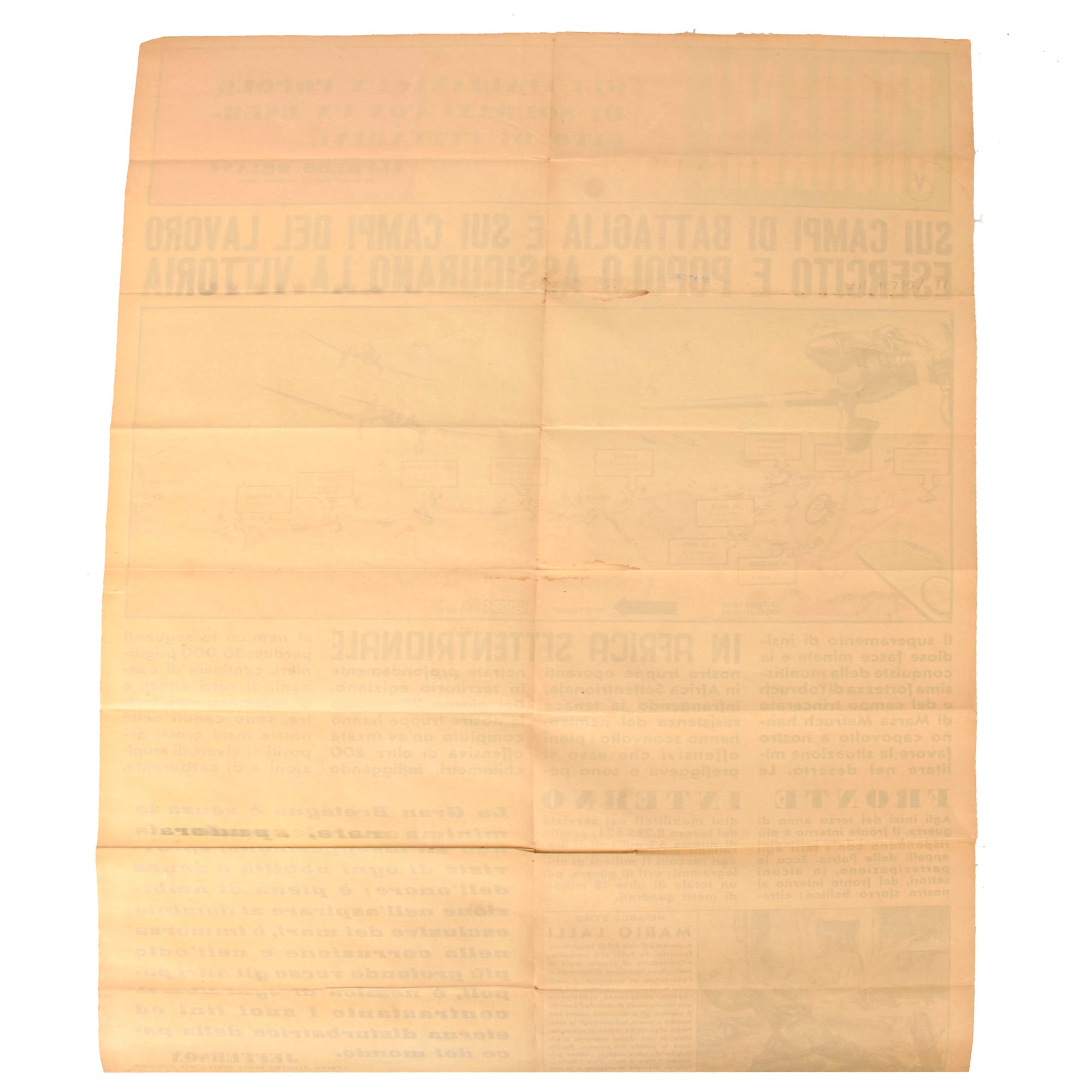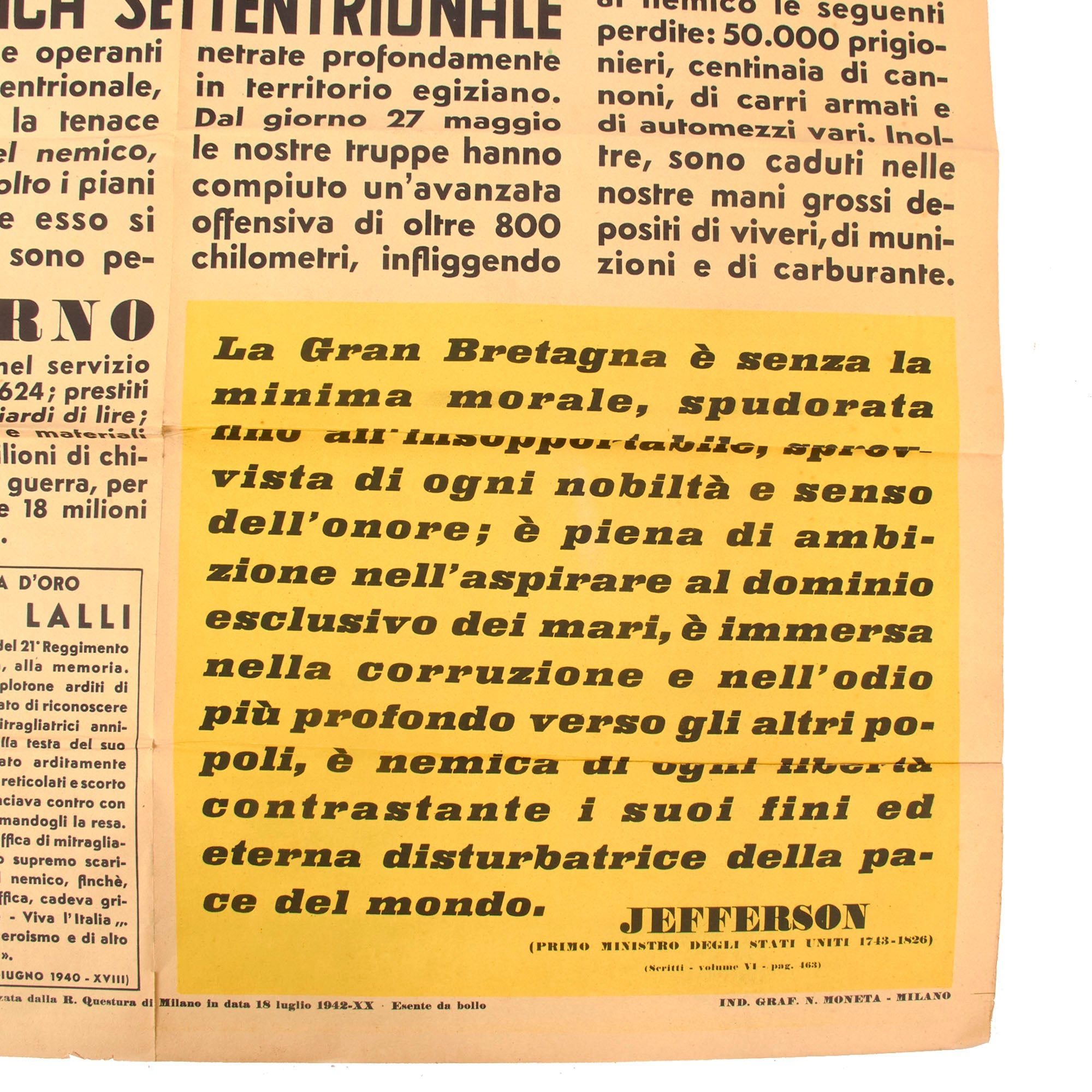 • Original Item. Only One Available. This is a phenomenal Italian “Chronicles” propaganda poster which updates the country on specific parts of the war, including stories and photographs, and a blurb at the bottom about a quote from Thomas Jefferson. The poster is dated July 18th, 1942 and measures 27½ x 39”. The top translates to
