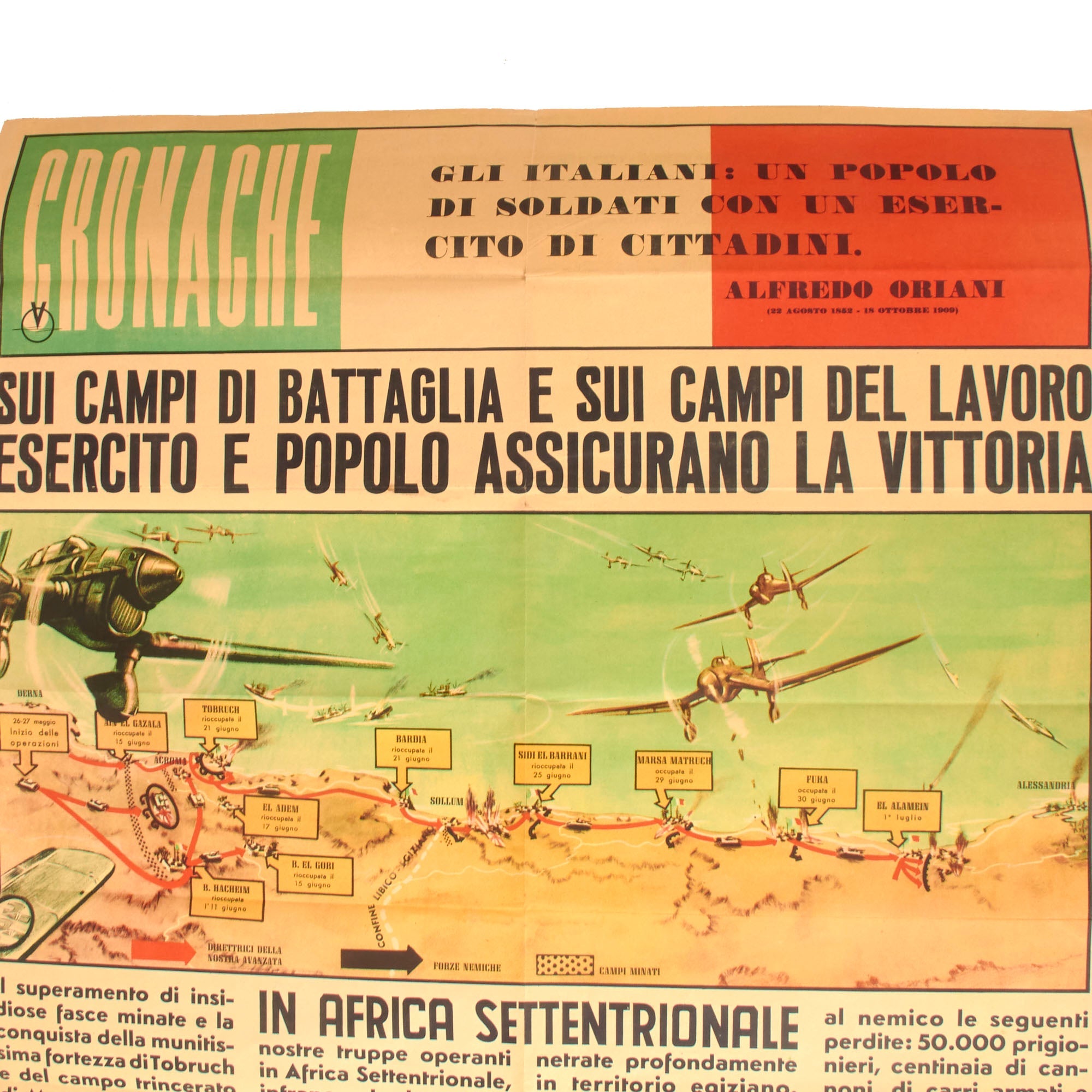 Original Italian WWII 1943 Cronache Chronicles North African Campaign Propaganda Poster - “On the Battlefields and on the Work Fields the Army and the People Ensure Victory” - 28 x 39”