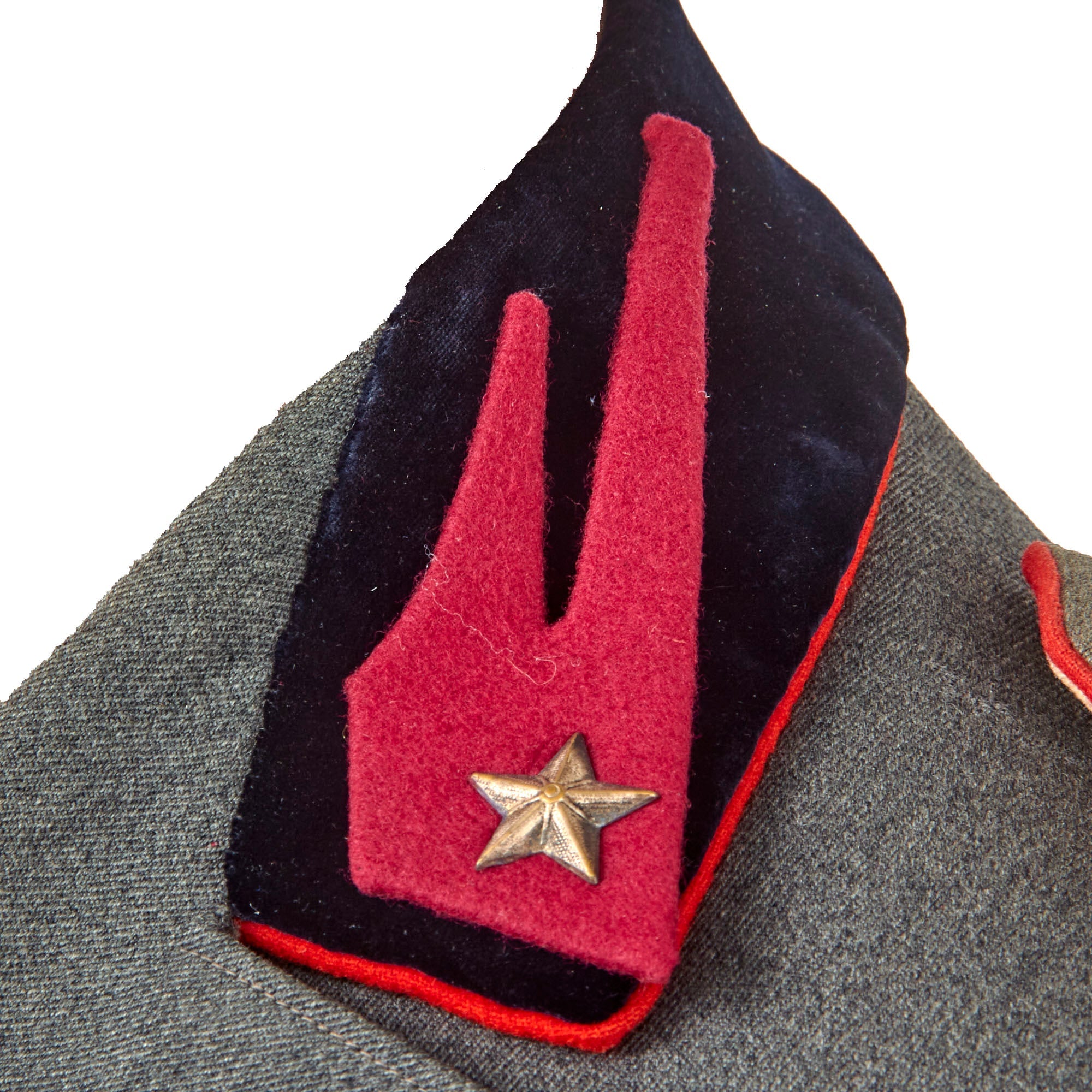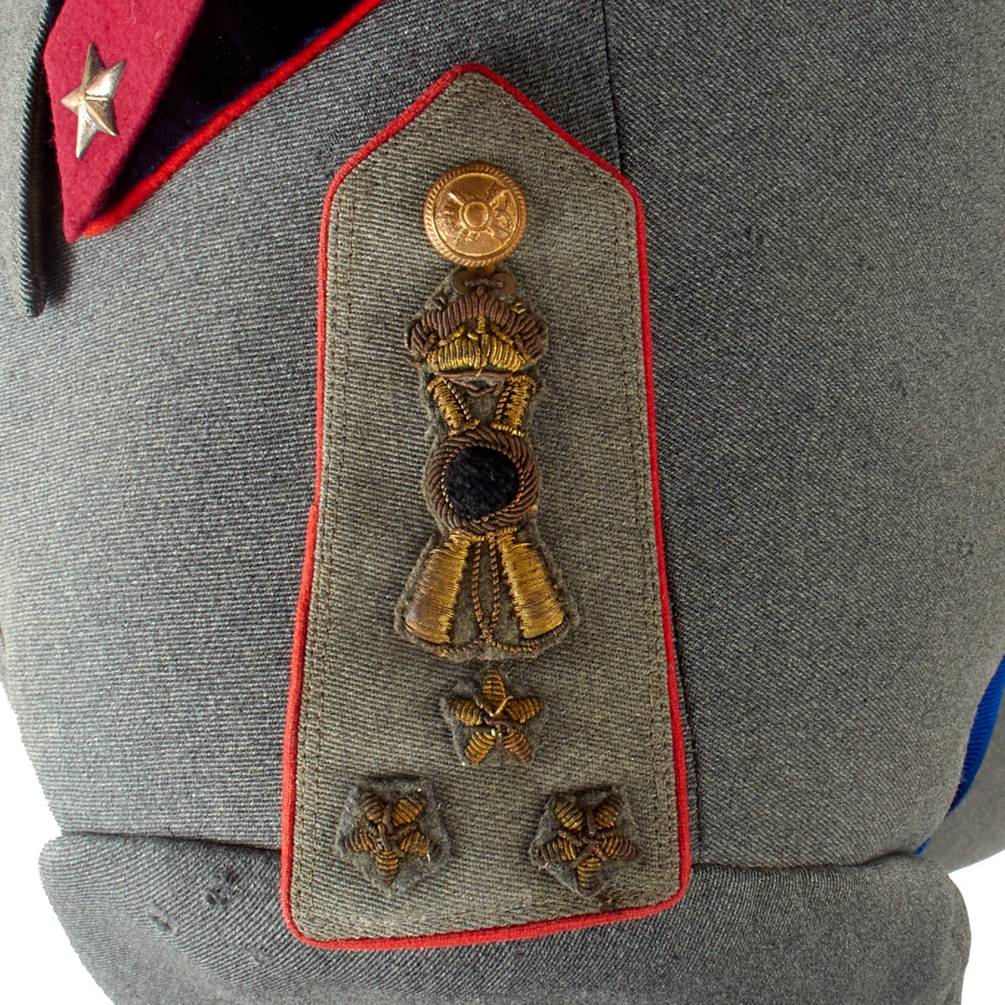 The uniform has two shoulder boards with three stars under the infantry insignia over a crown, denoting a Capitano of Infantry. The collar has a lovely velvet black base with attached red unassigned infantry gorget patches which are loose and not sewn-in. This uniform has certainly had some modern work done to it. There is red piping on the shoulder boards and the cuffs, denoting infantry.