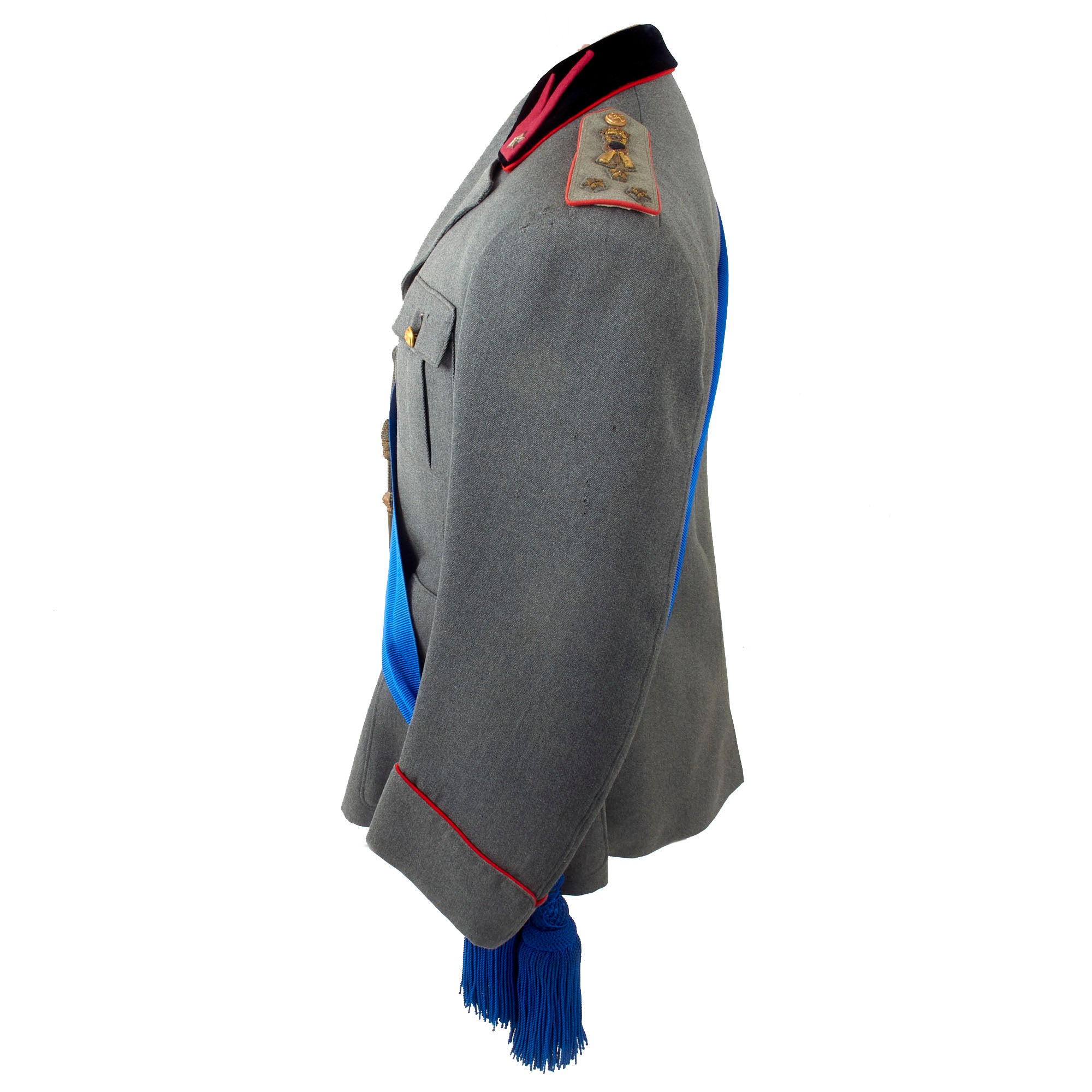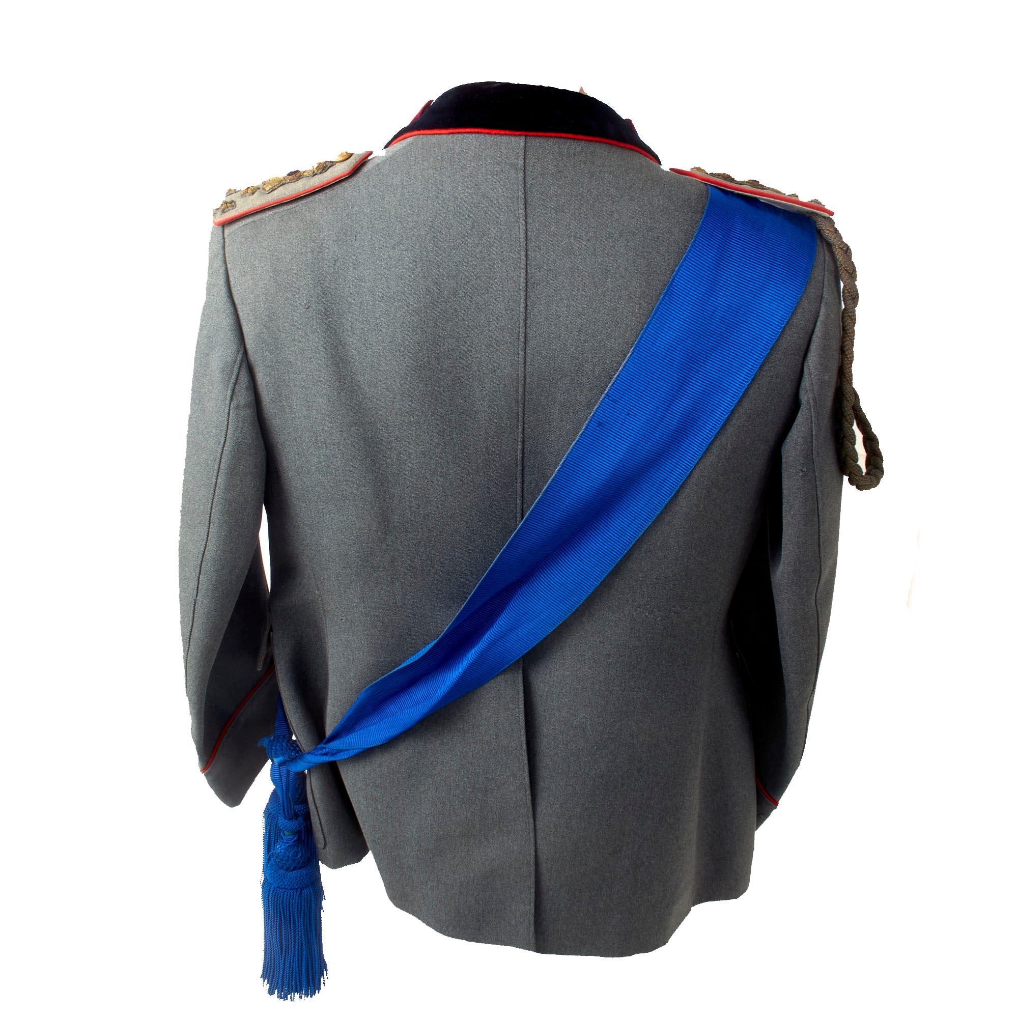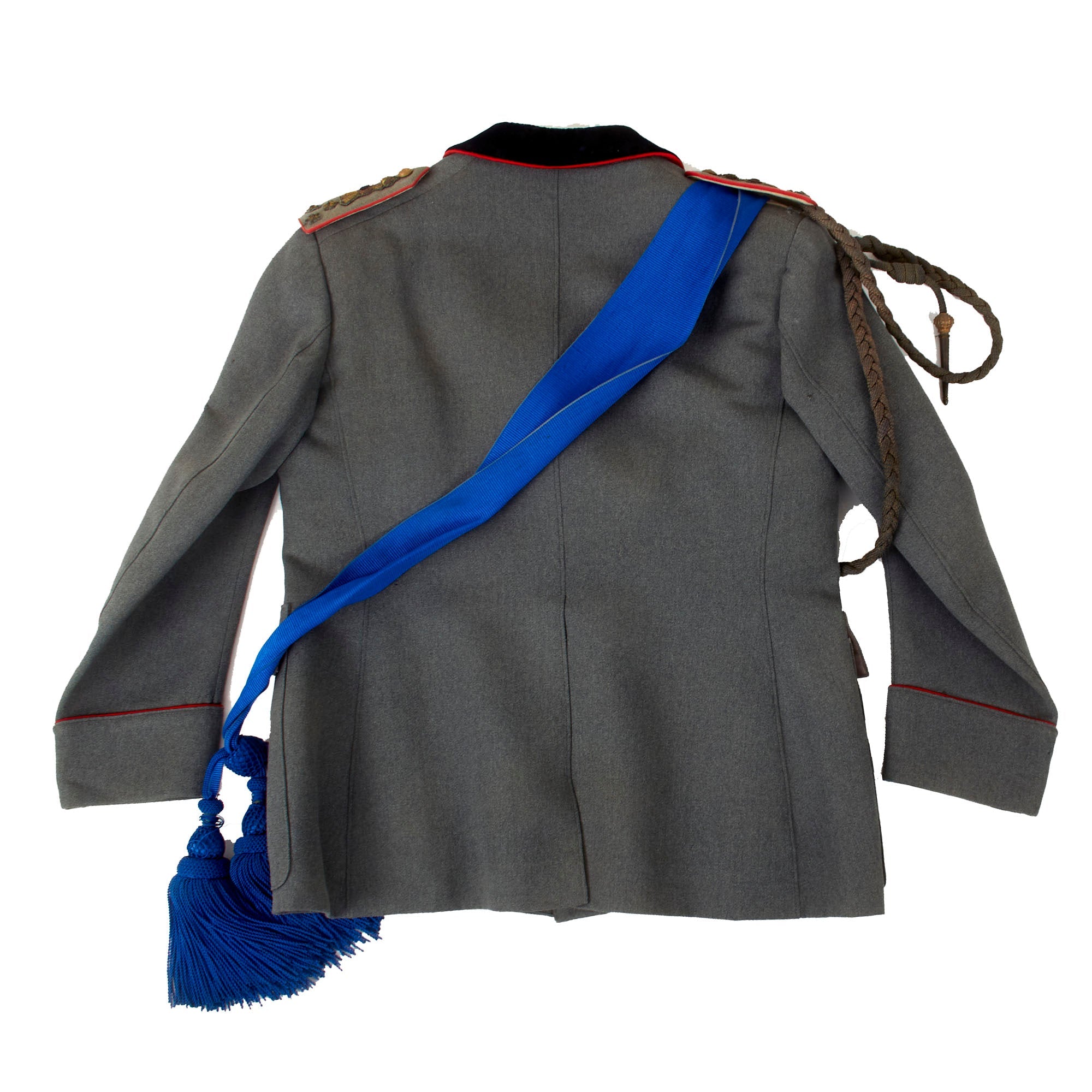 Attached to the right shoulder is a period Italian officer’s Aiguillette, meant for ceremonial use. There is some damage including breakage of the smaller straps which allow it to be properly applied to the uniform. Also attached at the right shoulder is a long blue sash with large knots with tassels at the end. We are unsure of the purpose of this sash, and it could use more research.