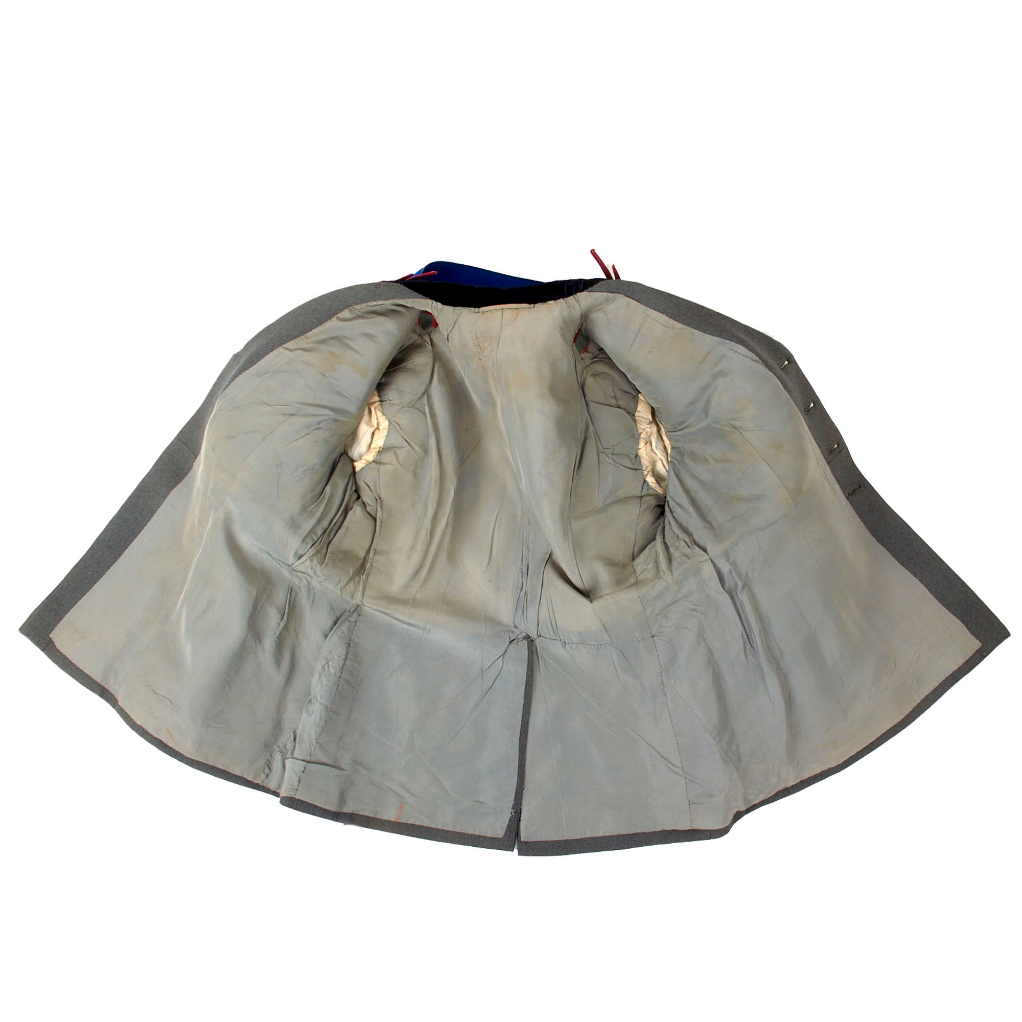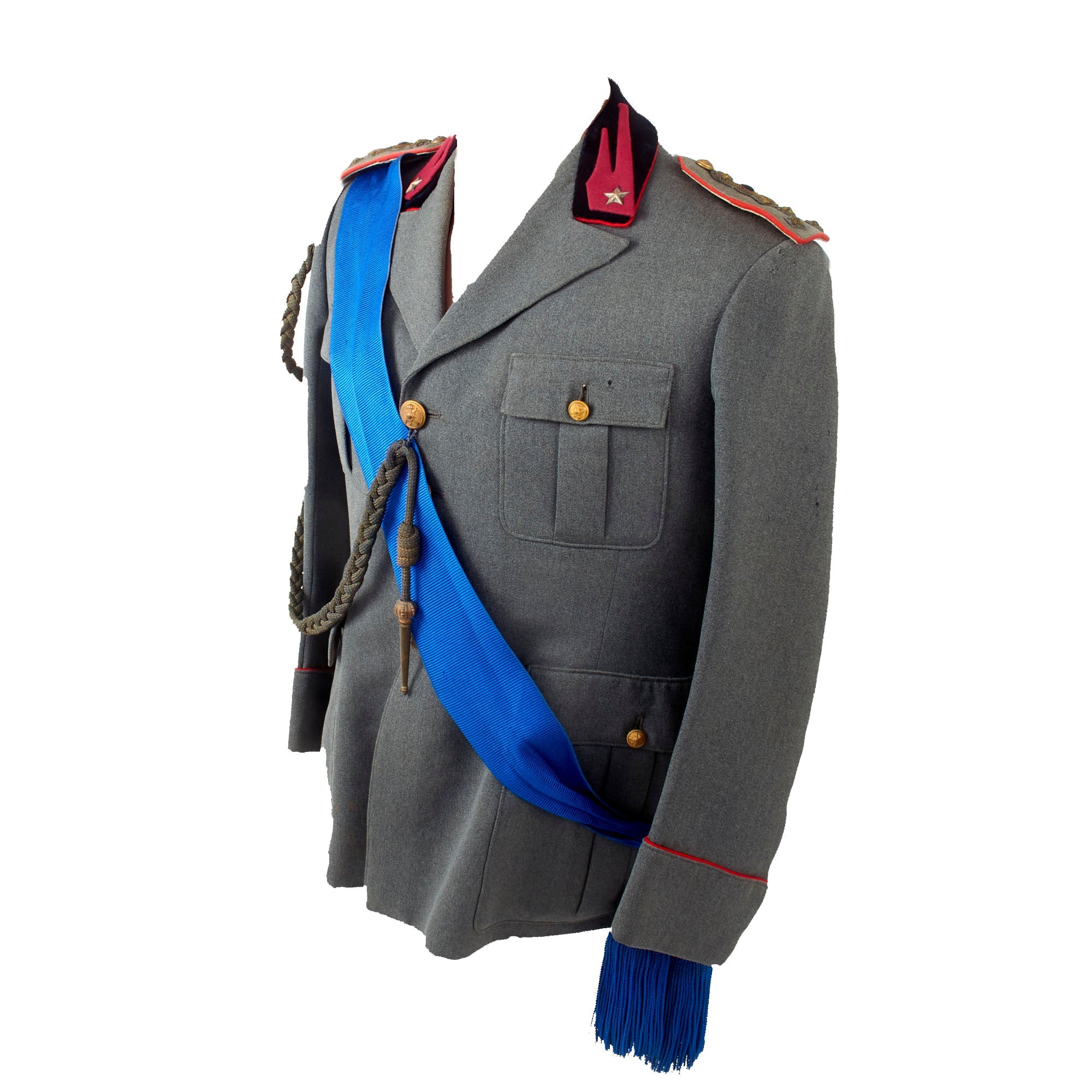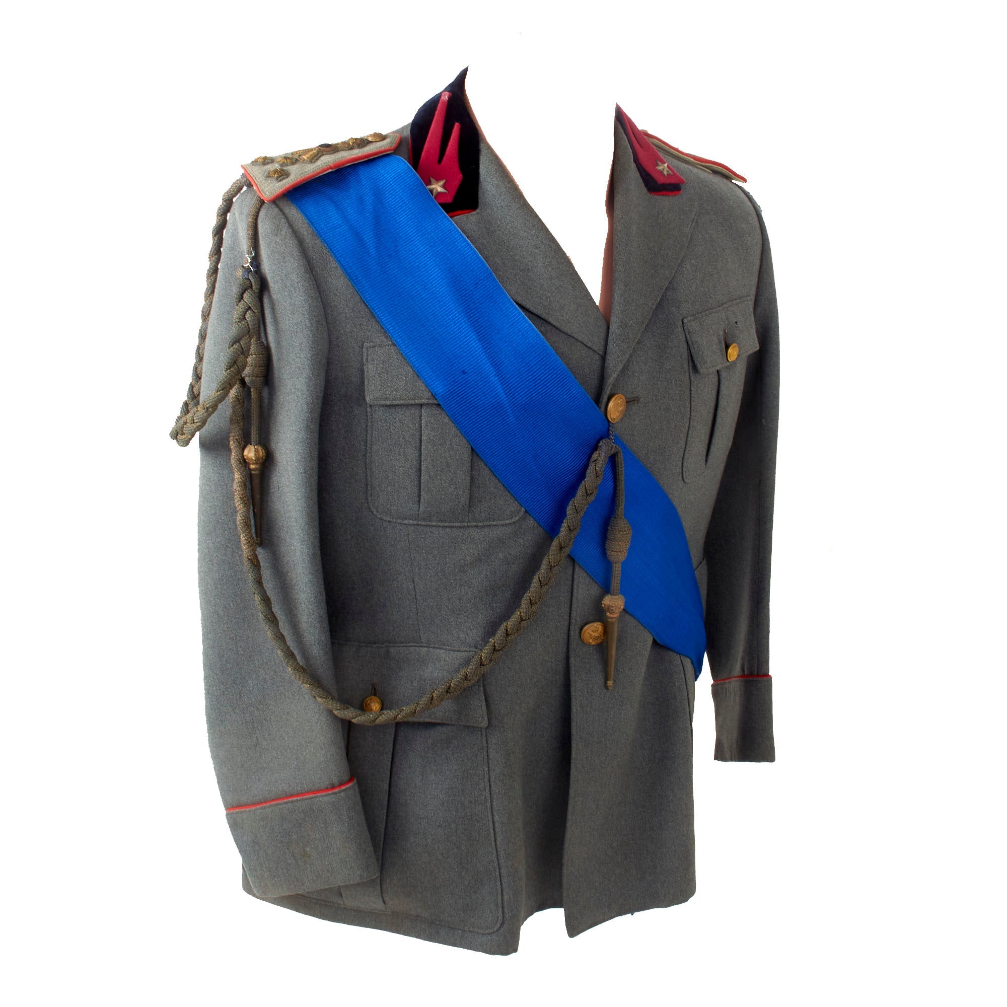 Attached to the right shoulder is a period Italian officer’s Aiguillette, meant for ceremonial use. There is some damage including breakage of the smaller straps which allow it to be properly applied to the uniform. Also attached at the right shoulder is a long blue sash with large knots with tassels at the end. We are unsure of the purpose of this sash, and it could use more research.