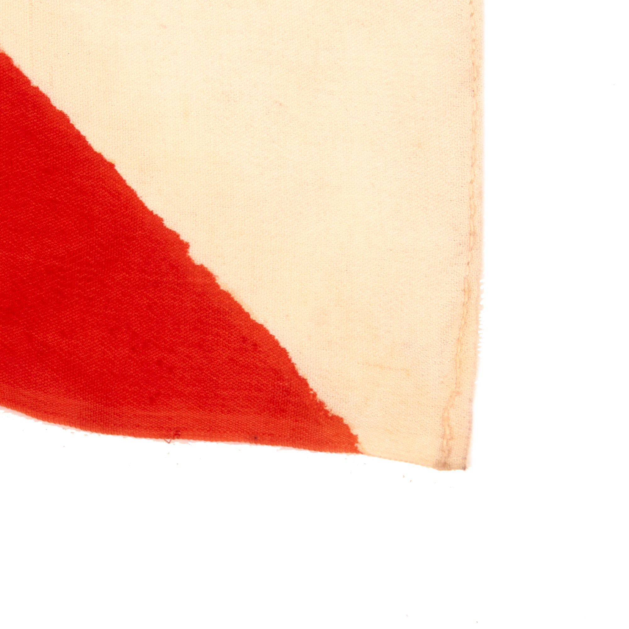 This is a fantastic one piece rising sun flag and is made of rayon. It is in very good condition with the color very well-retained, with a dyed red "Sun" in the middle, with rays going out to the edge of the flag. It retains both of its original corner reinforcements which are still strong, and they still retain their tie strings. The flag measures roughly 28 x 33”.