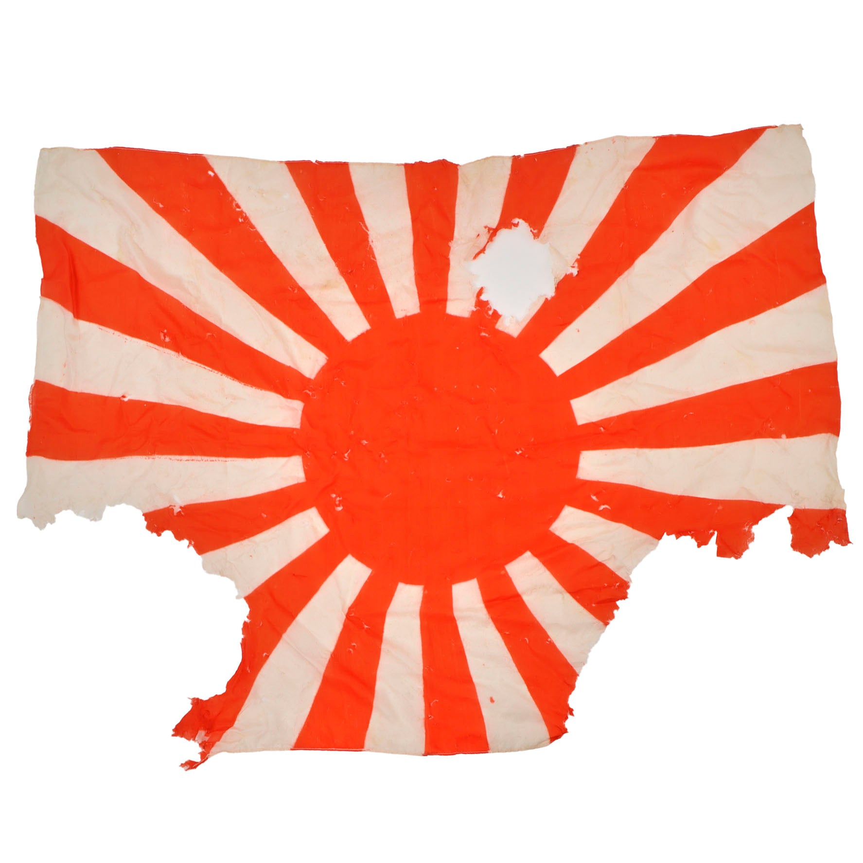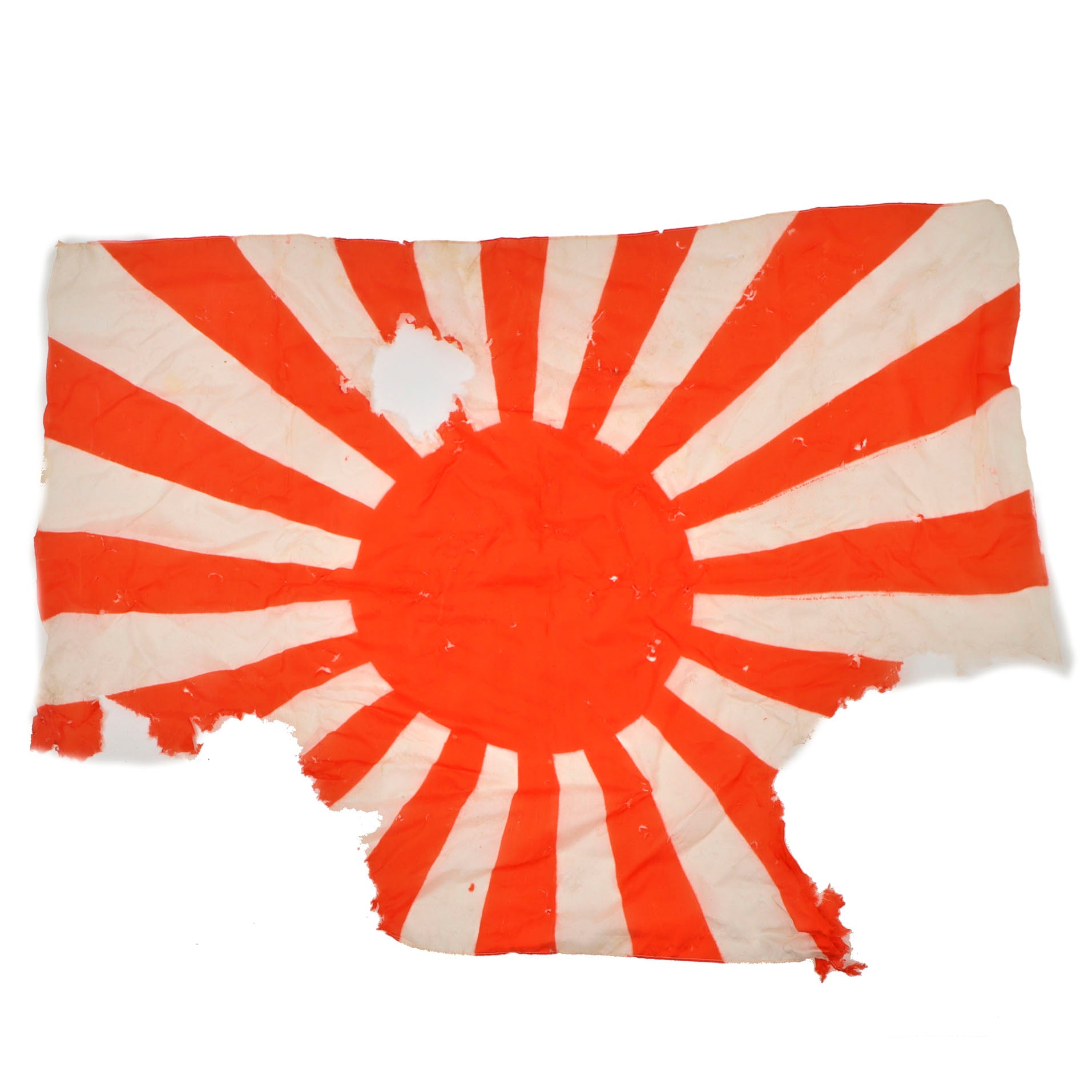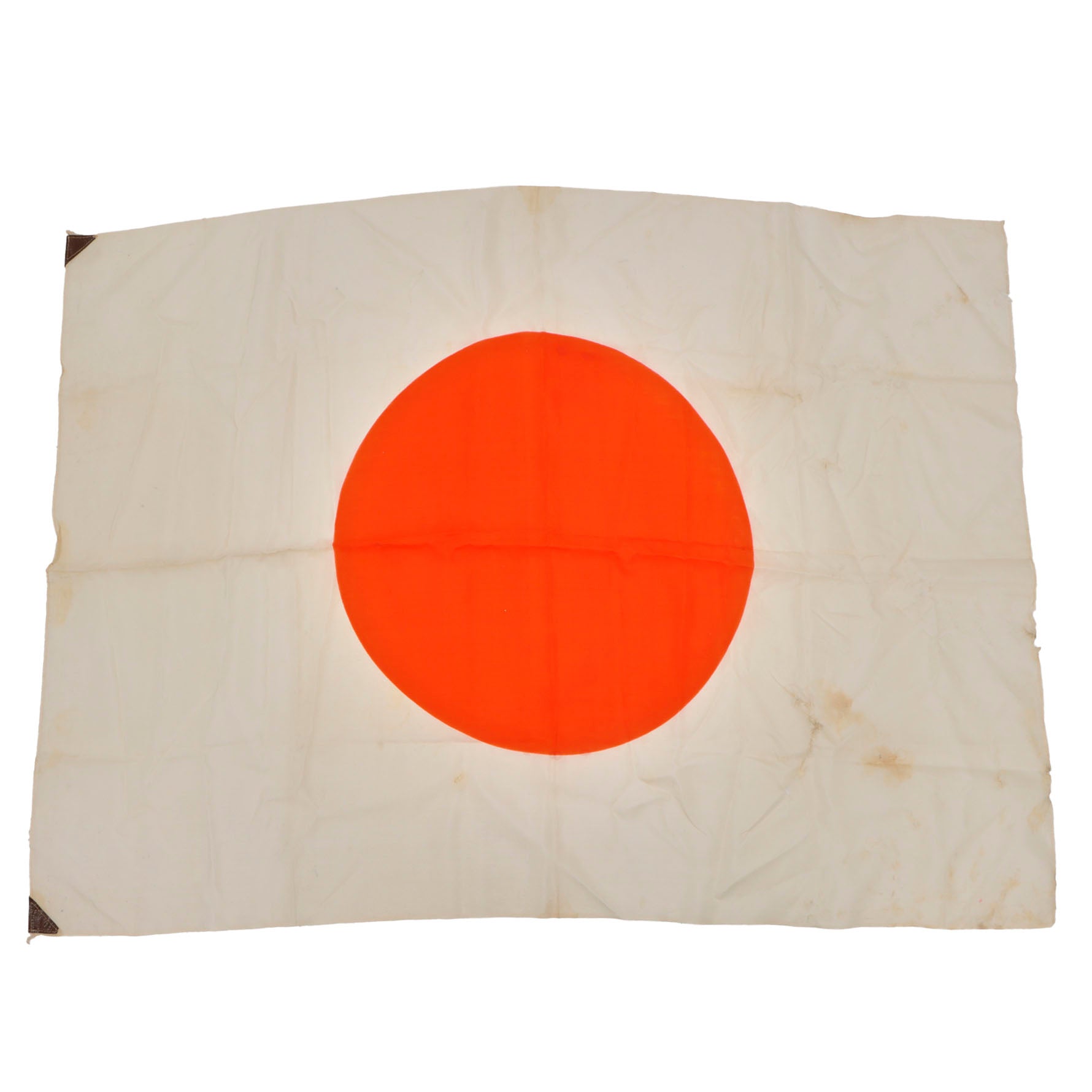 Original Item: Only One Available. This is a great lot of two Japanese flags from the WWII era. The national flag of Japan is a rectangular white banner bearing a crimson-red circle at its center. This flag is officially called the Nisshōki (日章旗, 'flag of sun'), but is more commonly known in Japan as the Hinomaru (日の丸, 'circle of the sun'). It embodies the country's sobriquet: the Land of the Rising Sun.