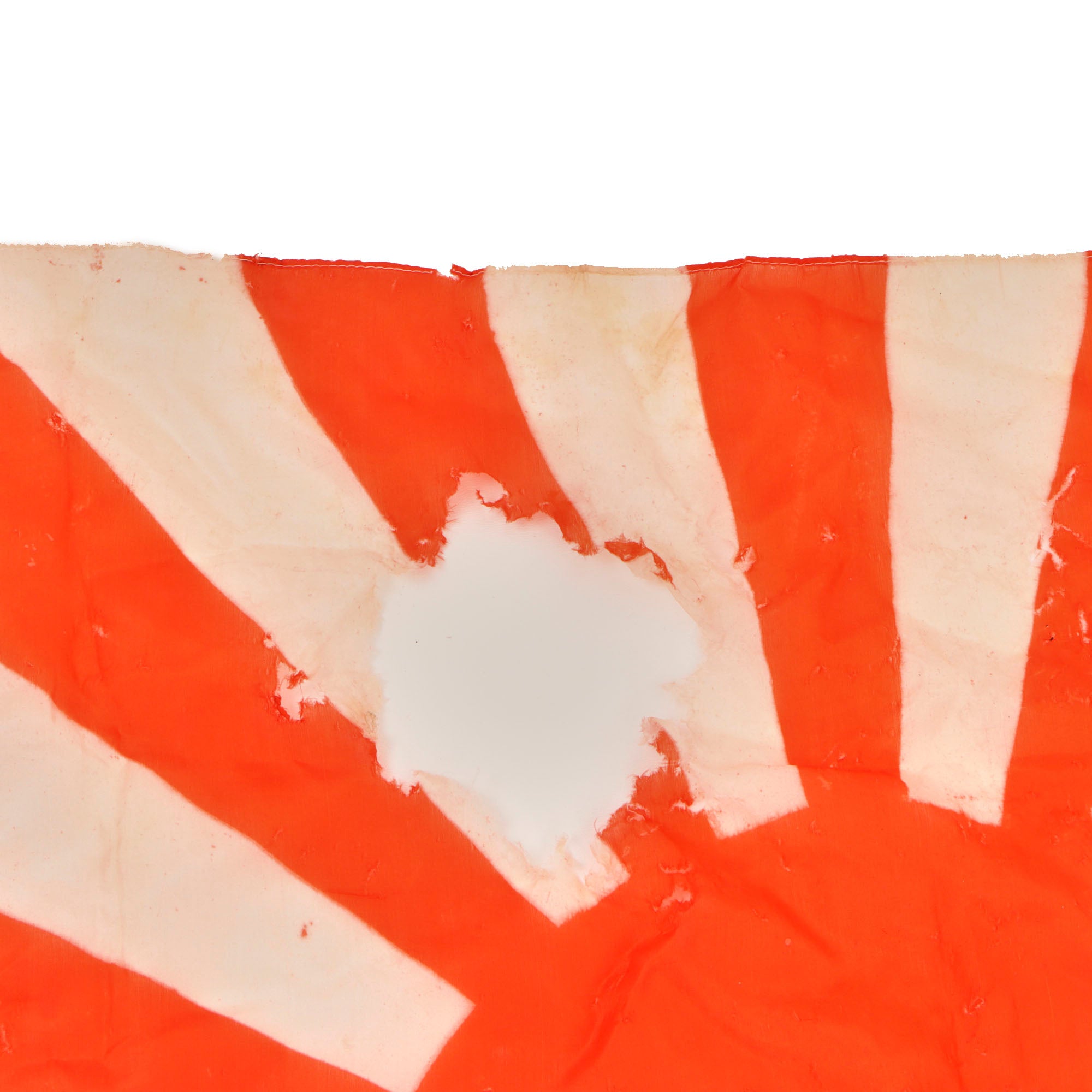 The first flag is a Rising Sun flag, which measures 26 x 35” but is extremely tattered with two large chunks missing at two corners, and more missing in other spots. This one was likely a battlefield pickup.