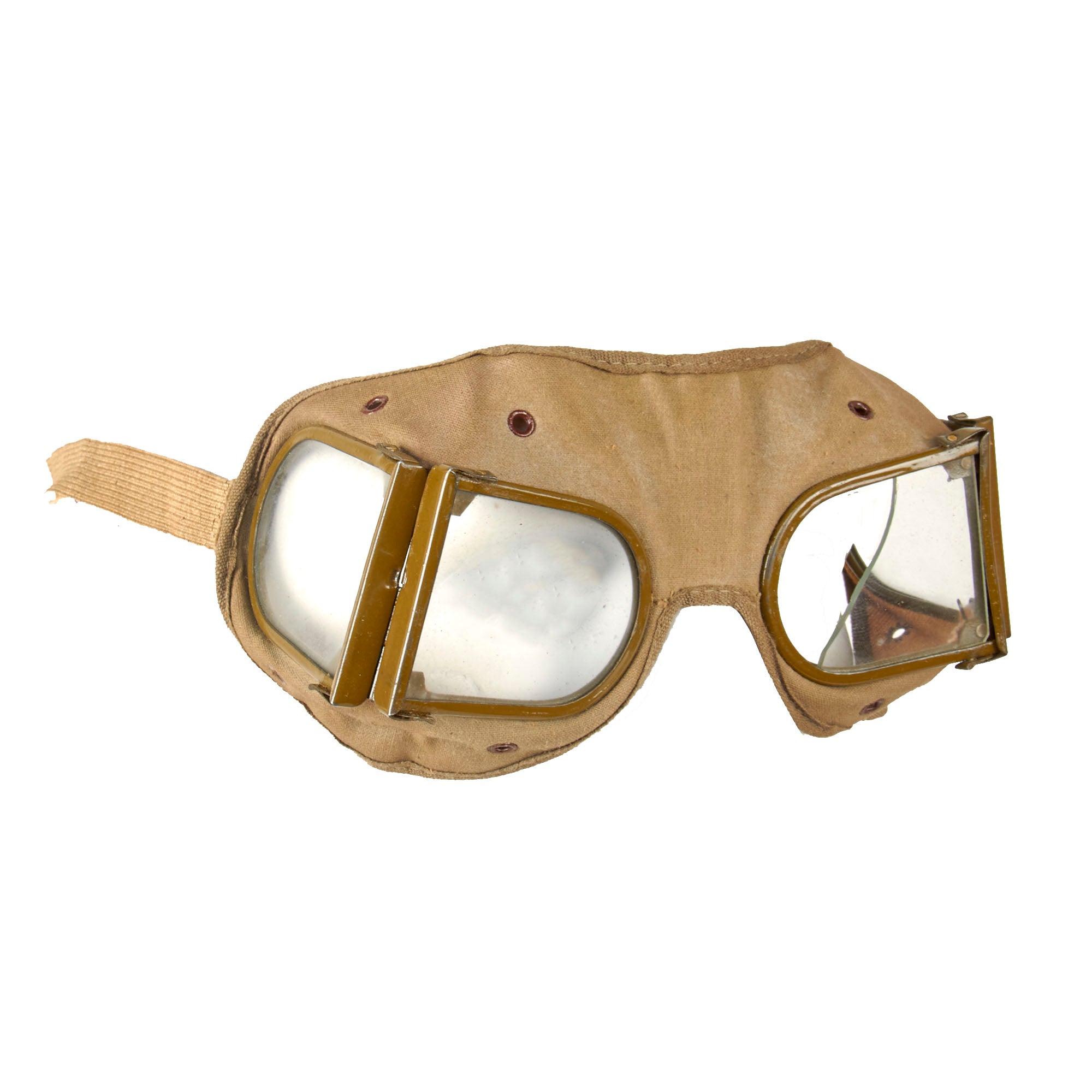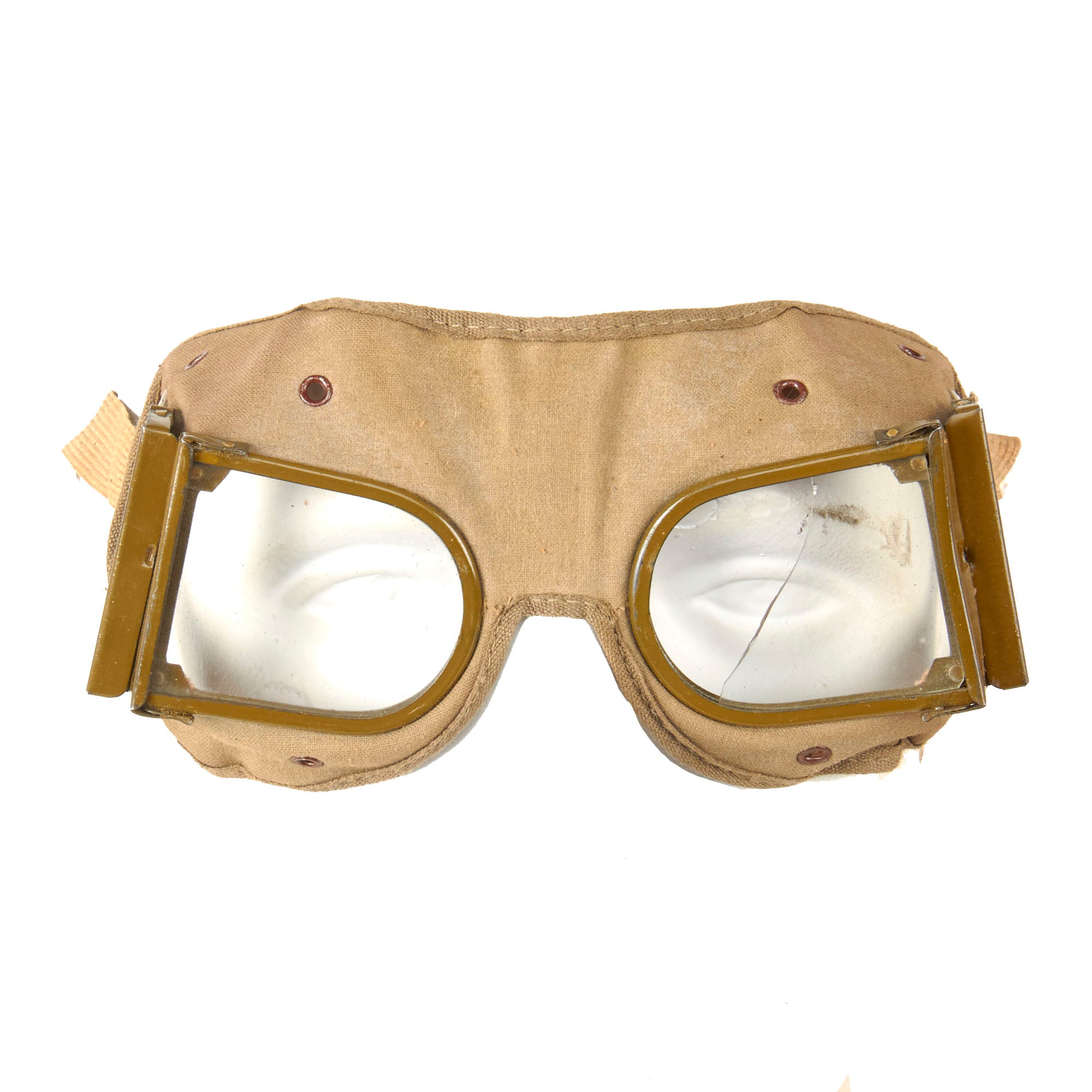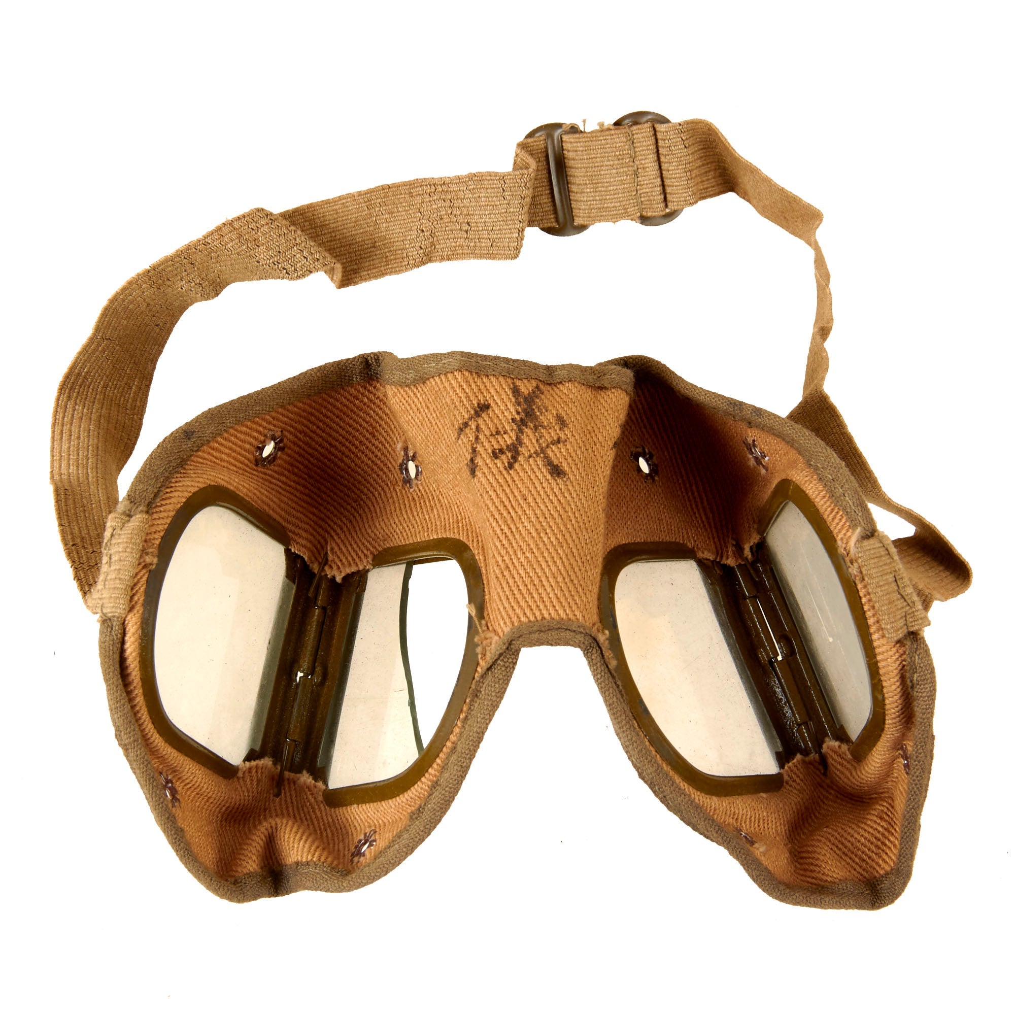Original Item: Only One Available. This is a good condition rare set of Japanese WWII tanker's folding goggles - with front and side lenses. Featuring metal frames on an olive drab cloth body and an elasticized band. The goggles are in fair shape but one of the lenses is broken, missing about half of its glass. Otherwise the set is outstanding. Comes complete with original brown leather carrying case with belt loop on reverse. There are Kanji markings on the interior flap.