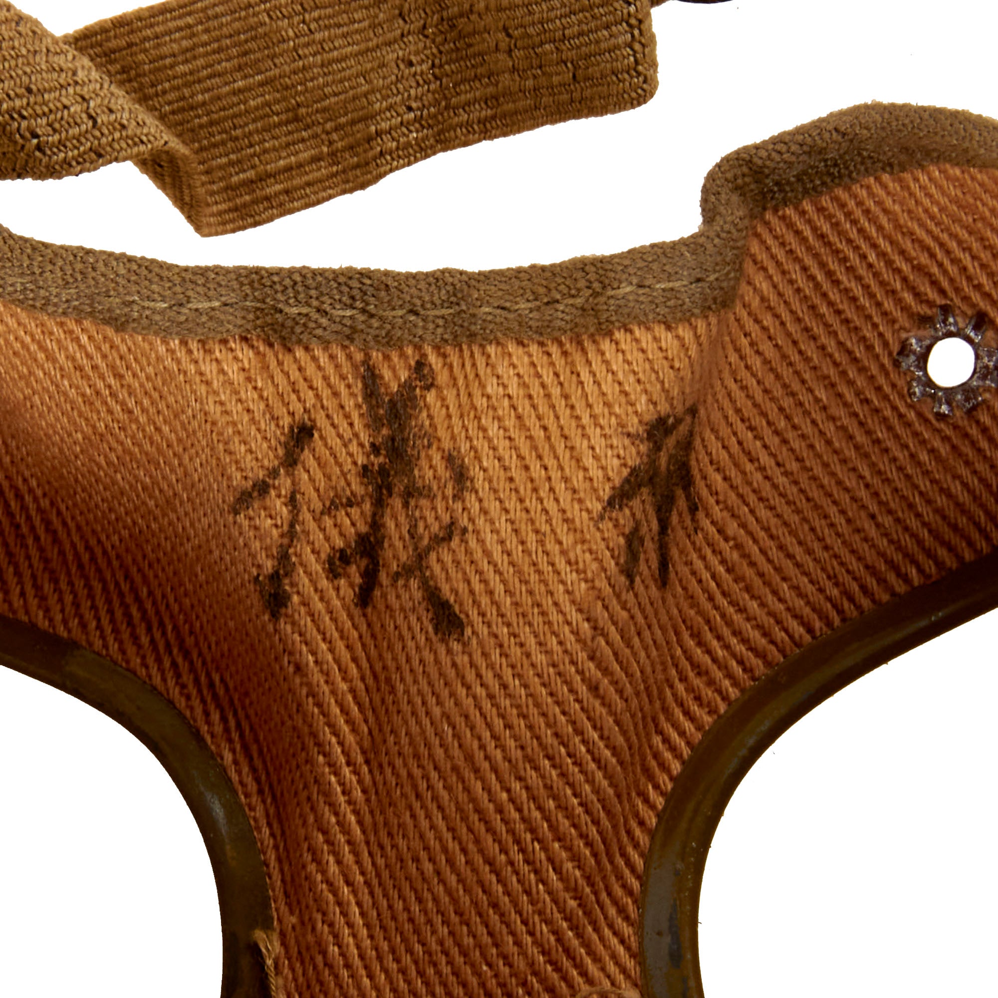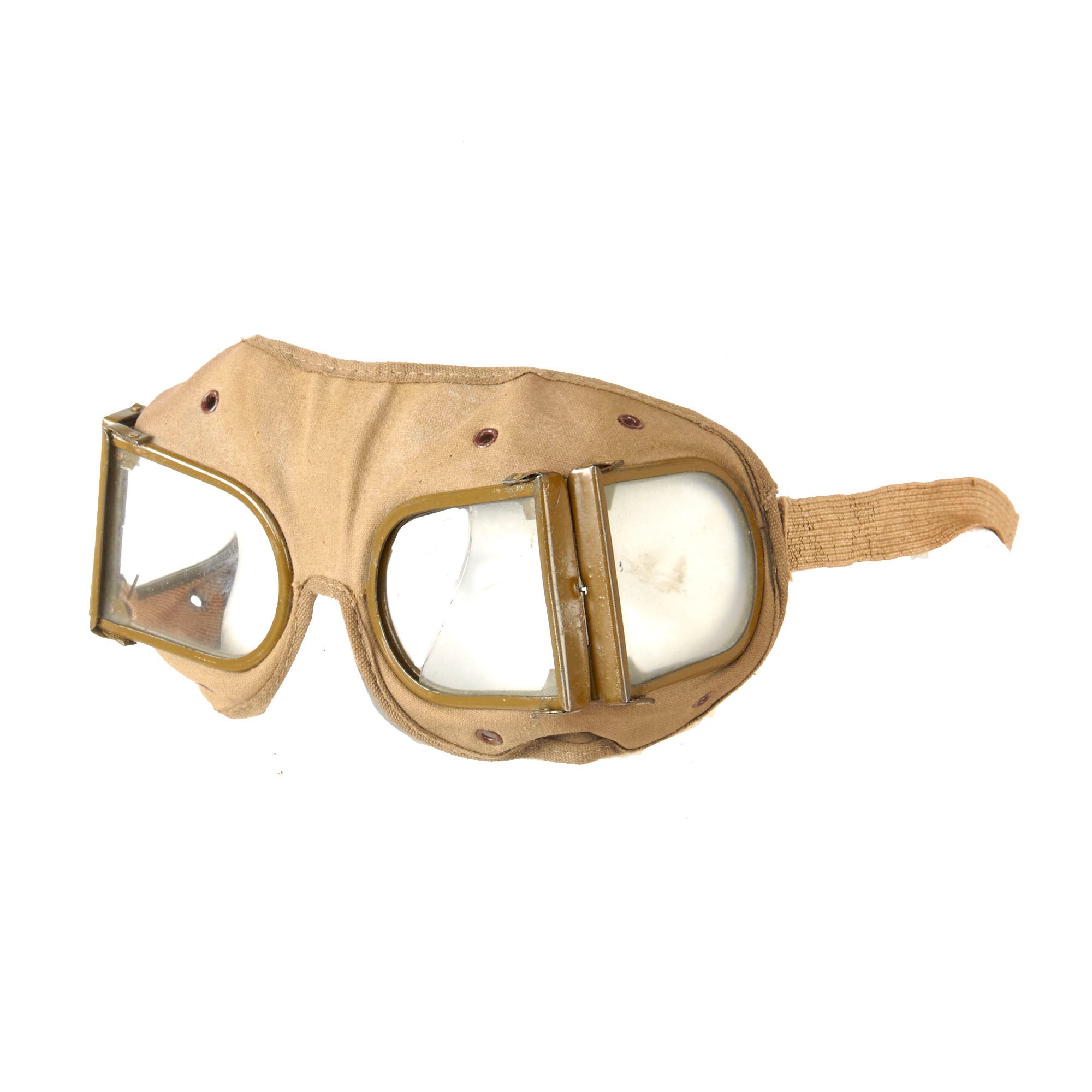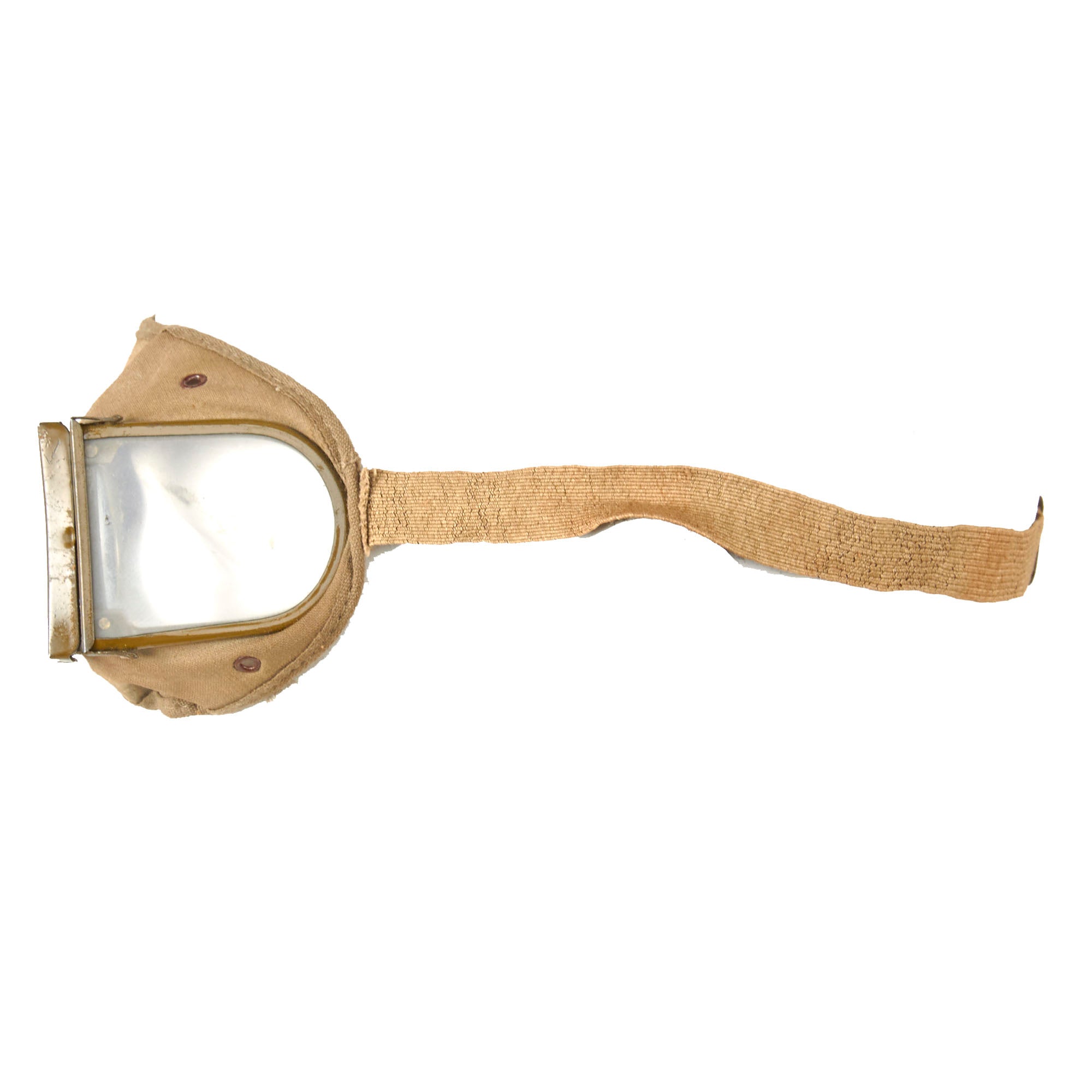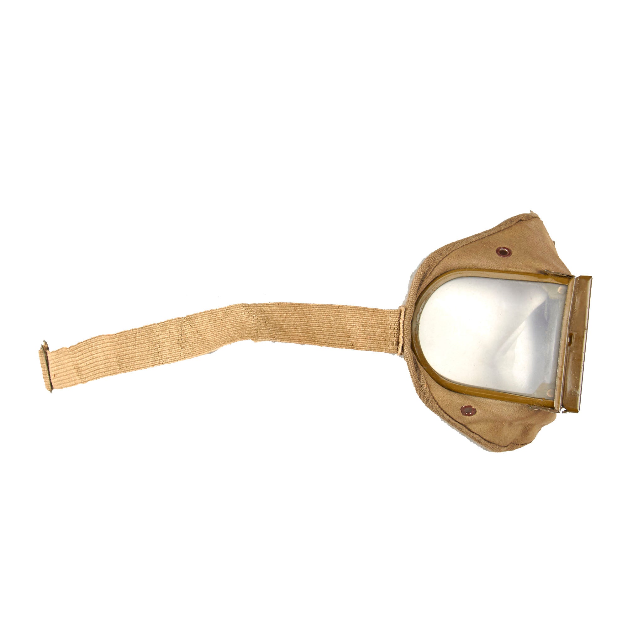 Original Item: Only One Available. This is a good condition rare set of Japanese WWII tanker's folding goggles - with front and side lenses. Featuring metal frames on an olive drab cloth body and an elasticized band. The goggles are in fair shape but one of the lenses is broken, missing about half of its glass. Otherwise the set is outstanding. Comes complete with original brown leather carrying case with belt loop on reverse. There are Kanji markings on the interior flap.
