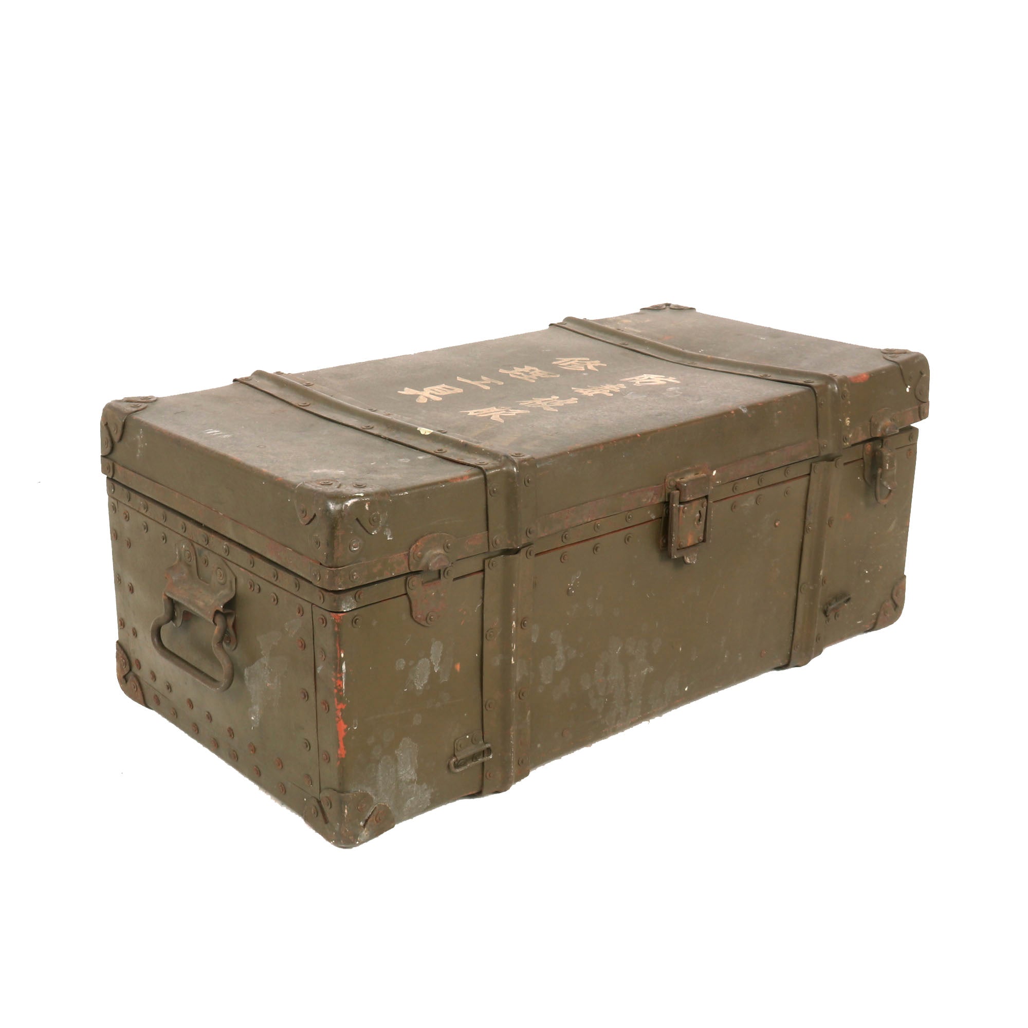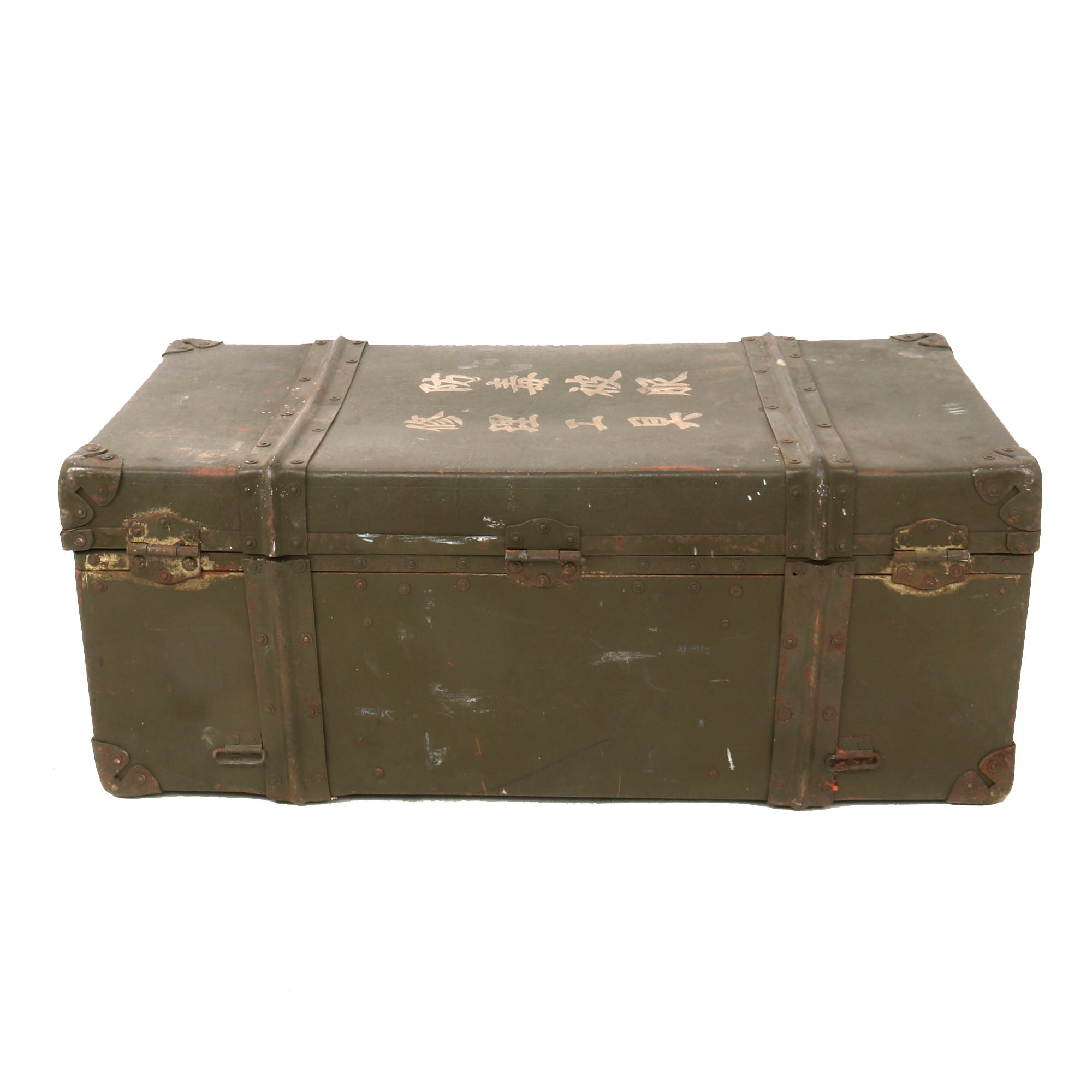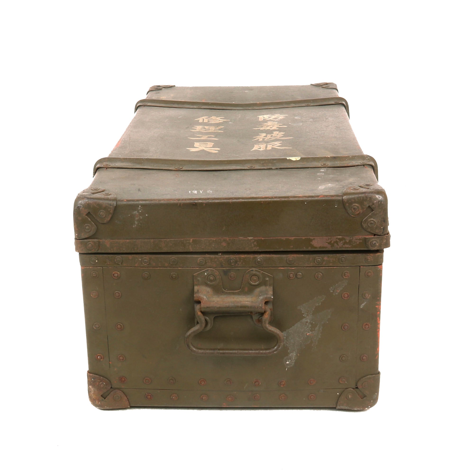 Original Item. Only One Available. This is a very interesting Japanese trunk which is well-inscribed on the lid, reading Gas-Proof Clothing / Repair Tools, indicating that it originally stored chemical protection clothing & repair tools for said clothing. Given the construction of the trunk, we believe this to be for use by civilians in a bombing raid-vulnerable area.