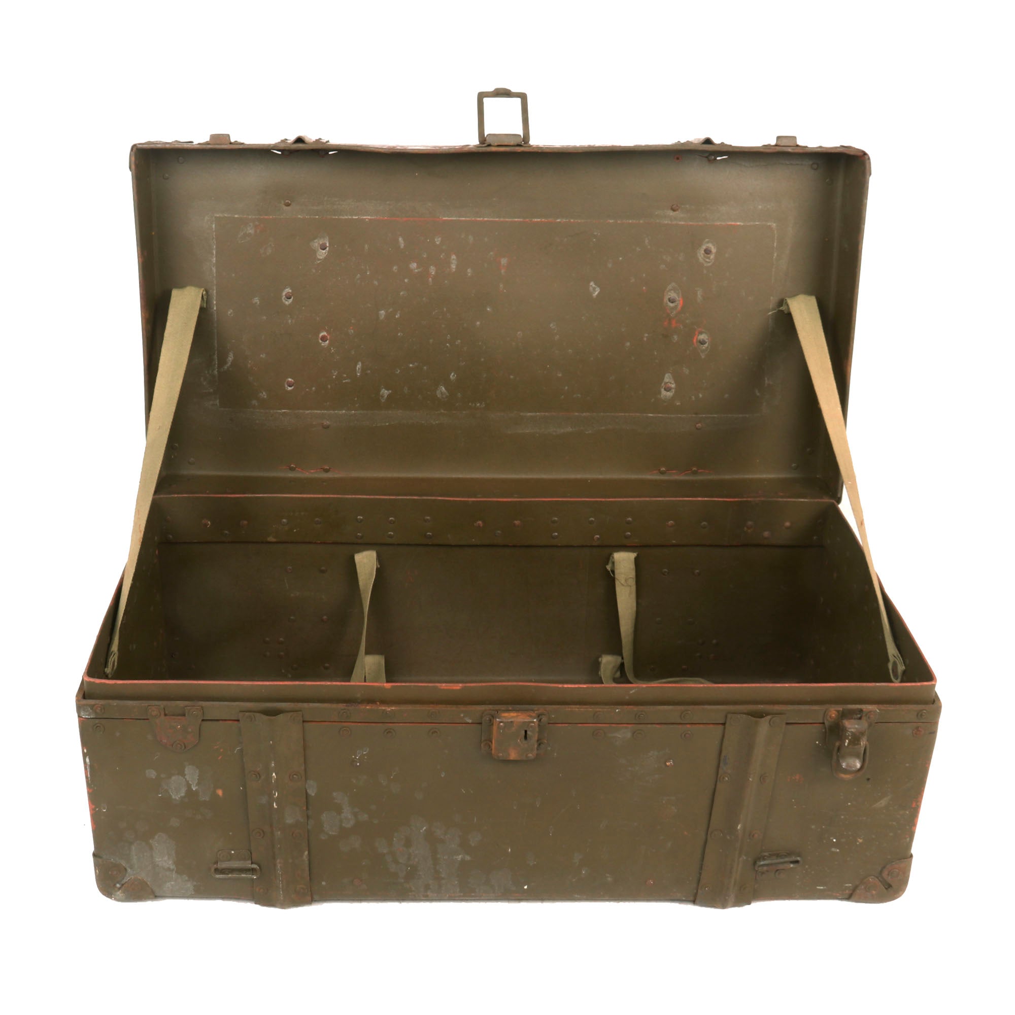The trunk measures roughly 27 x 14 x 11” and is in fair condition overall, with some breakage at the bottom and in spots on the lid. One of the two latches that secure the trunk is gone. There are straps attached to the interior, the purpose of which we are unsure. Both of the metal carrying handles to the sides of the trunk are intact.