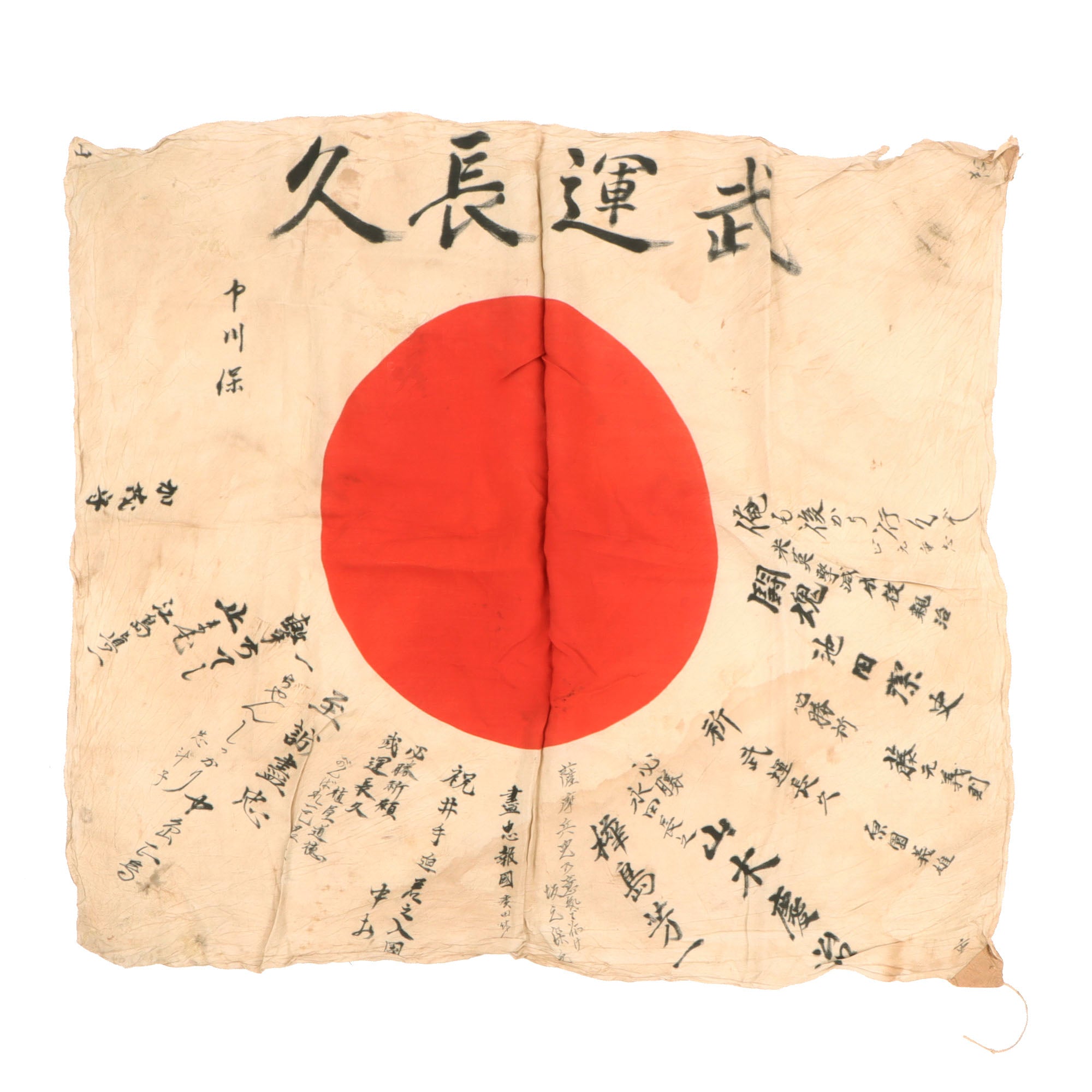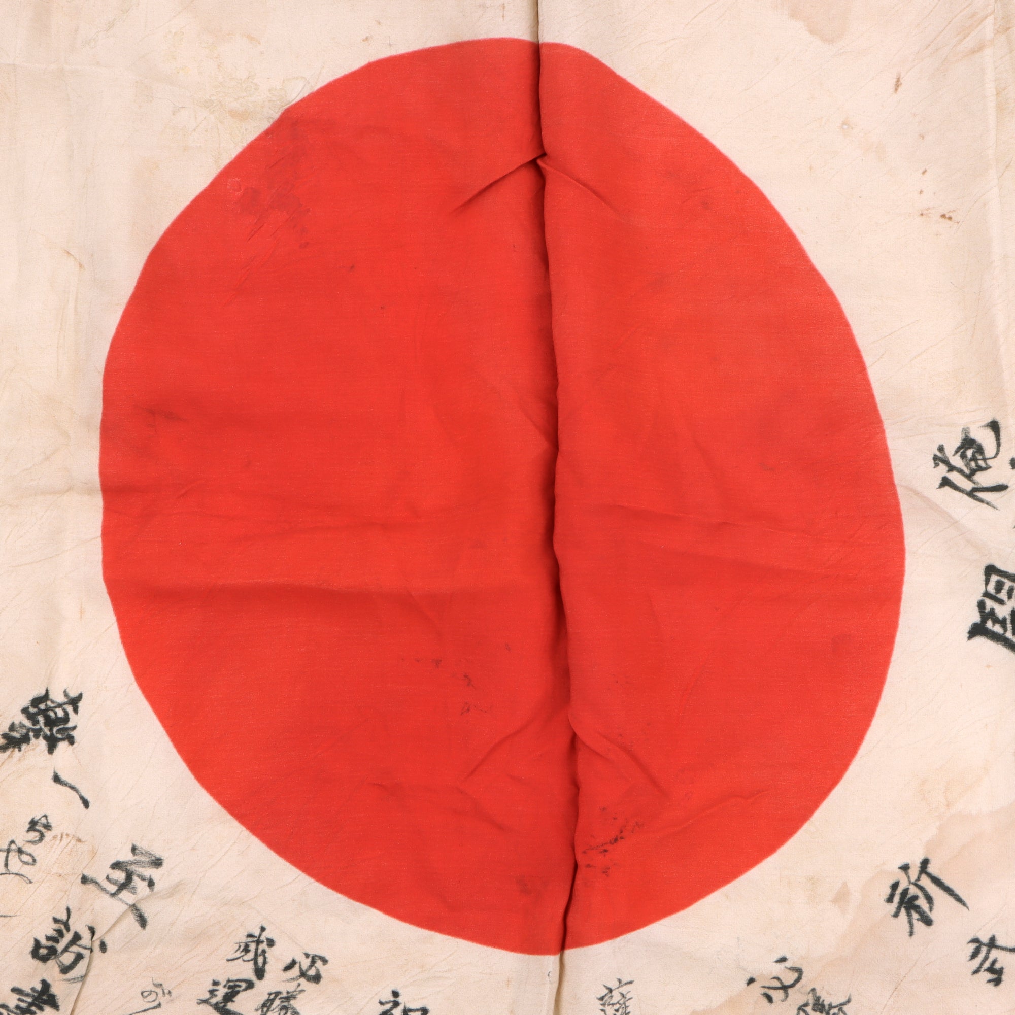 The Japanese call their country's flag hinomaru, which translates literally to "sun-round", referencing the red circle on a white field. When the hinomaru was signed, the Japanese characters were usually written vertically, and radiated outward from the edge of the red circle. This practice is referenced in the second term, yosegaki, meaning "sideways-writing". The phrase hinomaru-yosegaki can be interpreted as "To write sideways around the red sun", describing the appearance of the signed flag. This particular example completely unique is written in old KANJI the writing are mainly Japanese names of this soldier's family and friends with quotes and phrases.
