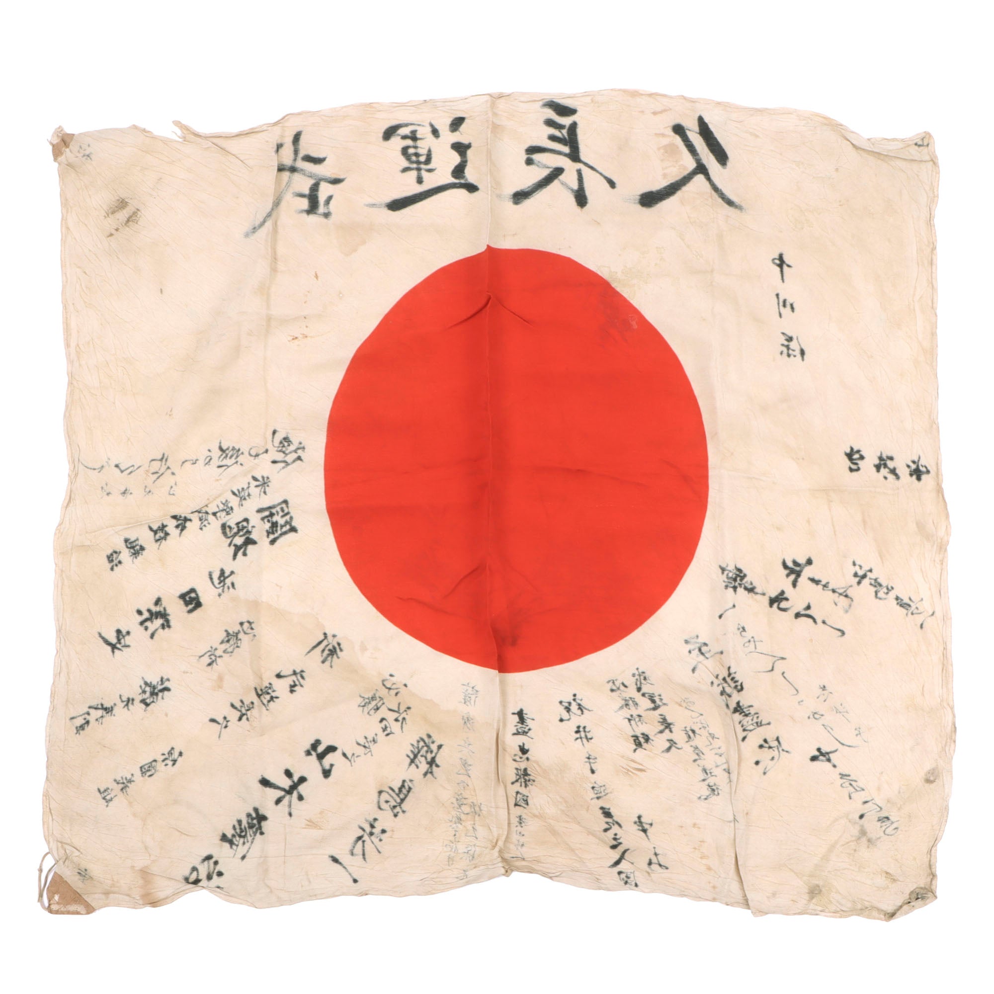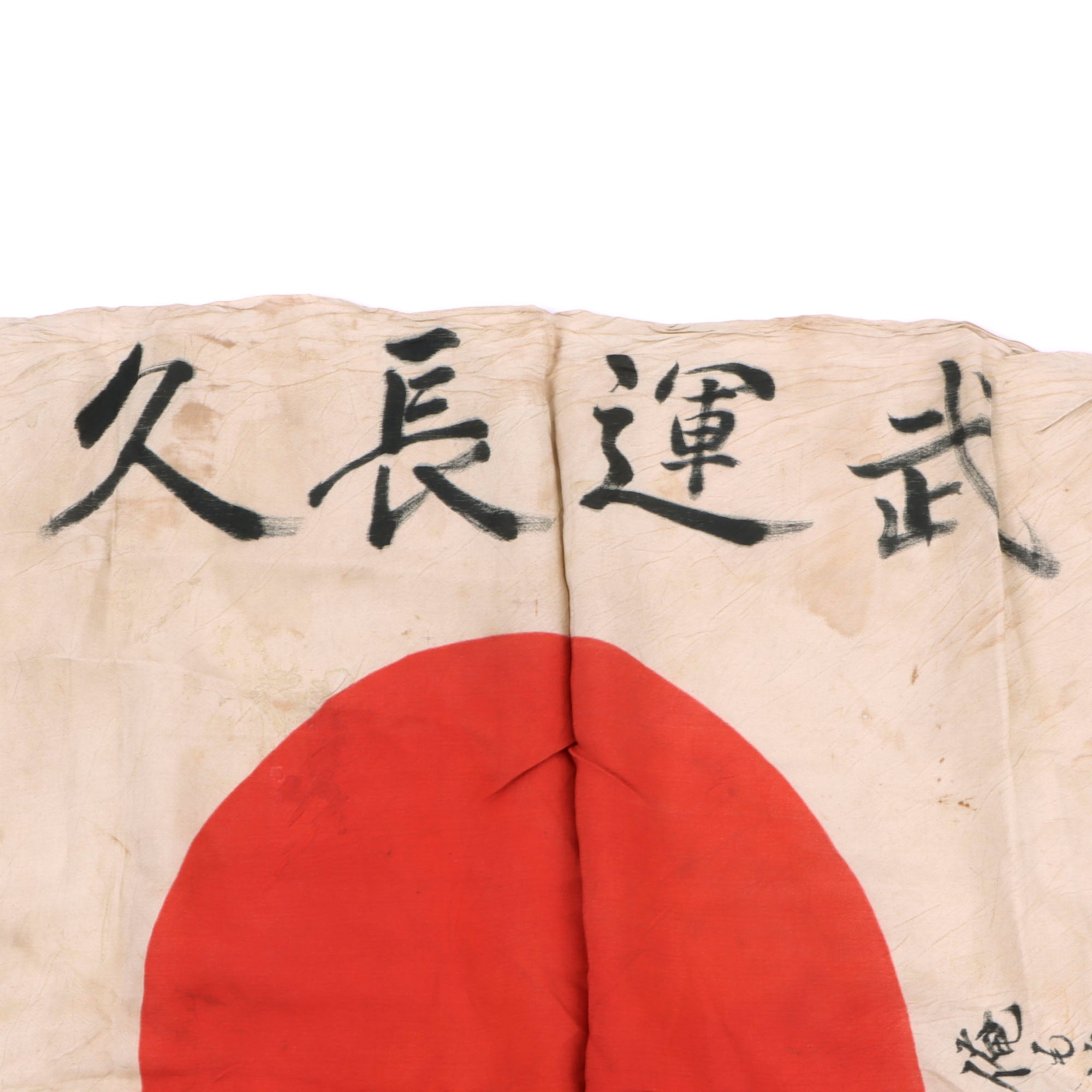 The flag is made of what appears to be rayon cloth, an early form of synthetic cloth made from wood, with the red "sun" dyed piece sewn into the middle. The flag is in fair but rough condition and is the real deal. The writing is still mostly legible, and this would make a fine display piece for a wall or glass table. These are getting harder and harder to find in any condition.