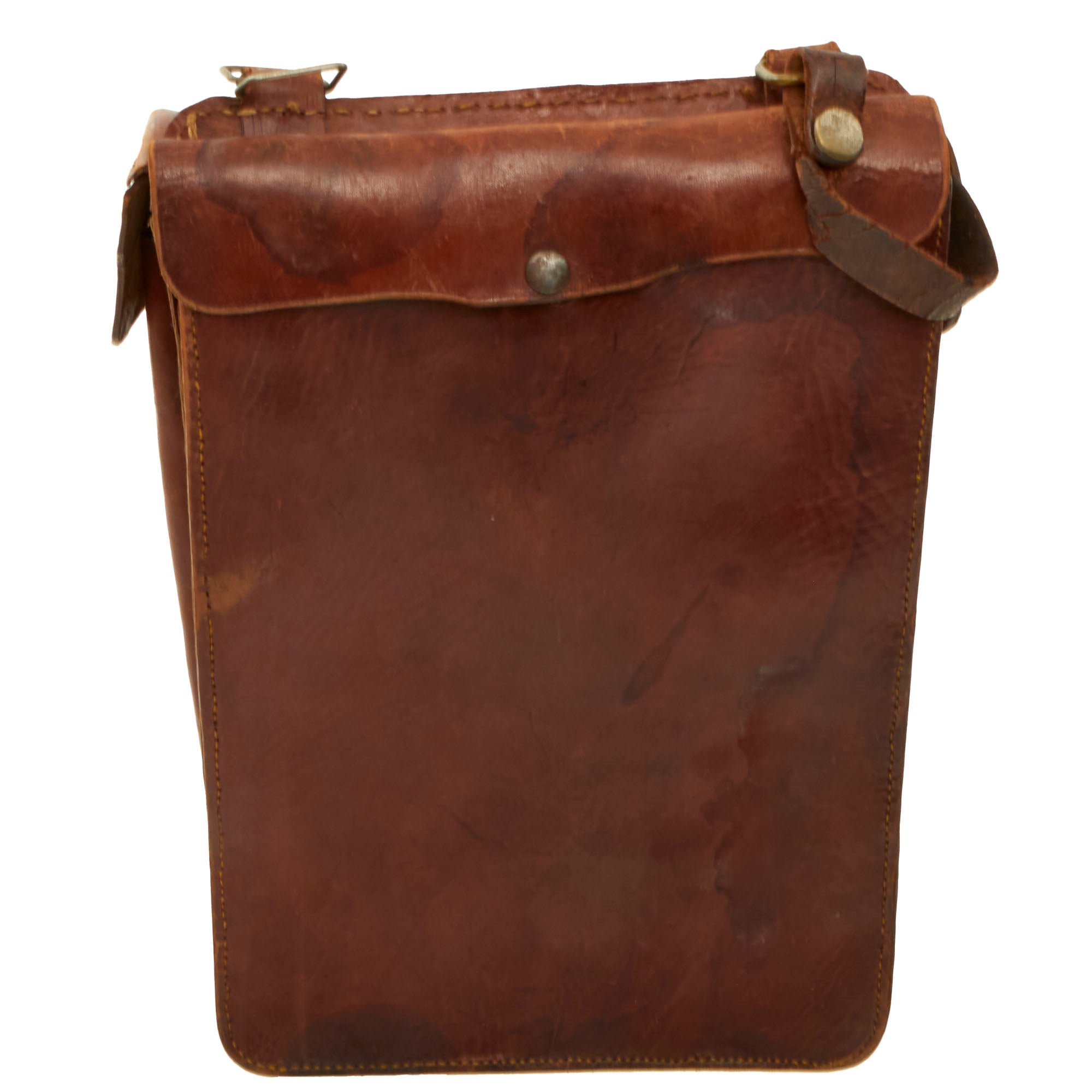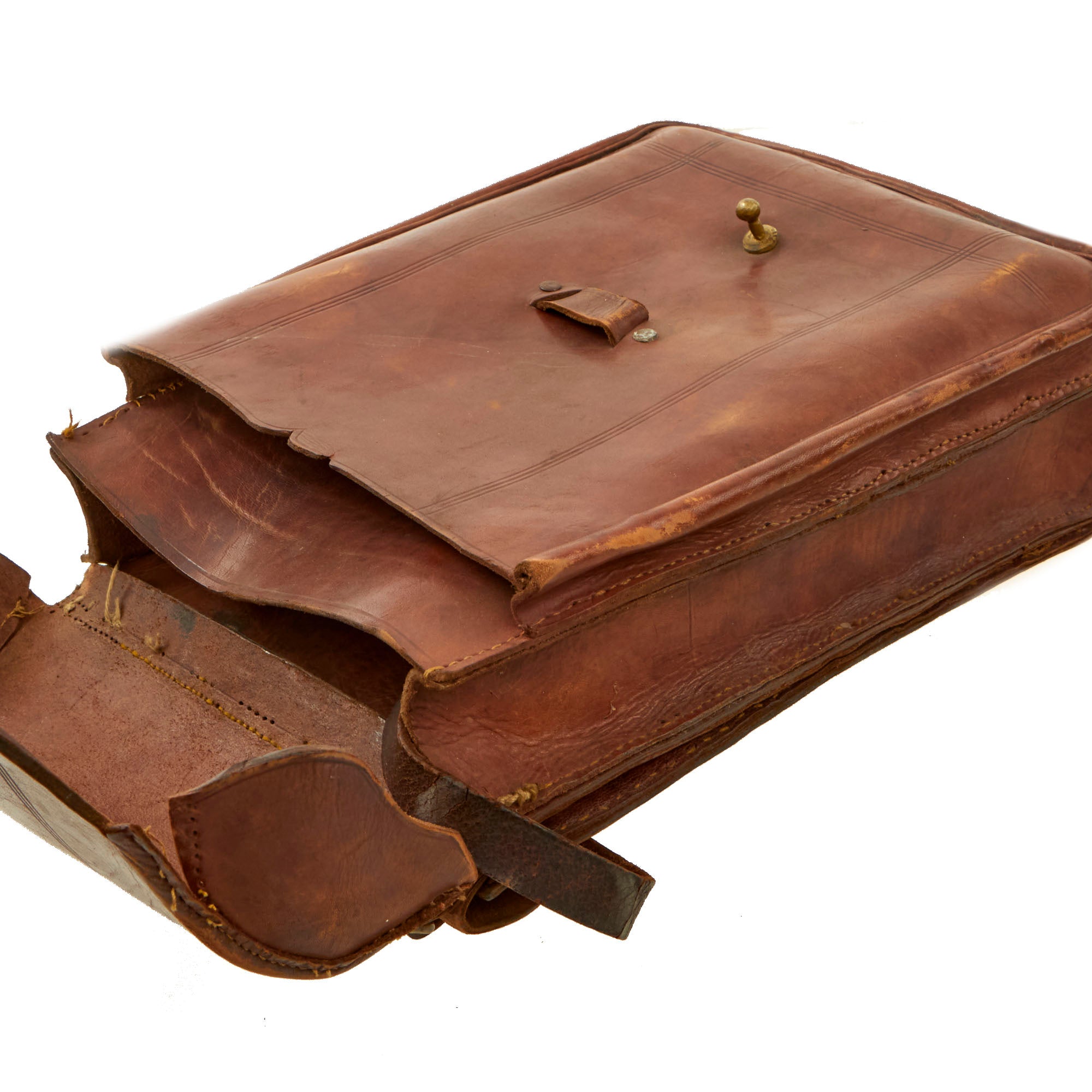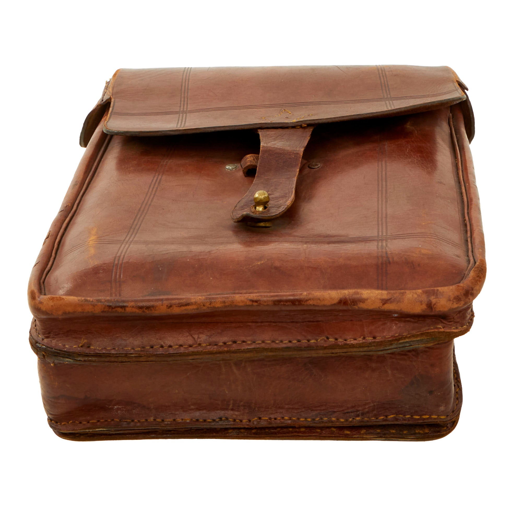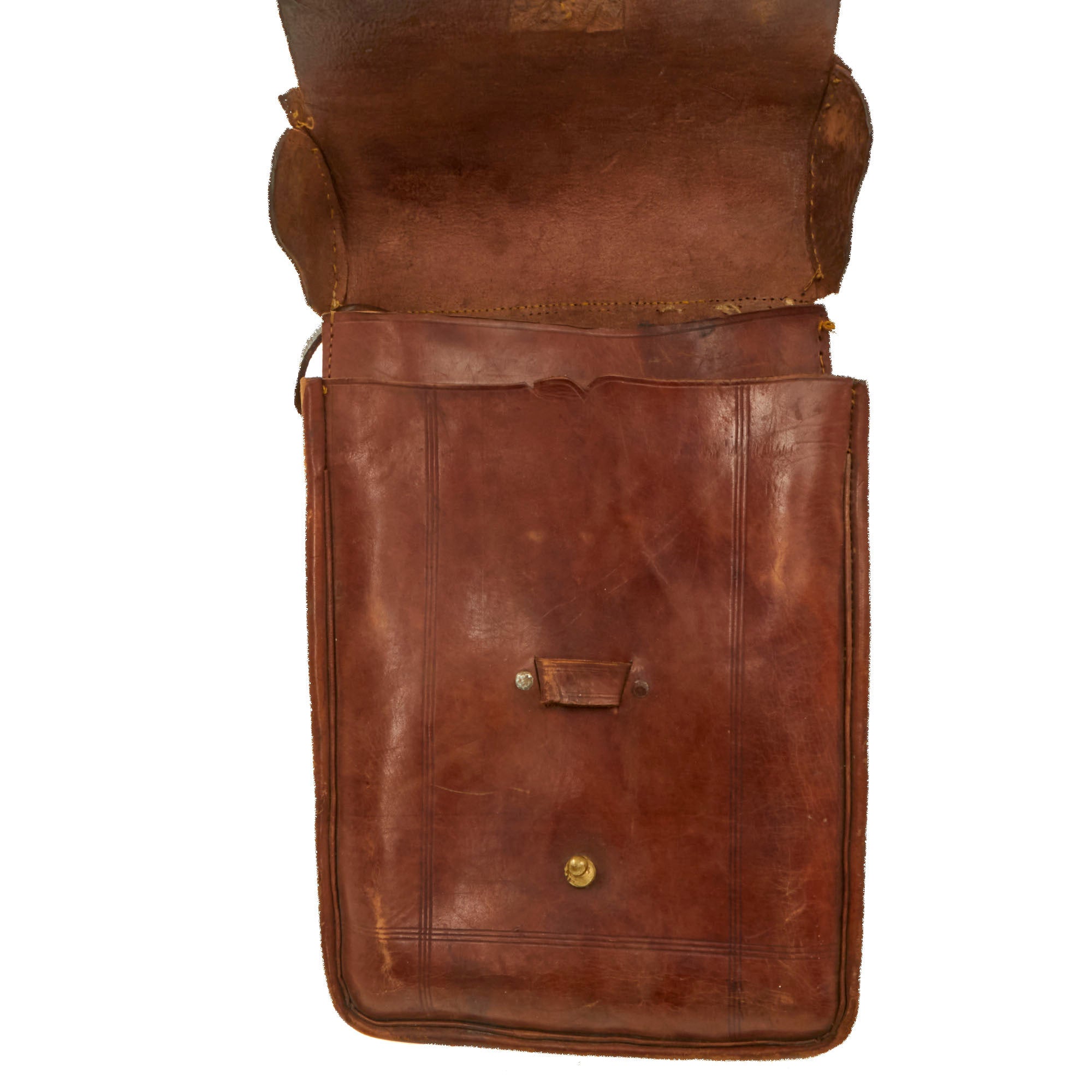 The case has three compartments, a shoulder strap and cover flap. The shoulder strap is intact however it has entirely broken off of one side, however this could possibly be fixed. The leather is now a bit stiff in spots but still displays well and has kept its thick shape. Offered in very good condition this is a nice example for display.
