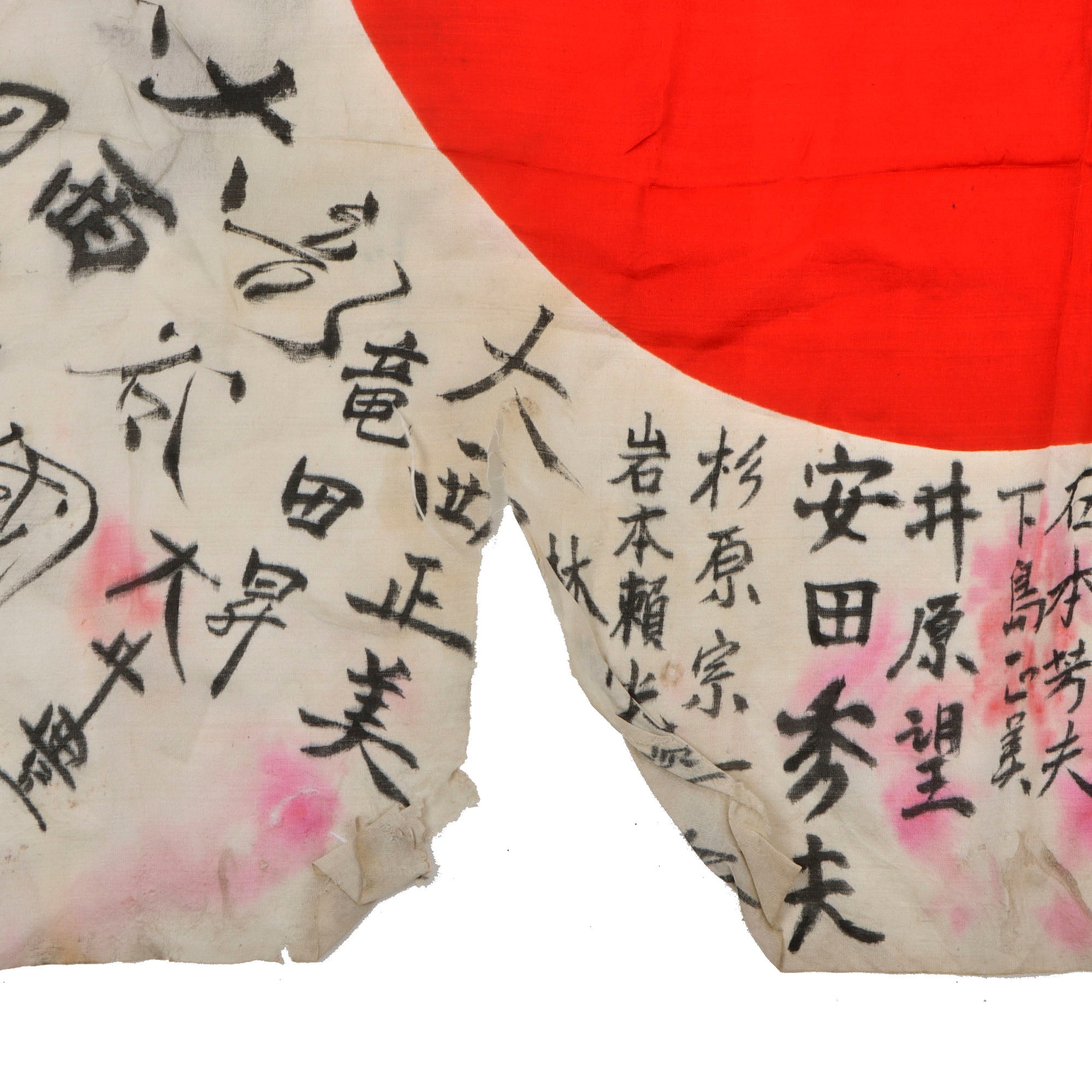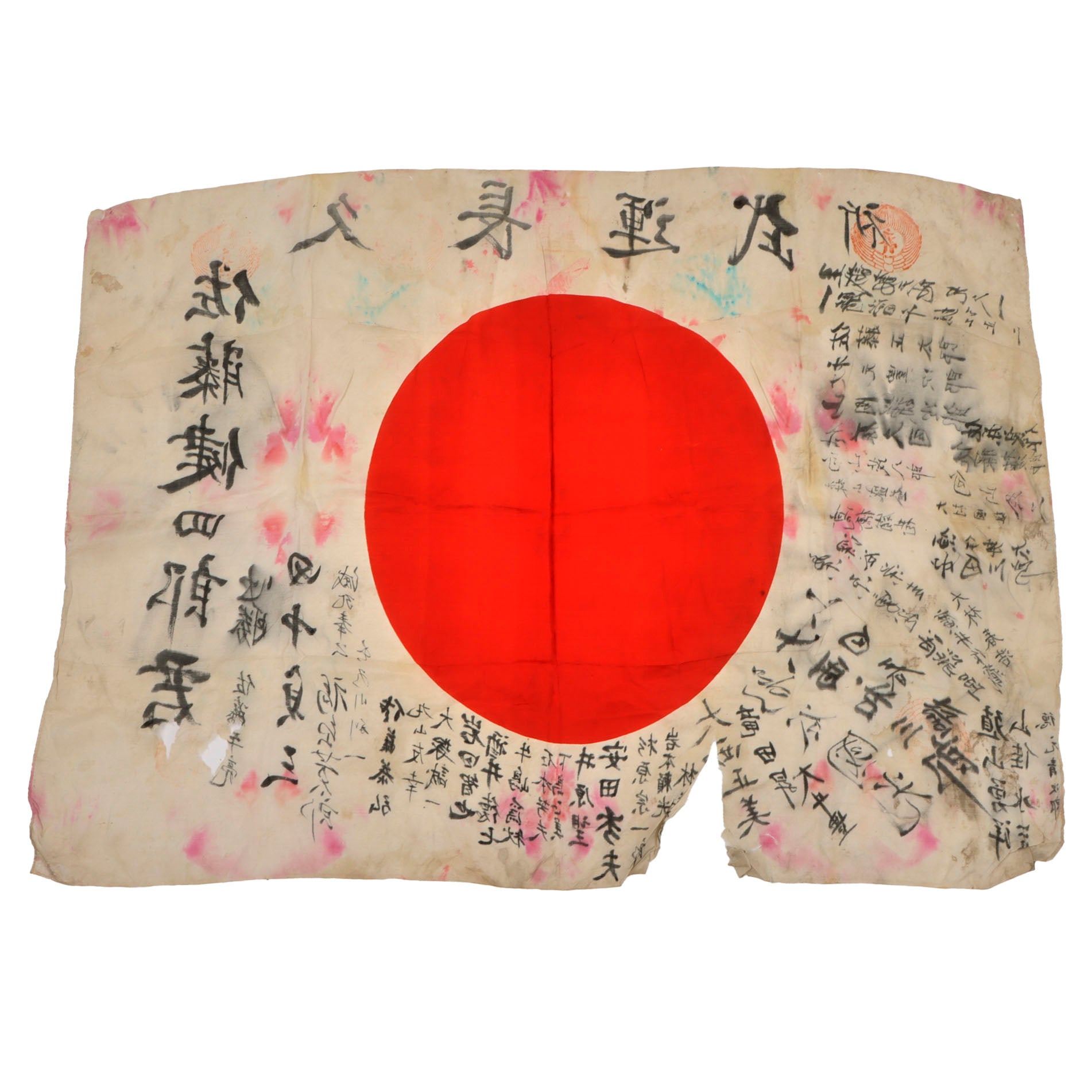 The Japanese call their country's flag hinomaru, which translates literally to "sun-round", referencing the red circle on a white field. When the hinomaru was signed, the Japanese characters were usually written vertically, and radiated outward from the edge of the red circle. This practice is referenced in the second term, yosegaki, meaning "sideways-writing". The phrase hinomaru-yosegaki can be interpreted as "To write sideways around the red sun", describing the appearance of the signed flag. This particular example completely unique is written in old KANJI the writing are mainly Japanese names of this soldier's family and friends with quotes and phrases.