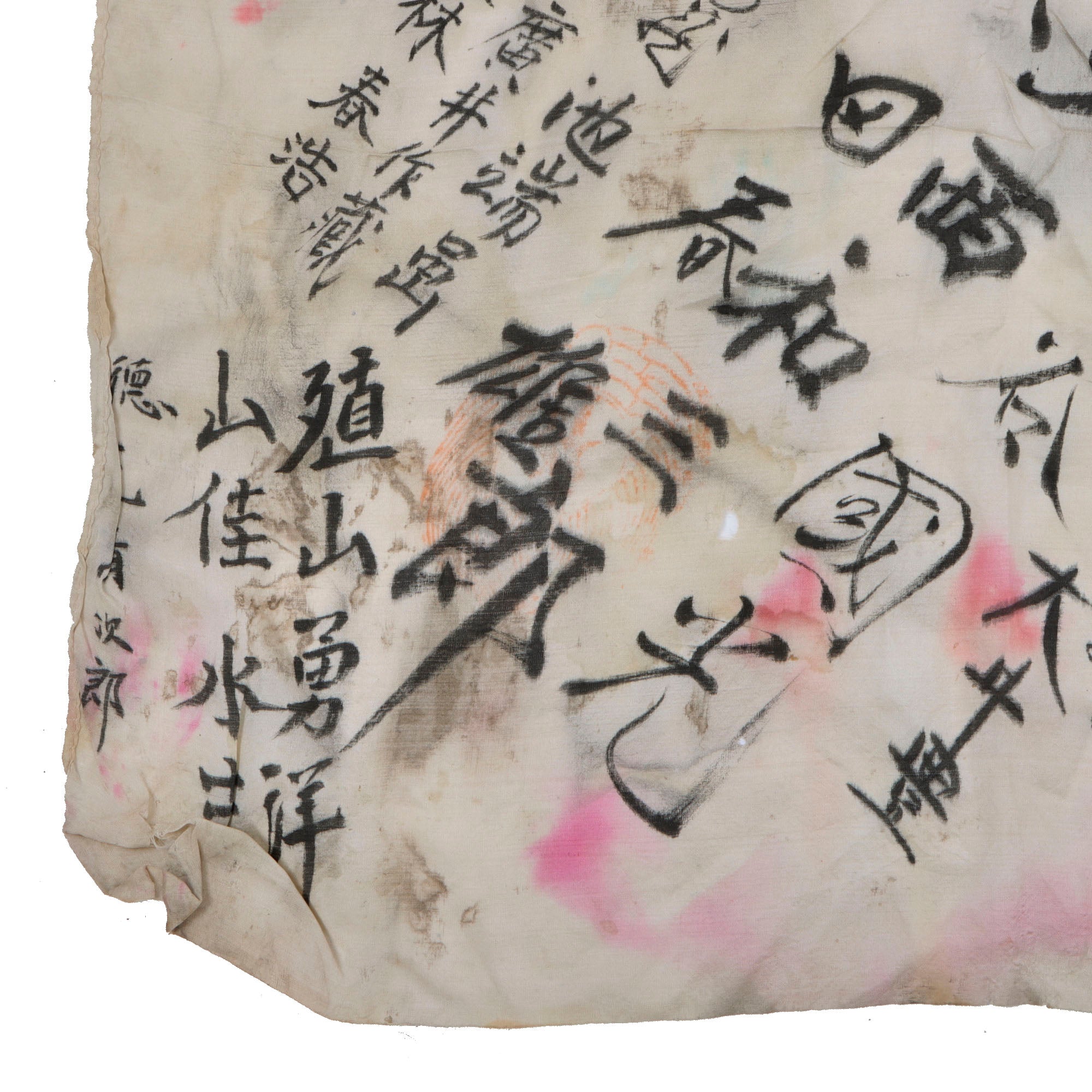 The flag is made of what appears to be silk or rayon cloth, an early form of synthetic cloth made from wood, with the red "sun" dyed piece sewn into the middle. The flag is in fair but rough condition and is the real deal. The writing is still mostly legible, and this would make a fine display piece for a wall or glass table. These are getting harder and harder to find in any condition.