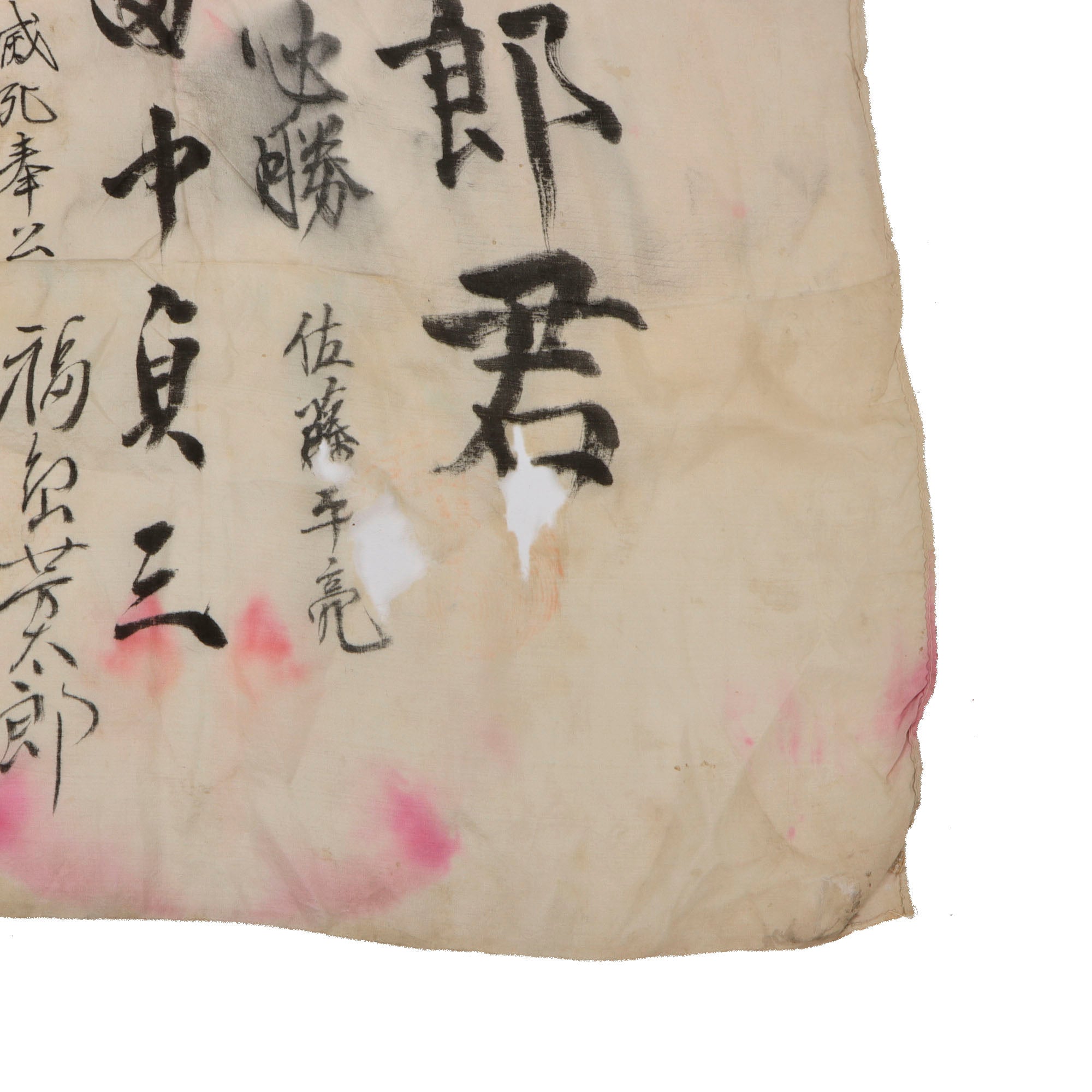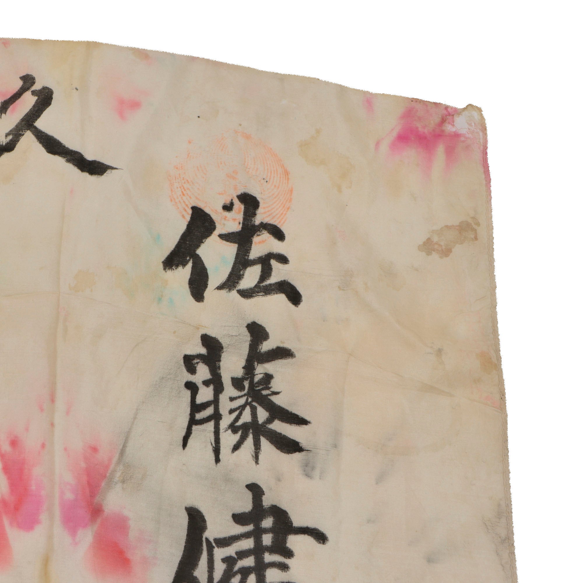 The flag measures roughly 27 ½ x 37 ½” and is missing both of its original corner reinforcements. There is also a heavy tear along the bottom of the flag and a few holes across. There is some moderate wear across, with staining of pink and blue. There is a large temple stamp on both sides of the top phrase, with another one in the center. The large name at the right translates to Kenshiro Sato.