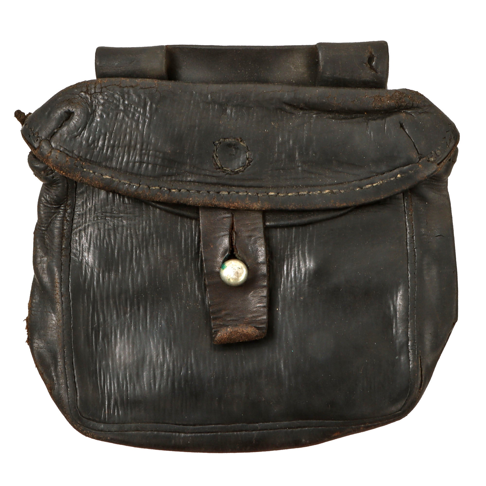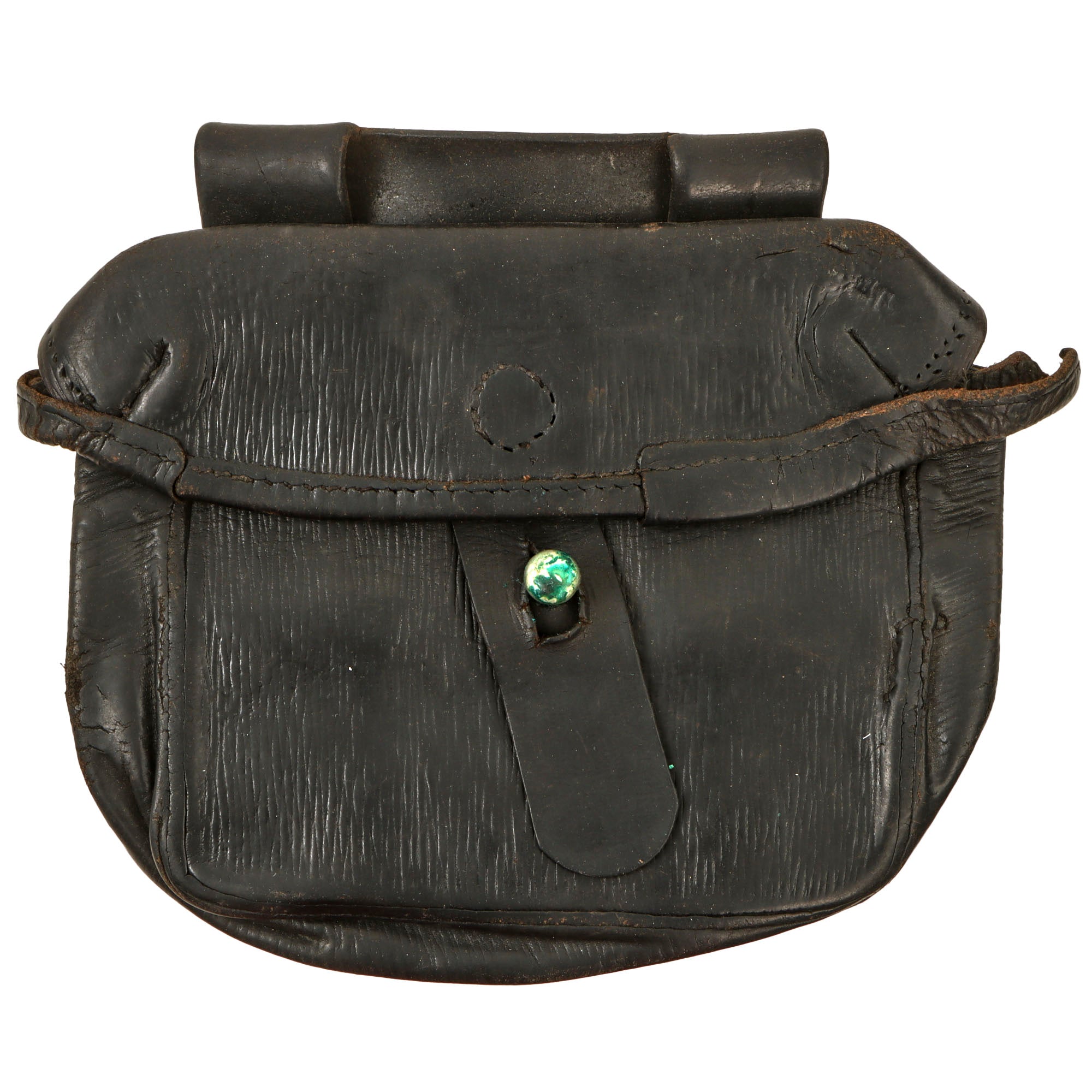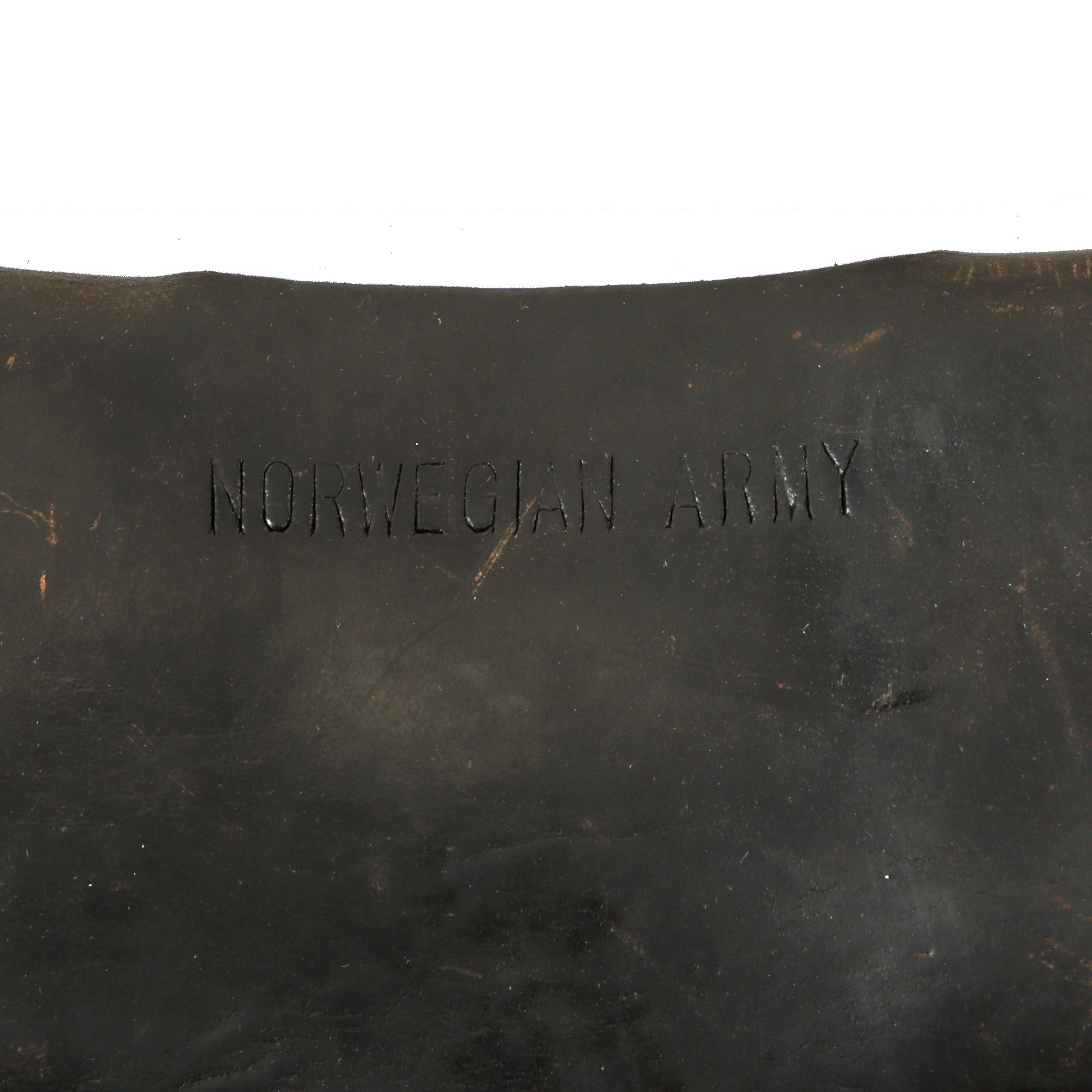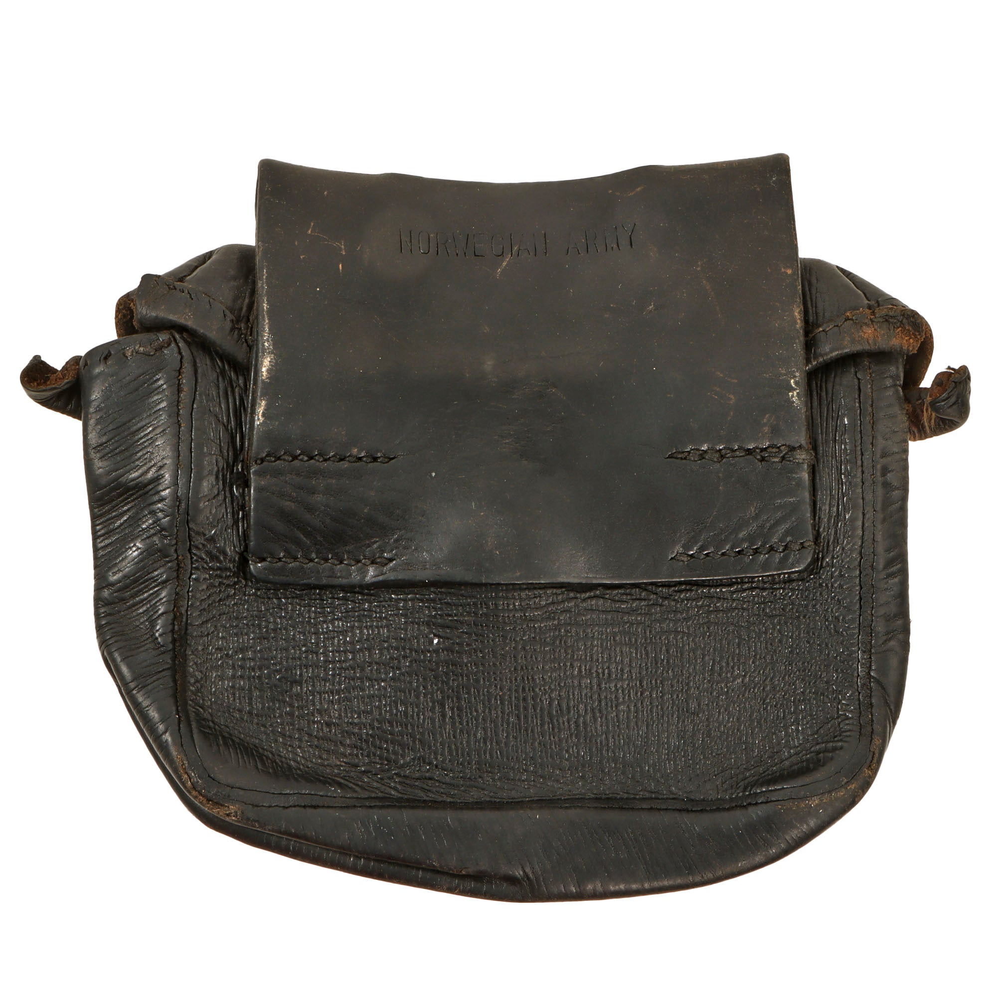 This is a very rare set of two Norwegian Army Krag Jørgensen ammunition pouches. Both are of darker black leather construction with both marked on the belt loops NORWEGIAN ARMY. There are no other markings we could find. There is minor damage with the leather trim breaking apart on part of the flap, with some overall wear to the rest of the leather. These leather pouches are brown and show heavy oiling and use consistent with age and service; they were never dyed black.