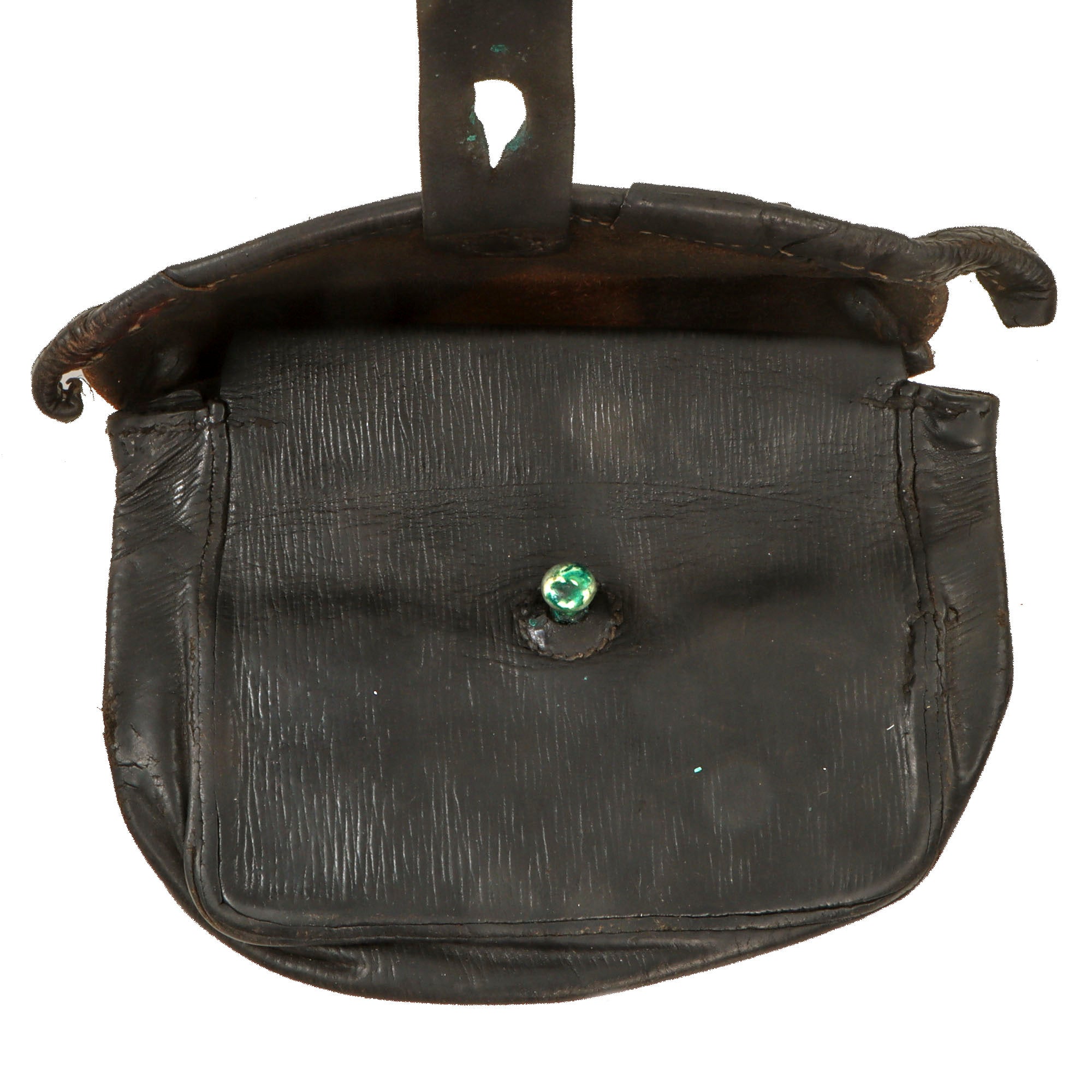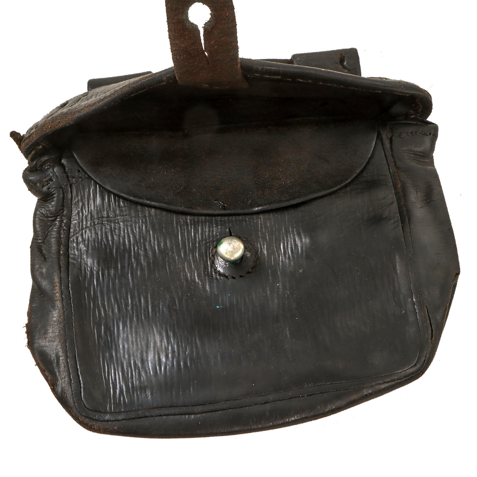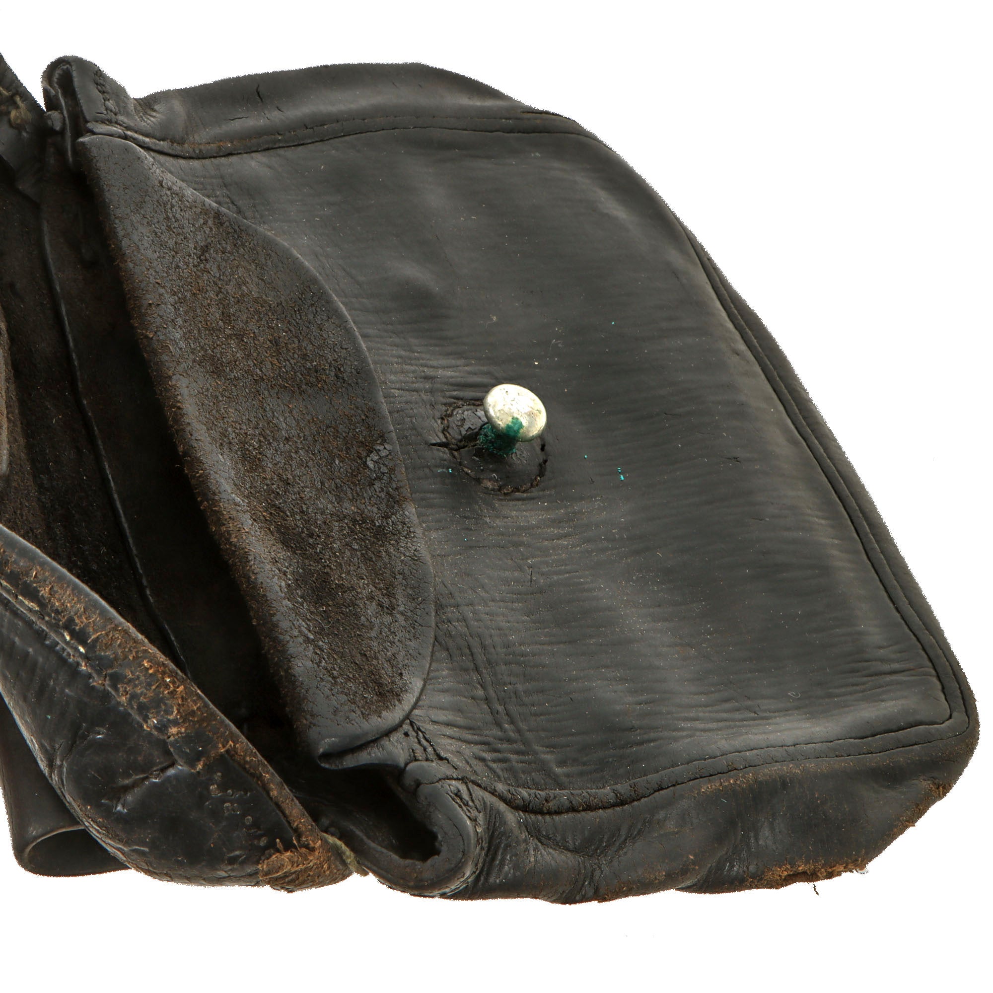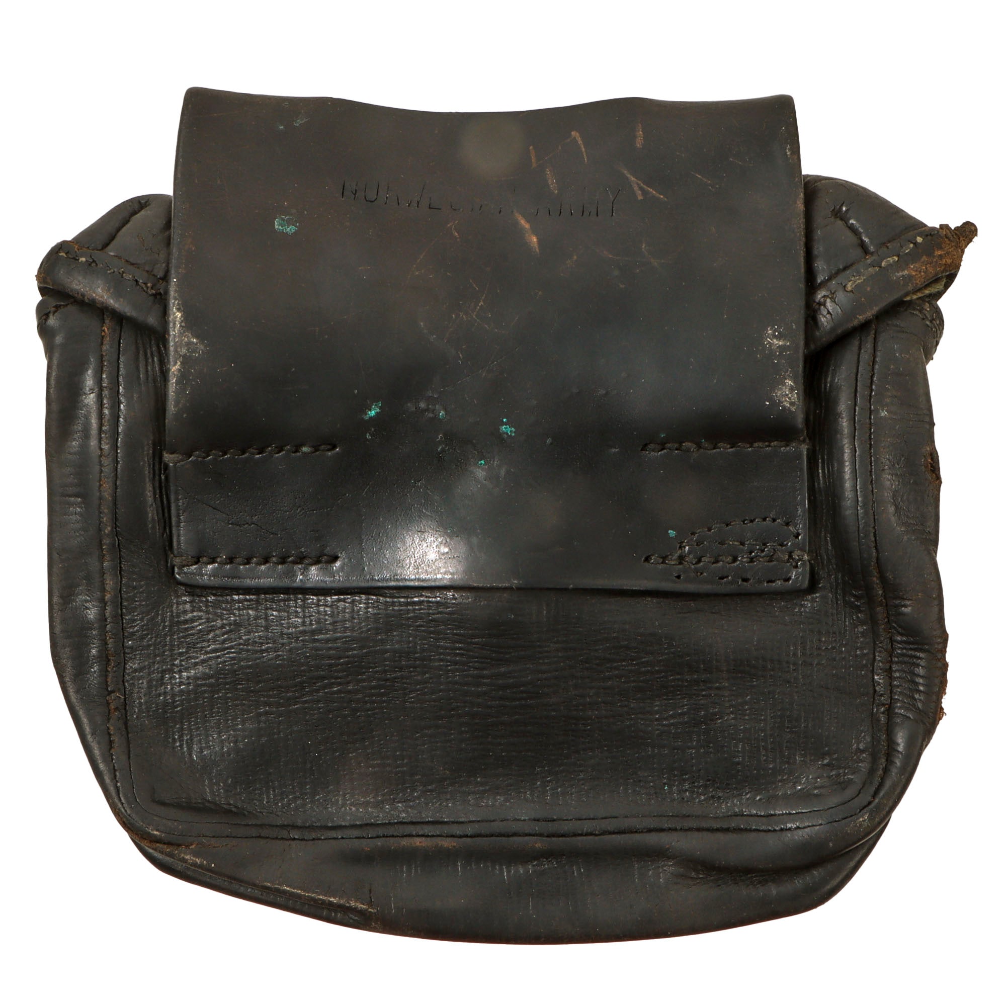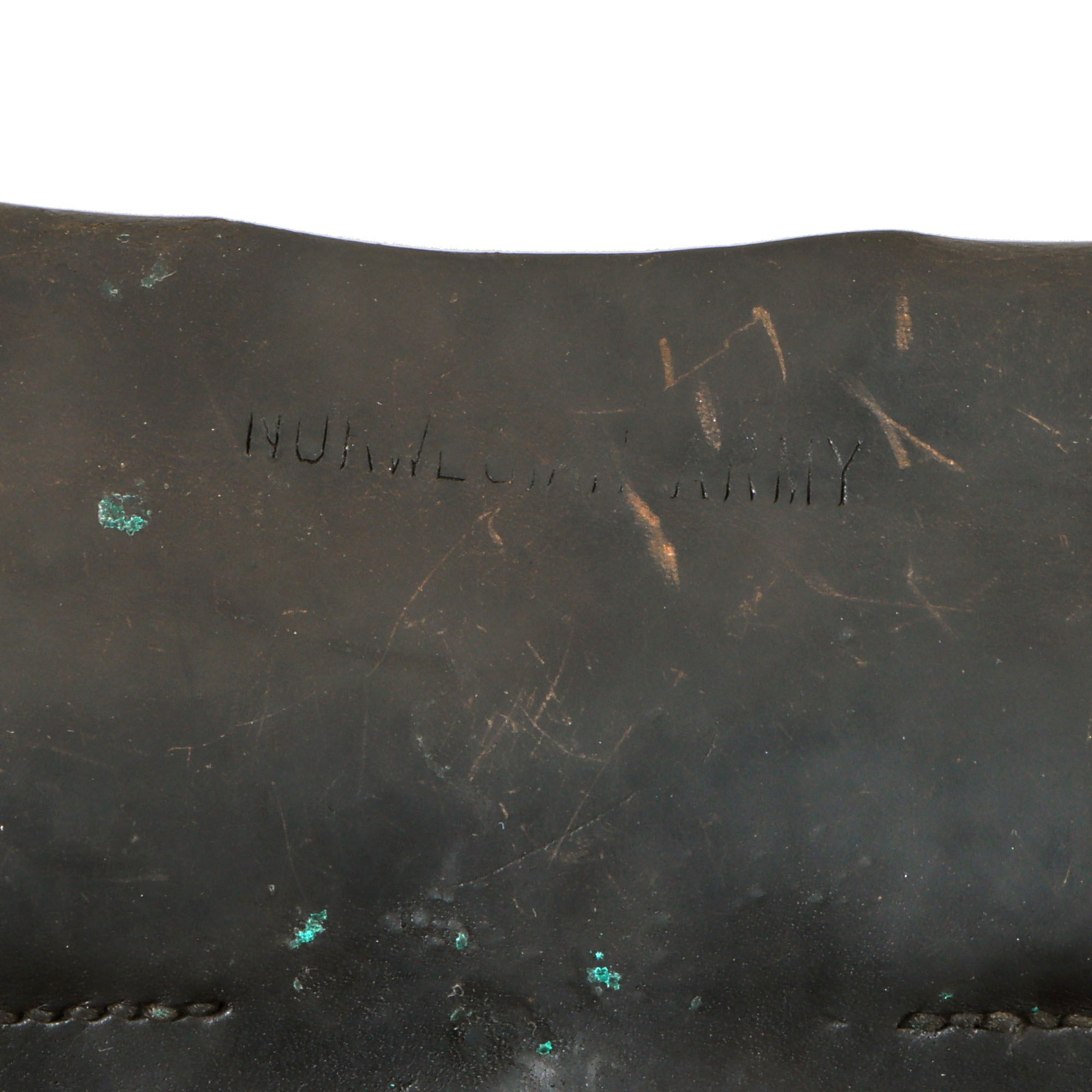 This is a very rare set of two Norwegian Army Krag Jørgensen ammunition pouches. Both are of darker black leather construction with both marked on the belt loops NORWEGIAN ARMY. There are no other markings we could find. There is minor damage with the leather trim breaking apart on part of the flap, with some overall wear to the rest of the leather. These leather pouches are brown and show heavy oiling and use consistent with age and service; they were never dyed black.