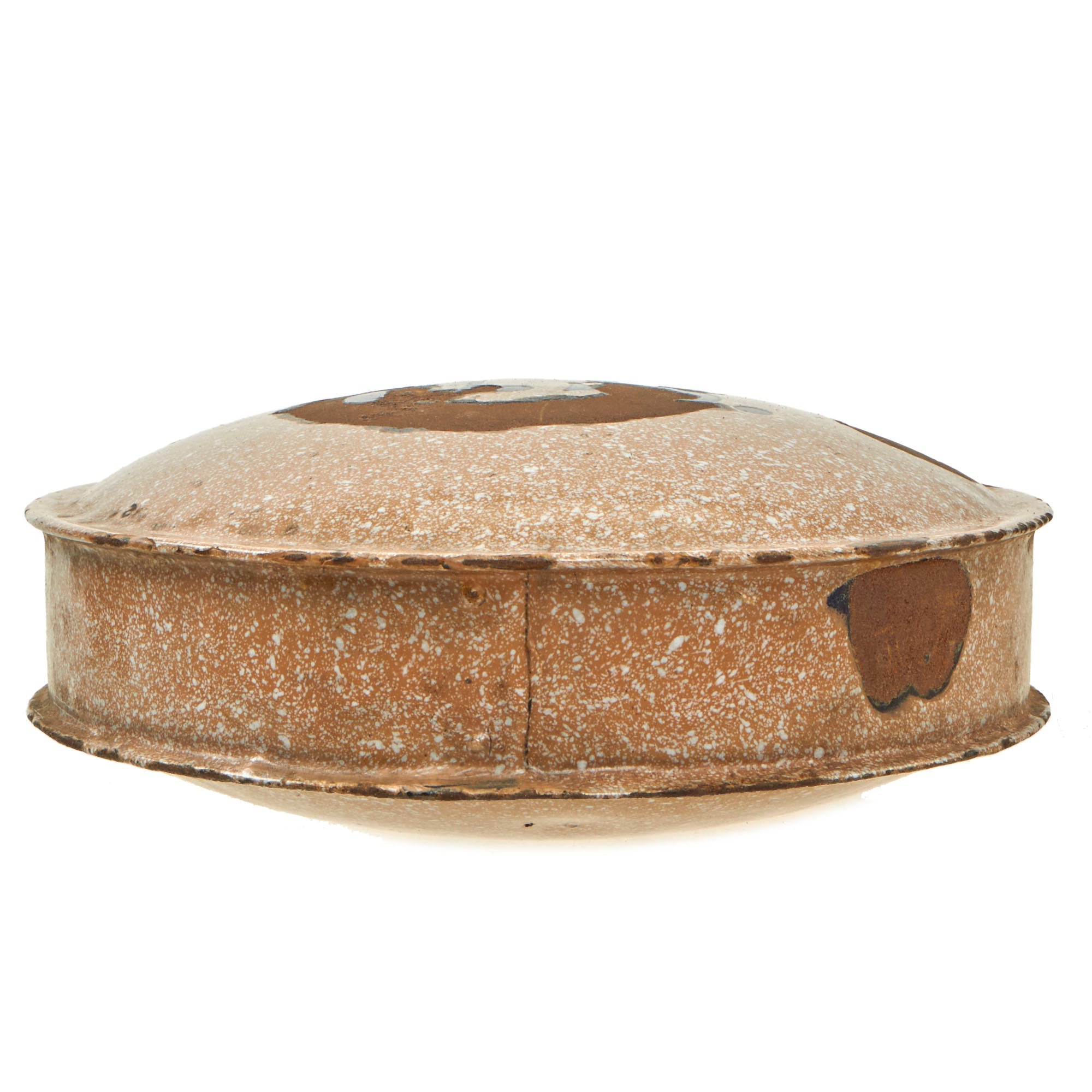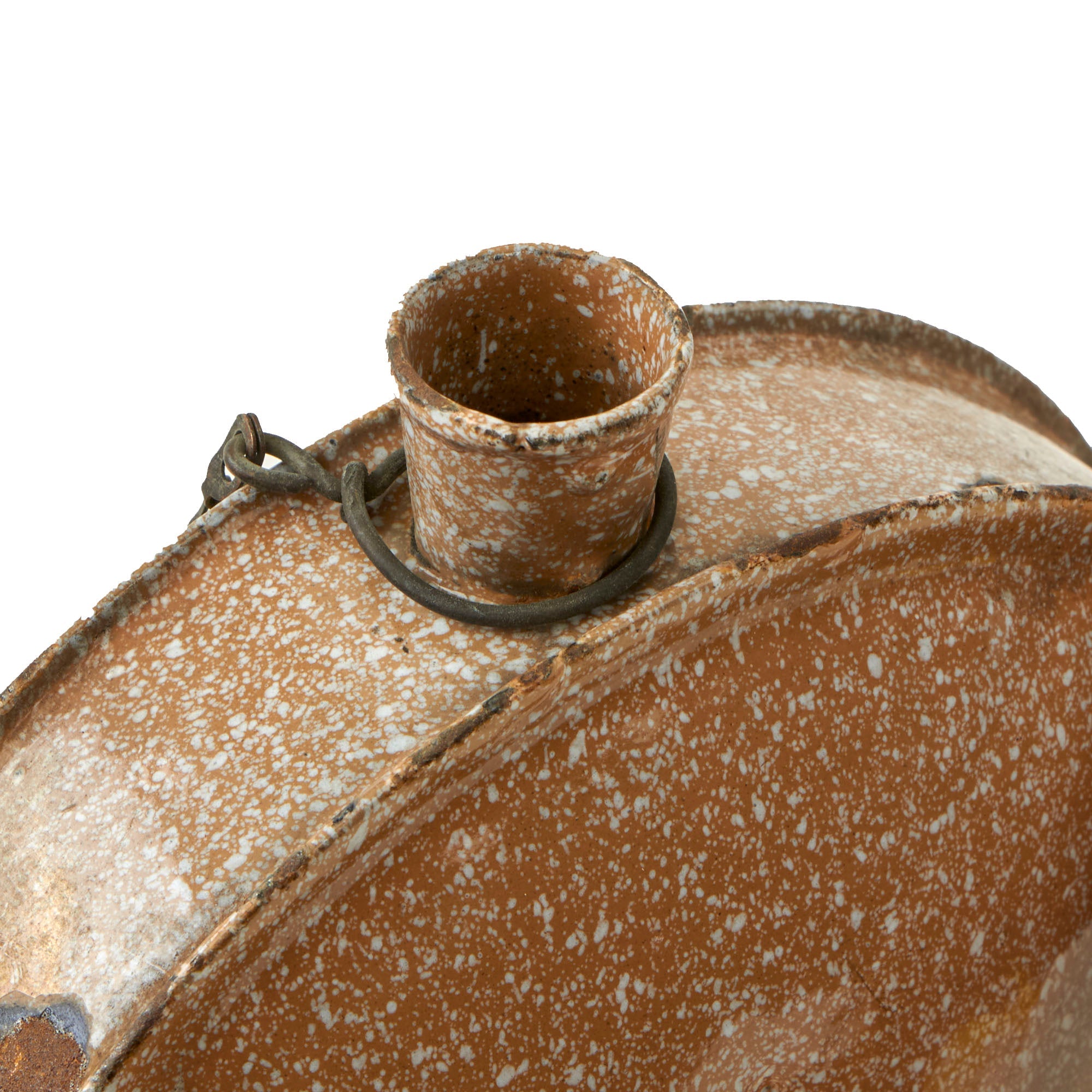 The canteen is missing enamel in a couple places on the front, in the center on the back, and in a couple other places across the canteen. The areas where enamel is missing show a layer of blue under the initial enamel, so this may have been a multi-layer job. The canteen body measures a roughly 7” diameter. The back of the canteen appears to have had a pattern of lines protruding from the center where there may have been an eye or another symbol.