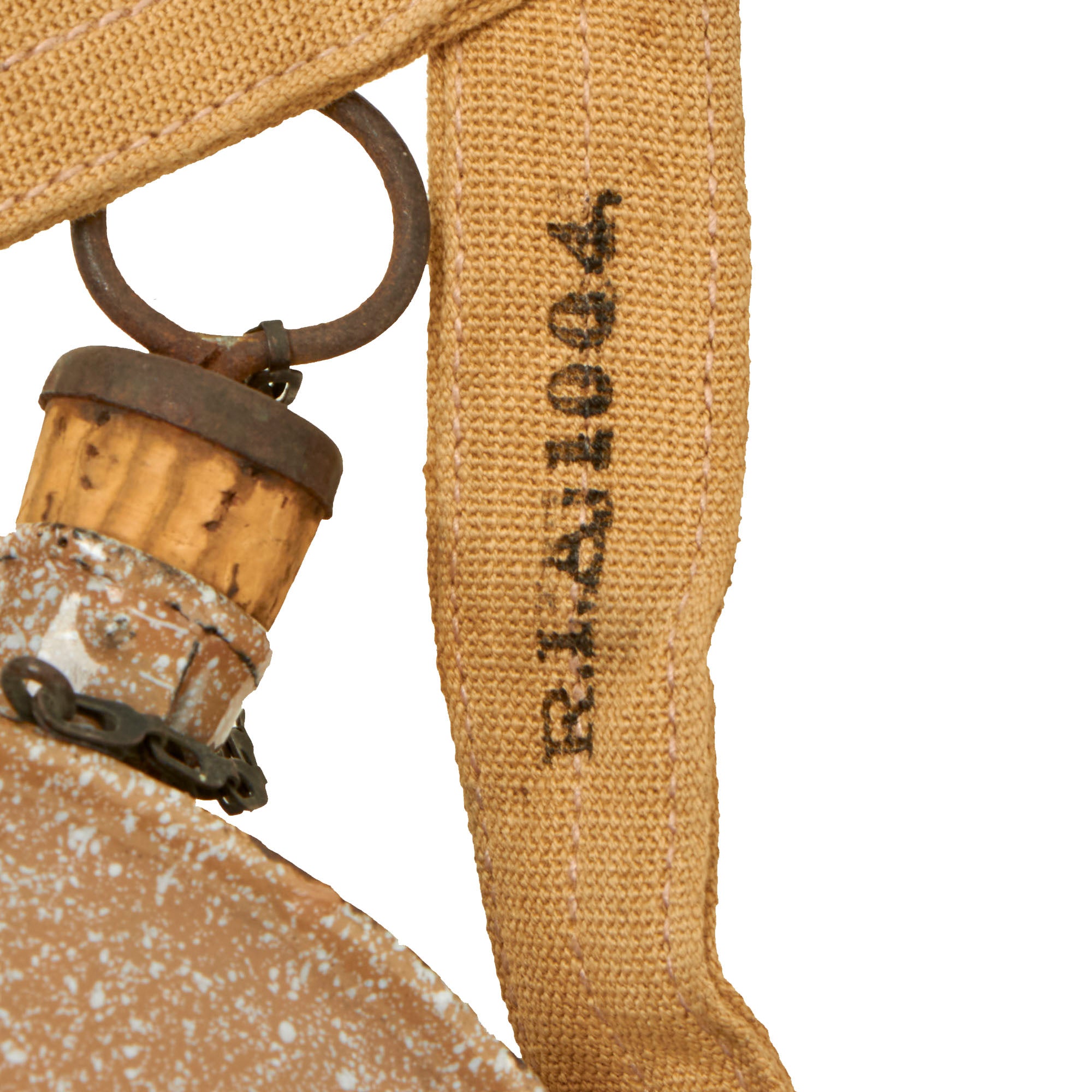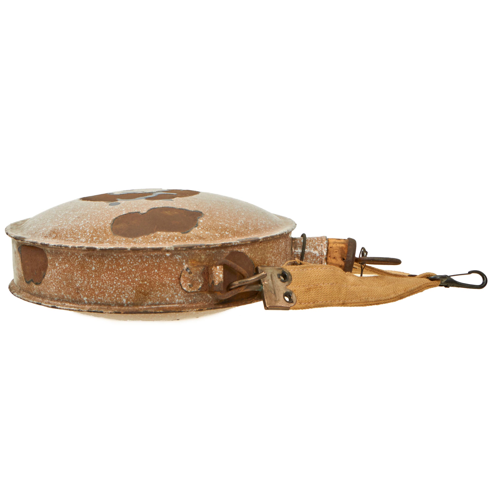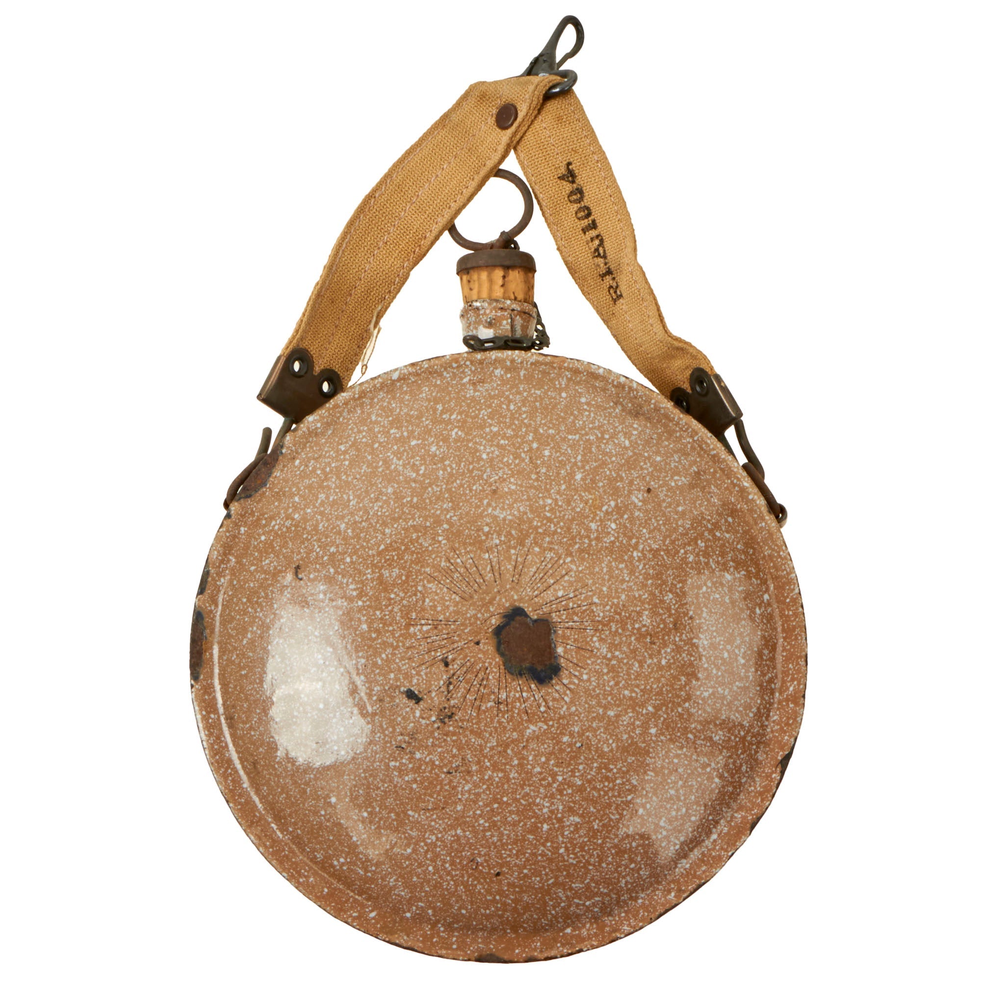 Original Item. One-of-a-Kind. Now this is a scarcity, the only example we have been able to find. We believe this to be a 1902 era experimental enamel canteen, with the metal base being covered entirely by a tan & white colored enamel, which has deteriorated a bit on the front where the U.S. is indented. The canteen is similar in shape to the 1902 model, and the inclusion of a 1904 Dated RIA hanger supports this.