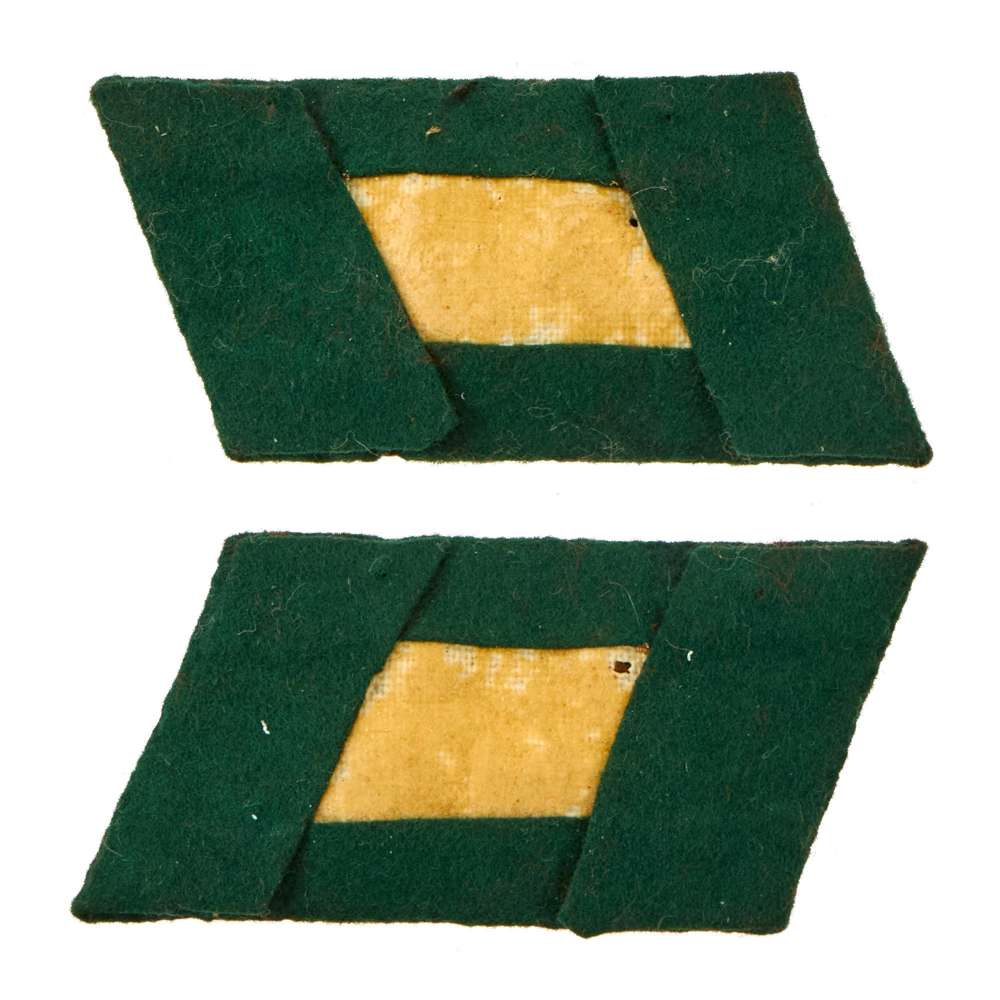The included matching left and right set of Land Customs tabs are quite luxurious looking and are of a very high quality. They are made with the correct lacquered buckram internal stiffeners, and wrapped with a fine green felt background. The silver flatwire embroidery is exceedingly well executed, and shows just a bit of oxidation on a few strands. We can see a few remaining stitches around the edges, so they do look to have been installed at one time. We have compared them against many period originals, and they are 100% correct. There is just a bit of mothing on the tabs, and the buckram also is a bit warped due to moisture exposure.