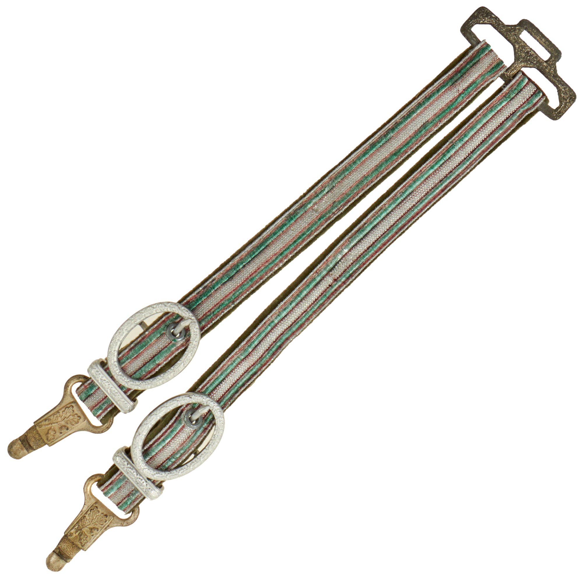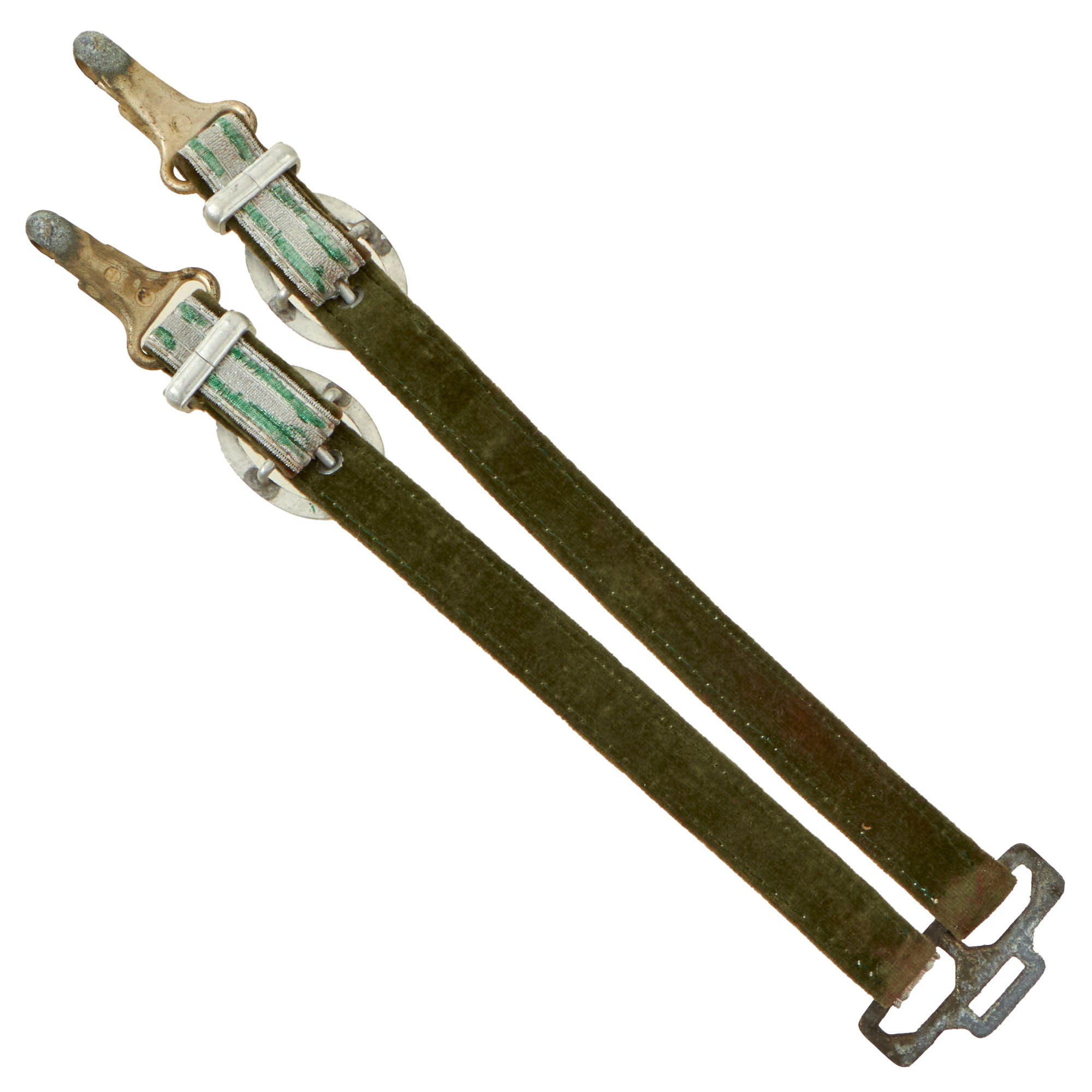 The end clips are the more complex and desirable sliding type, and one is marked with the "barred A" trademark, of F. W. Assmann & Söhne of Lüdenscheid, a large maker of belts, buttons, and other accouterments. The velvet backing of the hanger is mostly intact, though there is wear at the edges. The straps are also a bit stiff, as it appears that the set was stored in a relatively damp environment for a long time, which resulted in some oxidation in the aluminum. The spring clips are also frozen for this same reason.