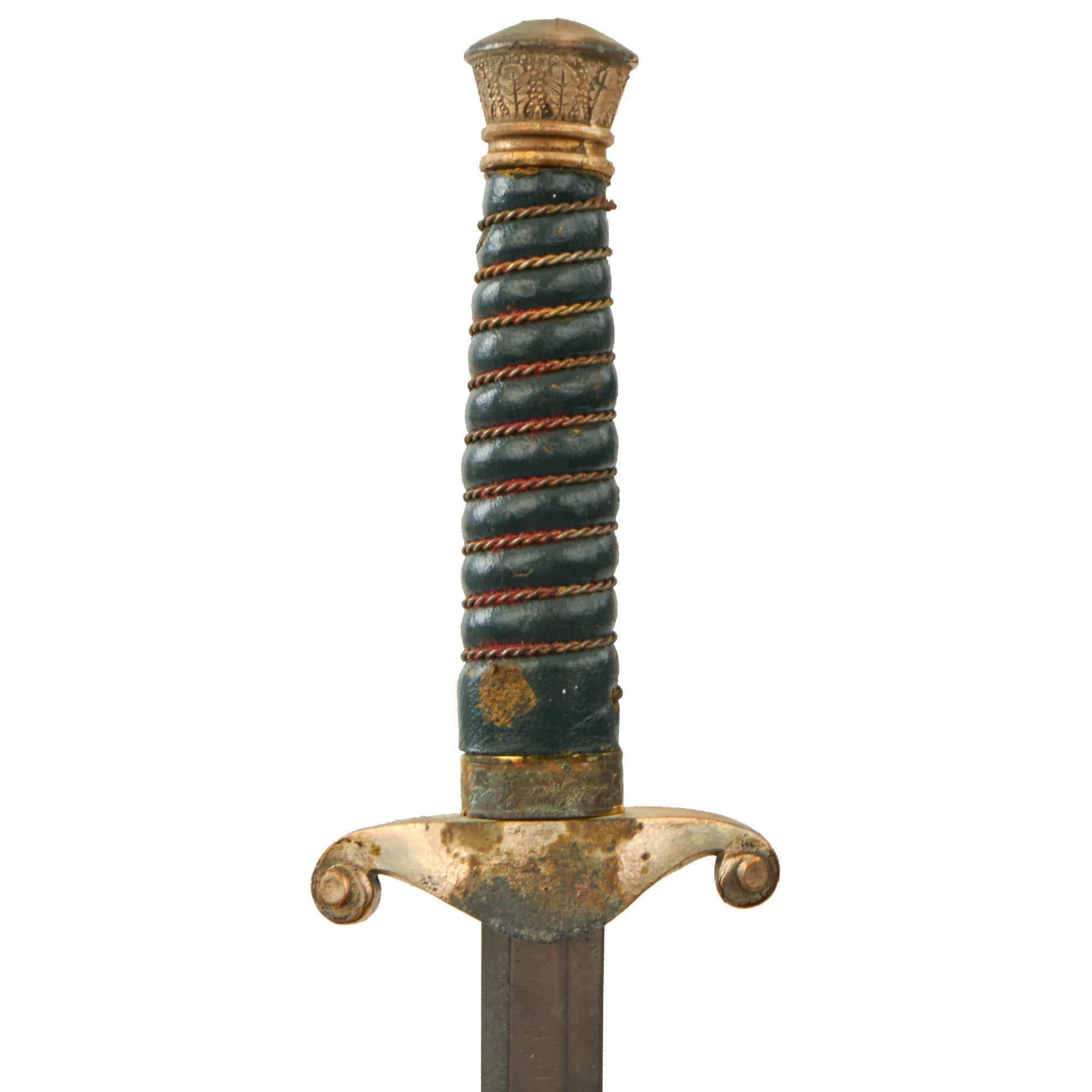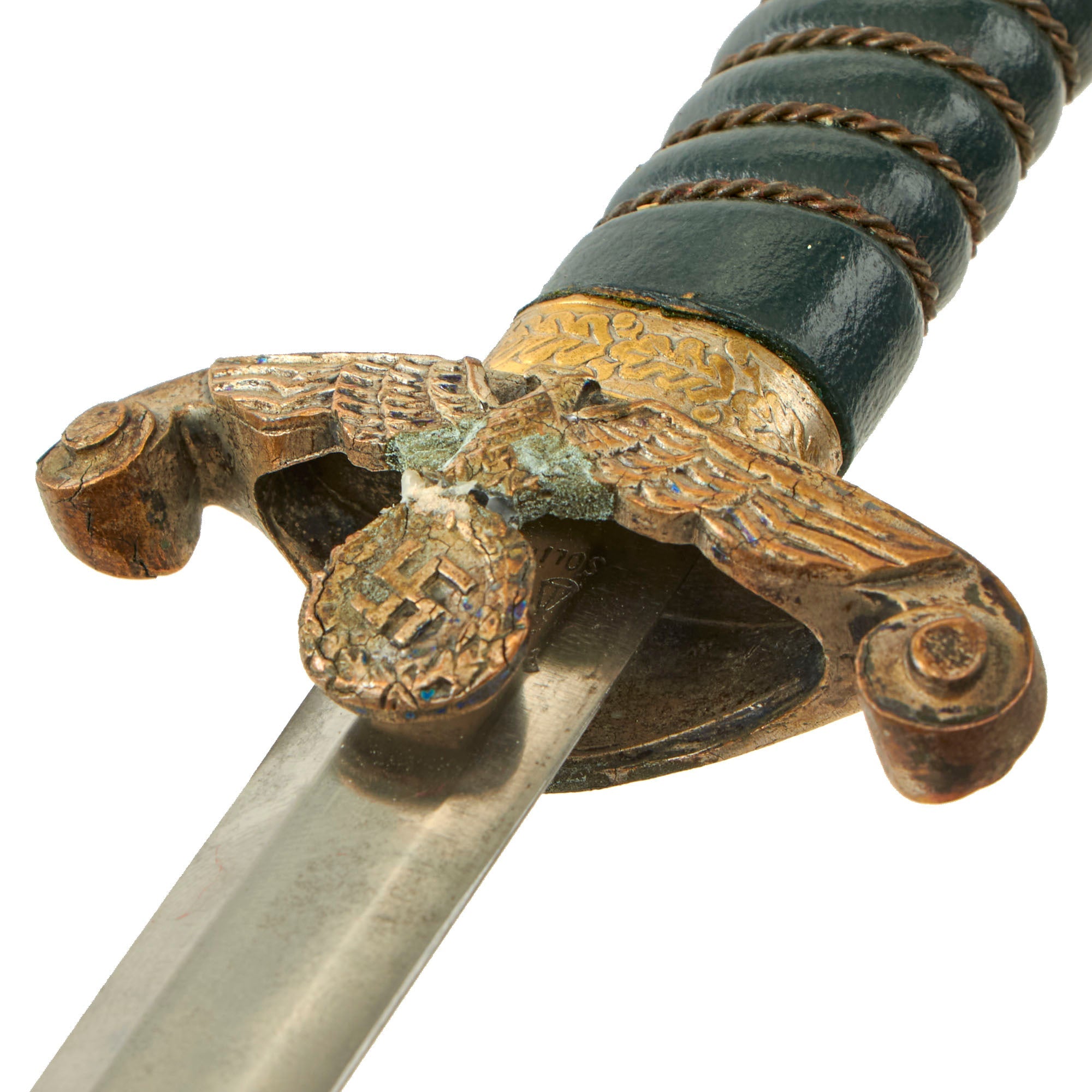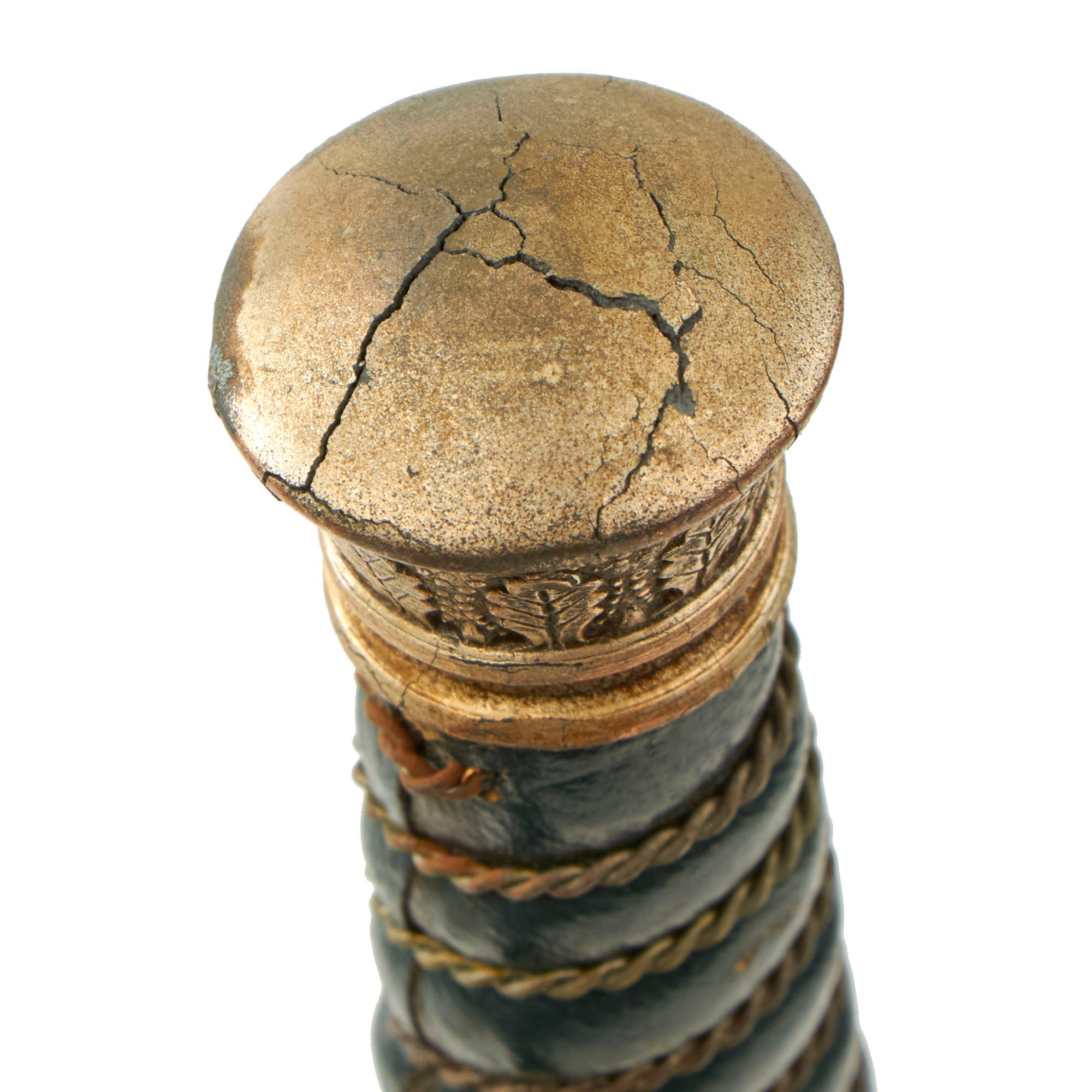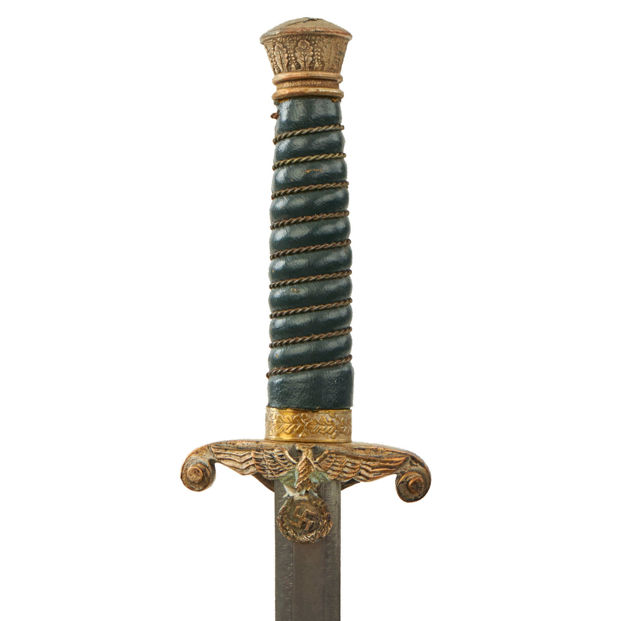 The Dress Dagger in this set was produced the well-known firm of Alcoso-Werke in Solingen, and is a very nice lightly patinated example. It looks to have a mixture of zinc alloy and aluminum fittings, which have been plated and silver washed. They show wear and some oxidation, particularly on the reverse where they were in contact with the red felt mounting. The design is for the most part the same as the Army Officer dagger, with a Reichsadler Eagle cross guard and pommel with the usual twelve standing art deco style oak leaves around the edges. Both do show damage, with the zinc alloy showing cracks on the base of the pommel, and the wreathed swas at the bottom of the eagle broke off, and was then reglued with a piece of wood or cardboard on the back.