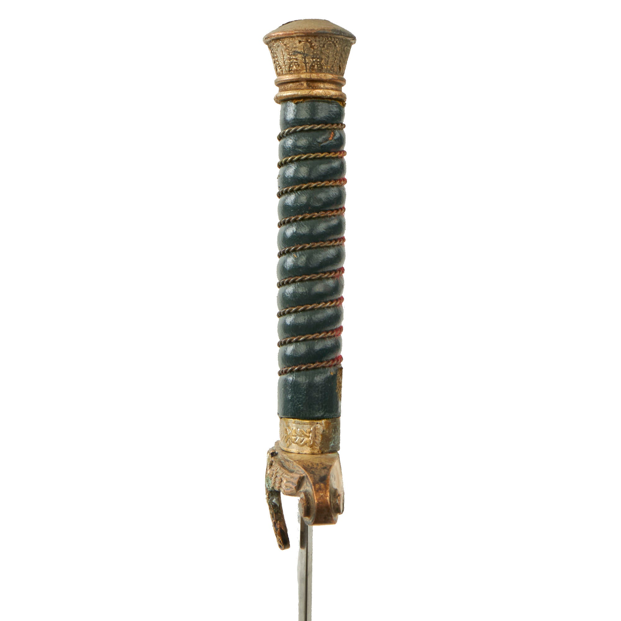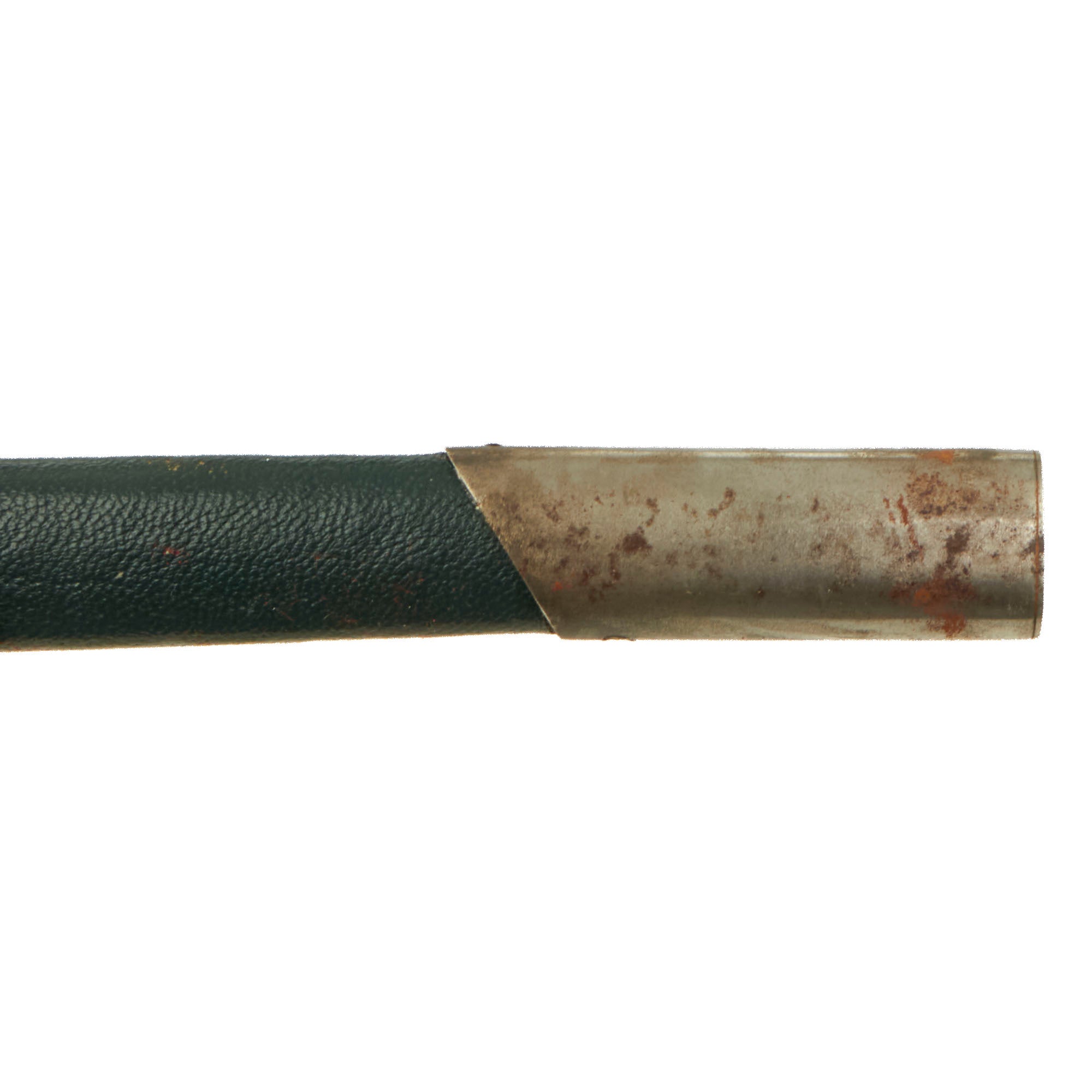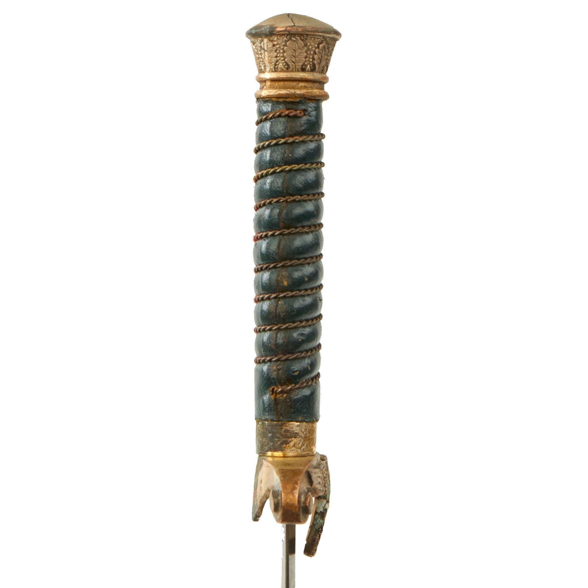 The grip is wood covered in fine dark green Moroccan leather. This leather remains in very good condition, tightly wrapped with twisted plated steel wire. There is just a bit of finish loss, and no exposure of the wooden under layer, just some discoloration where it contacted the red felt. The wire binding has lost most of the plating, and how shows overall oxidation, particularly on the reverse. The hilt fittings are still tight on the tang, though they were probably removed at one point when the cross guard was repaired, and were then fitted on the blade backwards.