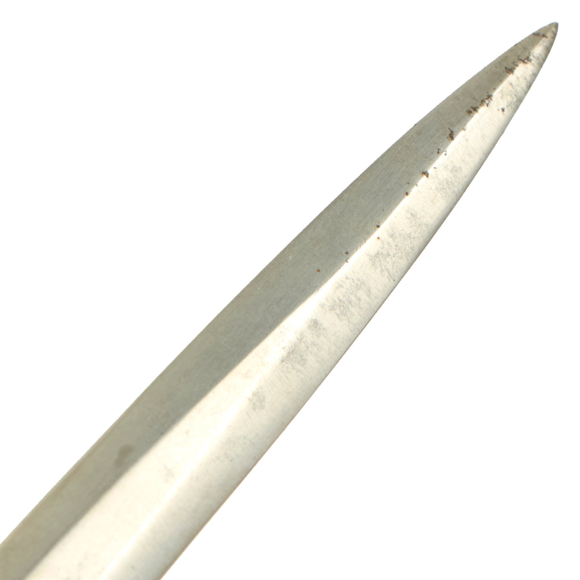 The blade on this example is in very good condition, with the factory final polish grind cross grain present in many areas, though it is worn away in others. This texture is iconic, and is the definitive identifying characteristic for a real WWII German Blade. It looks like the blade had staining in various areas, not uncommon on the bright steel, and then was cleaned to remove this, making the cross grain faint. The needle-like tip is still intact, with no bending, and the edge is still nice, with no chips or sharpening.