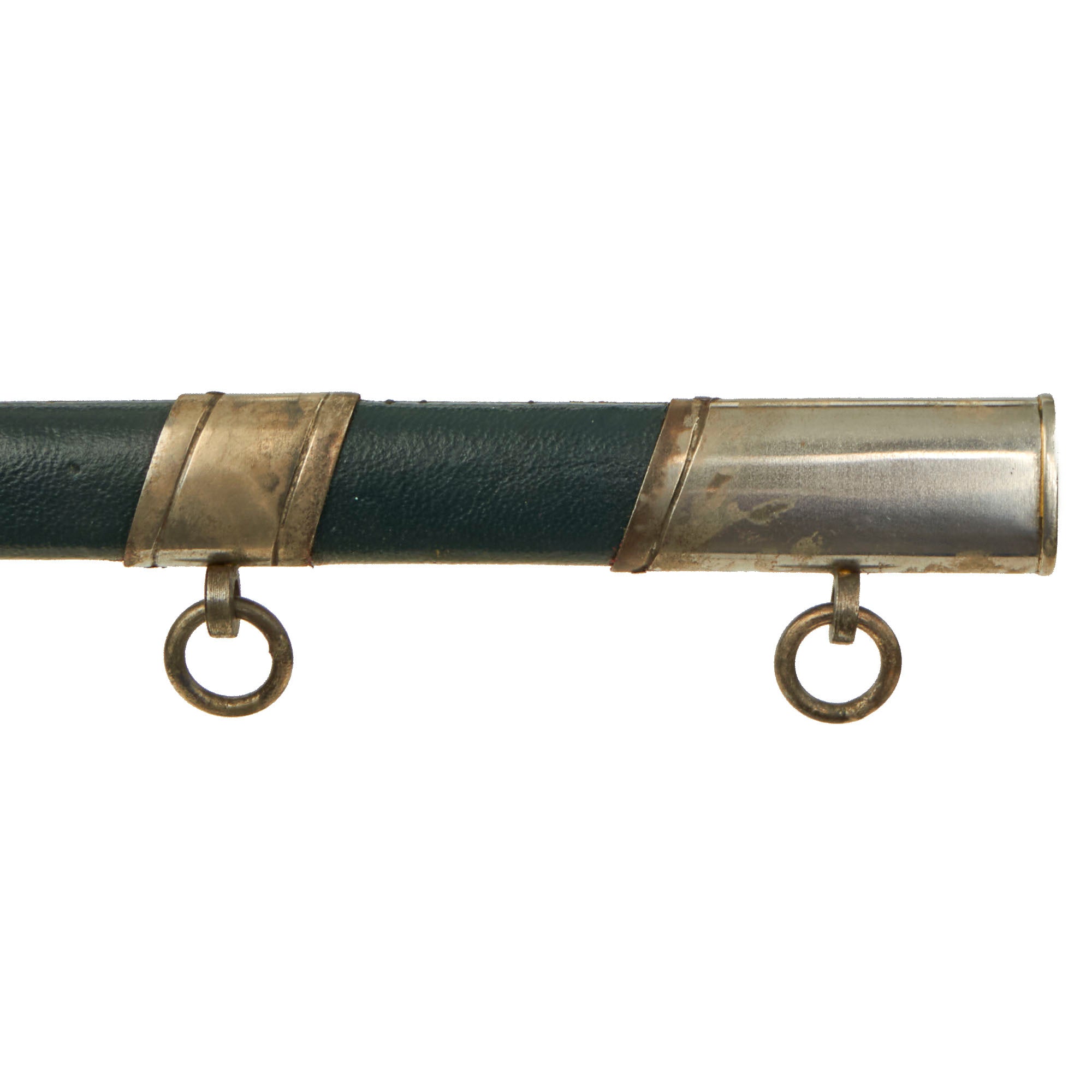 The scabbard shell is straight throughout, covered in matching dark green Moroccan leather and fitted with plated brushed steel. It is in very good condition for the most part, though as with the dagger, the reverse was in contact with the red felt, which resulted in plating loss and oxidation on the rear of the fittings. These mounts are retained by flush mount side screws and are styled with decorative lines on on the front side only.