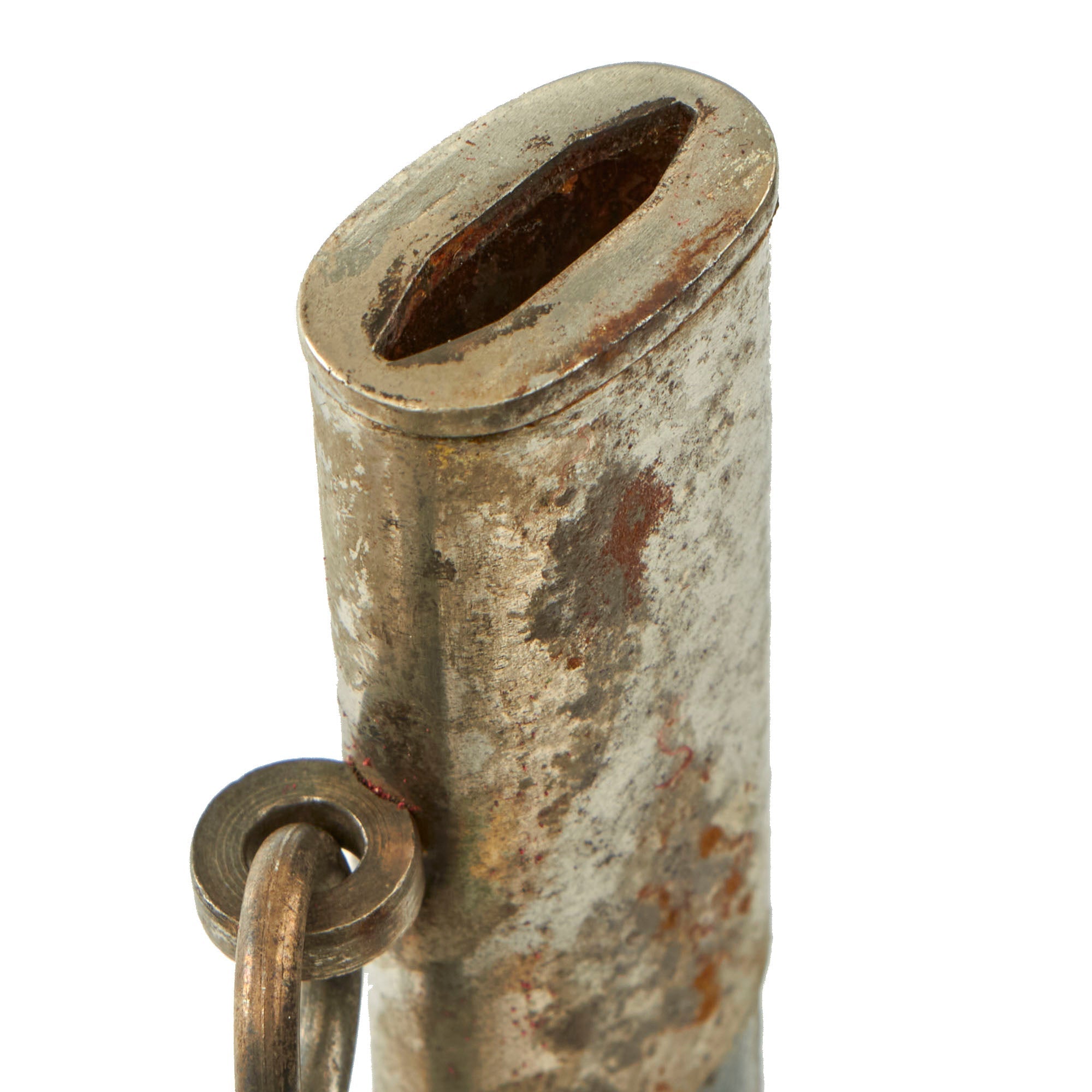 Original Item: One of a Kind Set. This is a fantastic and extremely rare Zollgrenzschutz Land Customs Official USGI Bring back set, consisting of a dress dagger, belt hanger, collar tab insignia, and even a cuff title, signed Tim Shields on the inner side. We assume this is the name of the soldier who brought it back, and then mounted it and the other items inside a display box decades ago. This box unfortunately was in poor condition, and more importantly, the red felt backing used actually reacted with the metal components of the set, resulting in oxidation on the reverse of most of the items. It even oxidized the pins holding the insignia in place, which had to have the heads snipped off to avoid damaging them. Definitely an interesting set with a lot of history!