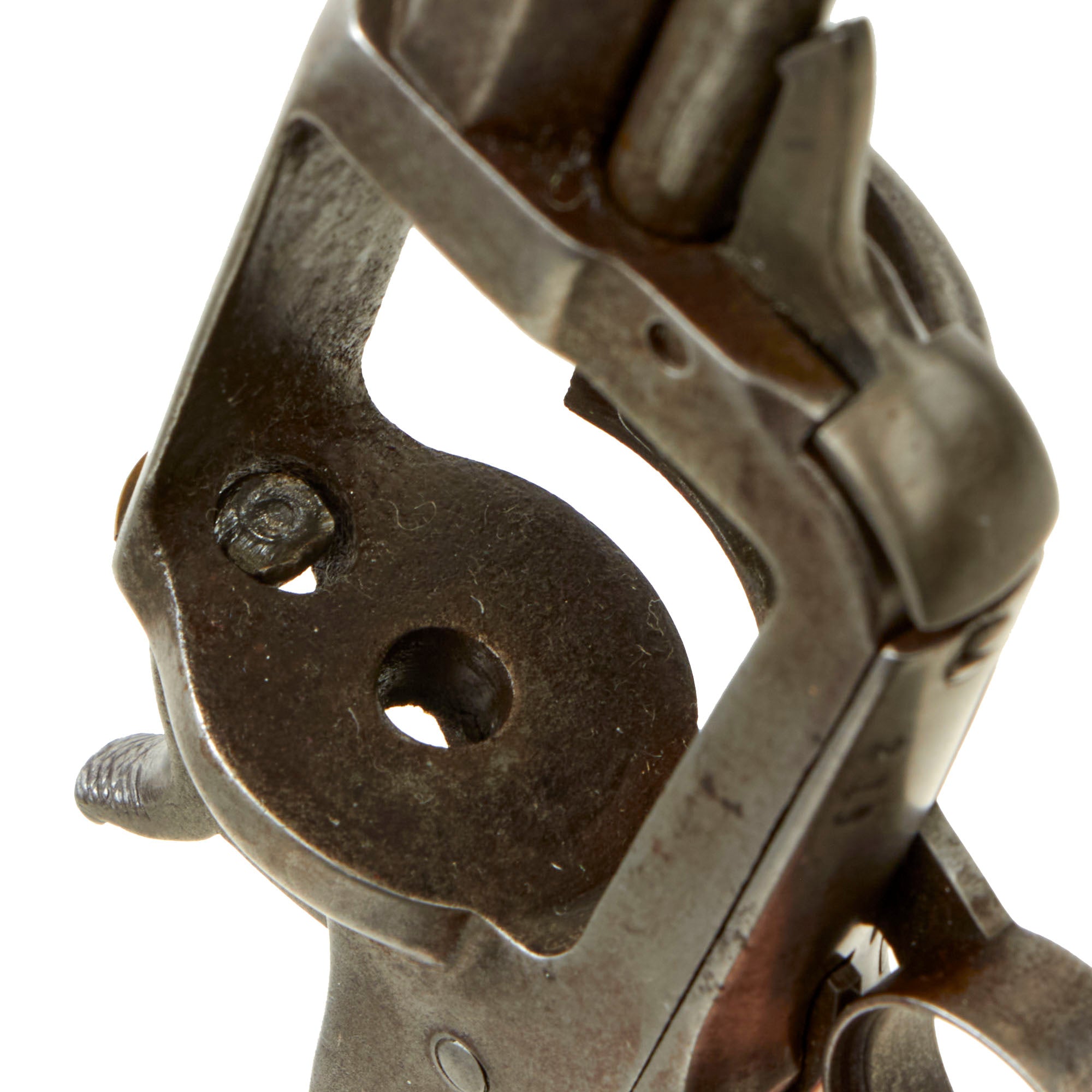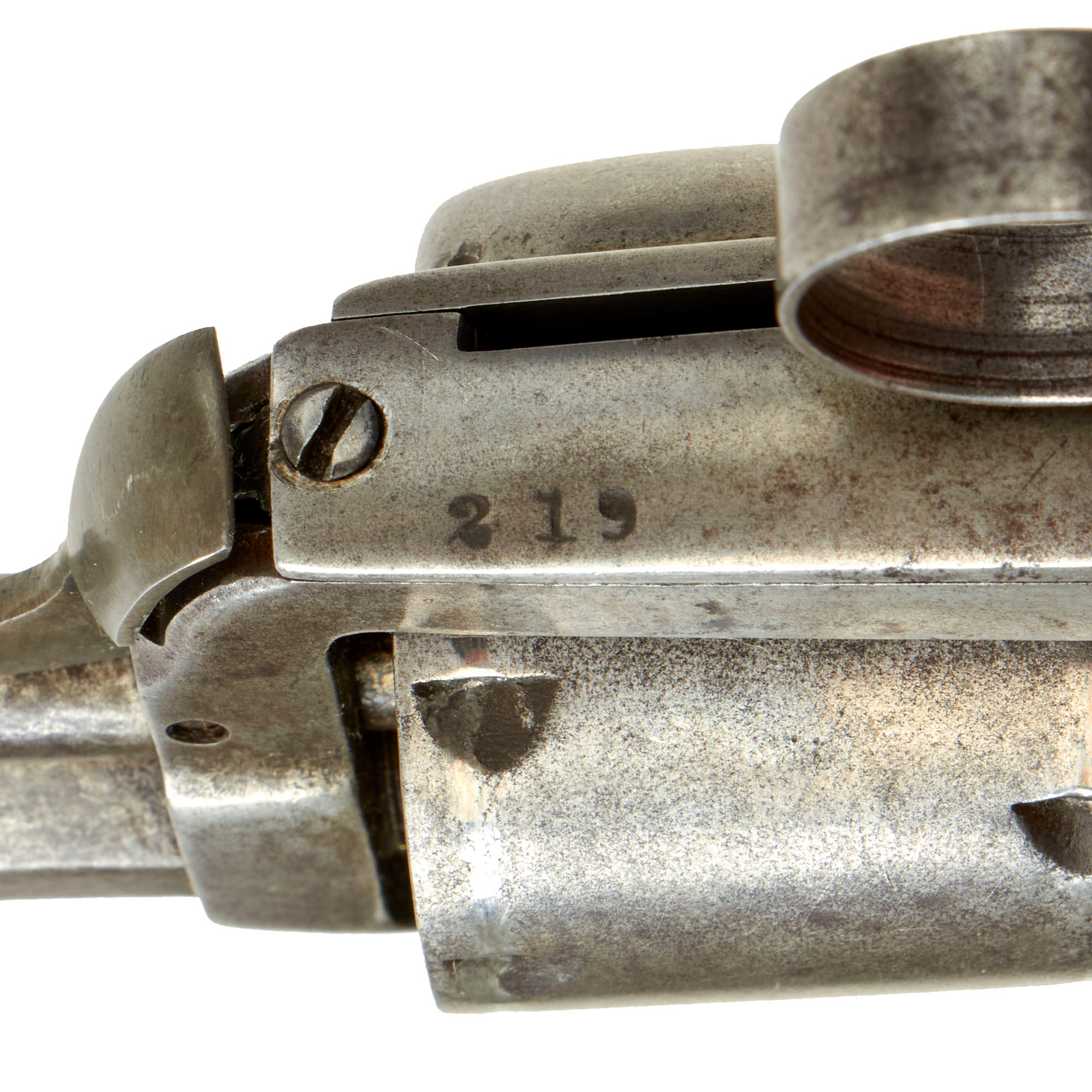This example is well marked, and bears serial number 219 on the bottom of the action, on the right side of the grip frame, and stamped onto the inside of both grip scales. We cannot find markings elsewhere, and do not know what other parts usually would have had the serial number on them. The revolver is in very good condition, cycling correctly and dry firing, which can be done independently due to the design. The revolver still properly breaks down for cleaning and reloading by removing the arbor pin. It should be noted however that with the cylinder out, the hammer can move forward far enough that the main spring will slip off, after which the grips will need to be removed so the mainspring can be put back into place.