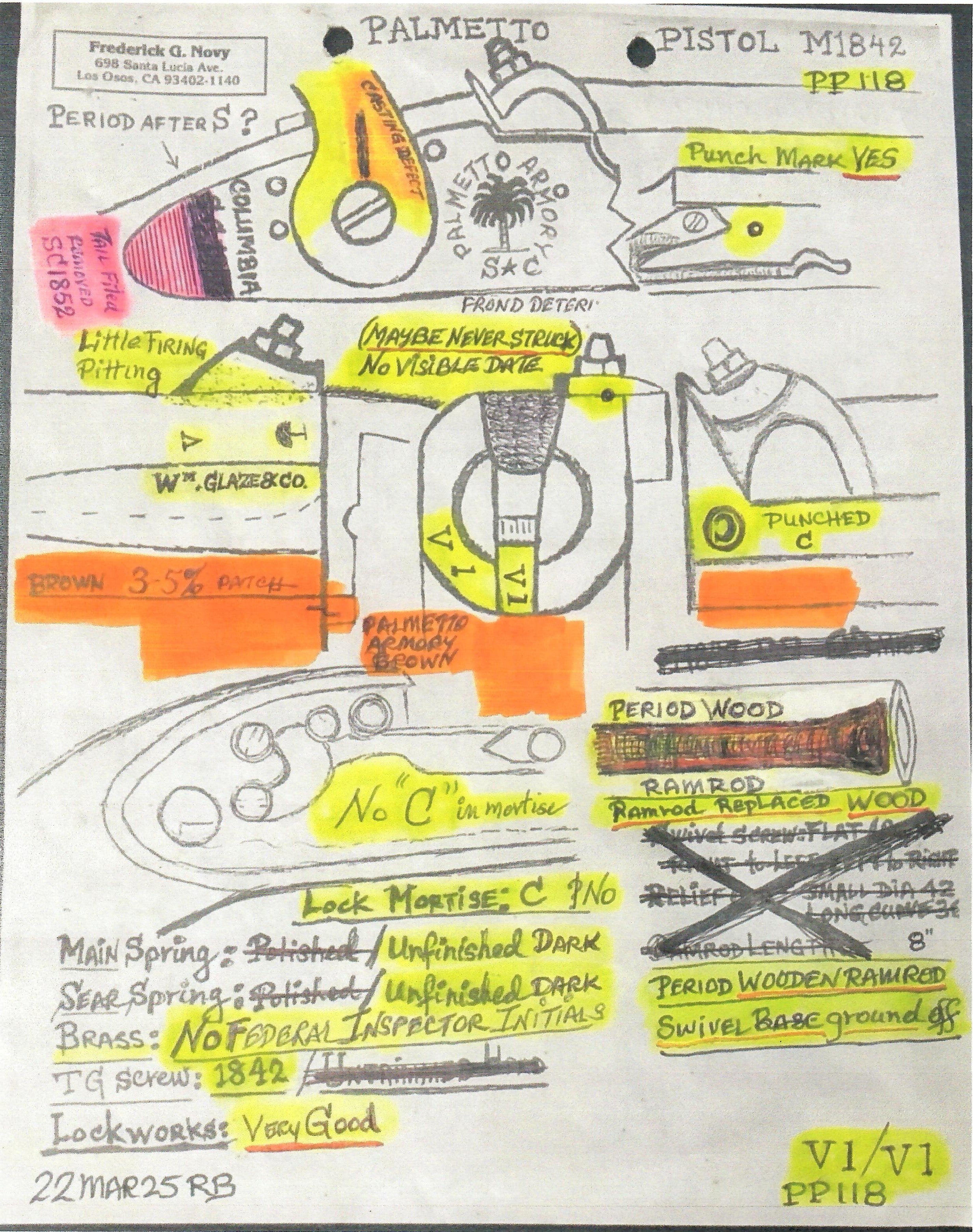 The pistol came to us with a print out of an illustrated research diagram made by Frederick G. Novy, an expert on arms from Palmetto Armory, and author of articles published in the journals of the American Society of Arms Collectors. It details the markings, modifications, and other aspects of the pistol in great detail. The research looks to have been done March 22, 2025, and represents the most up to date information about these rare pistols. Definitely a treat to have such a great piece of reference material regarding this specific pistol!