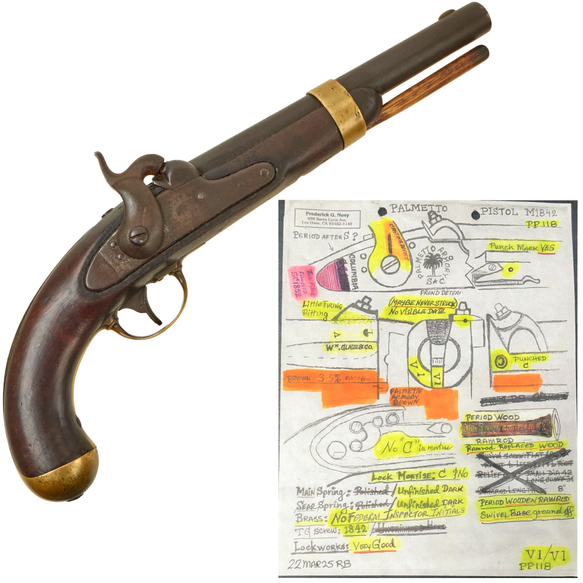Original Item: Only One Available. This is a very interesting example example of a very rare Civil War Era M-1842 Percussion Cavalry pistol, and is only the second of this type that we have ever had! Here we have one of only 2,000 made by Palmetto Armory of Columbia, S.C. as part of a military contract with the South Carolina Militia in 1852-53. This company was founded by Columbia silversmith and jeweler, William Glaze, and his partner Benjamin Flagg, who was a former Superintendent of the Asa Waters factory in Milbury, Massachusetts. Together, they purchased equipment and tooling of the Waters factory and had it moved to Columbia to set up their operation.