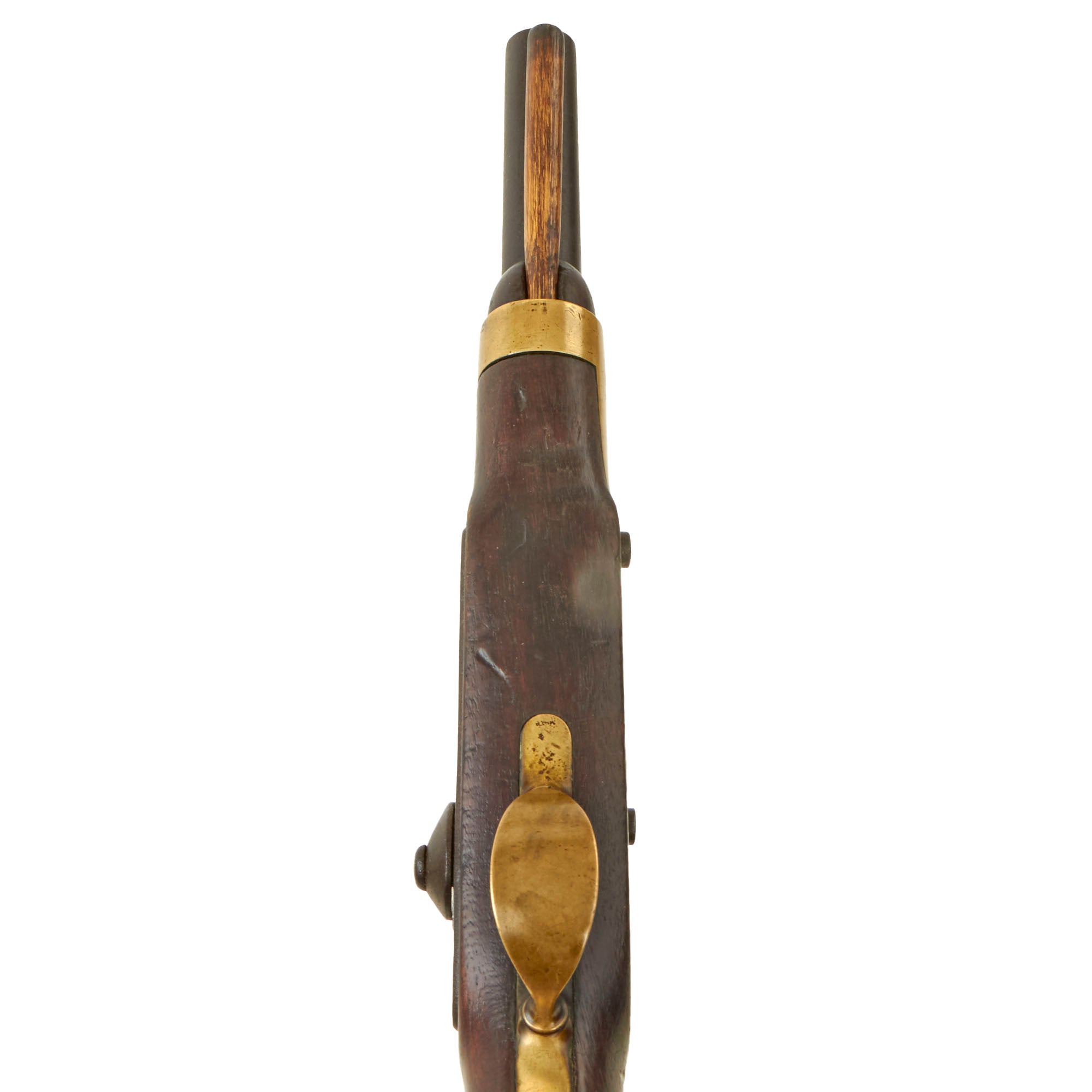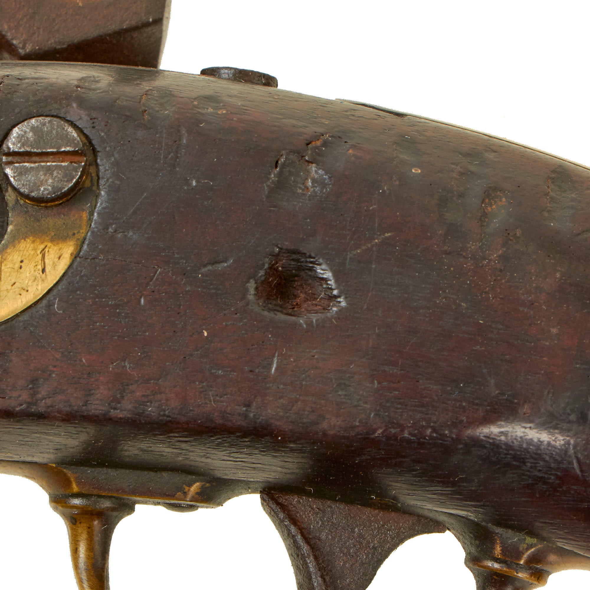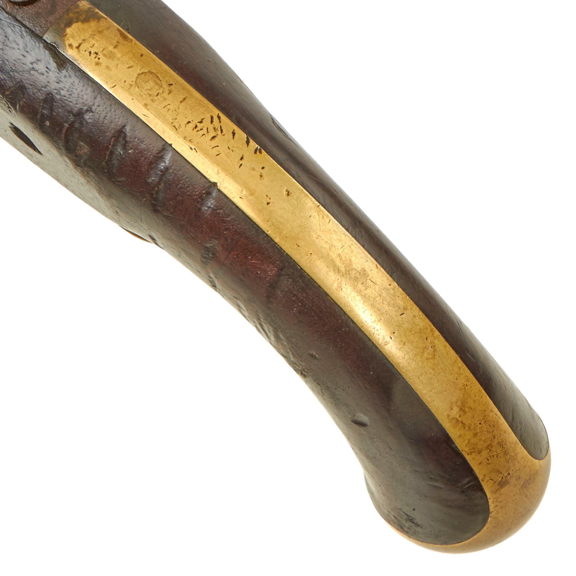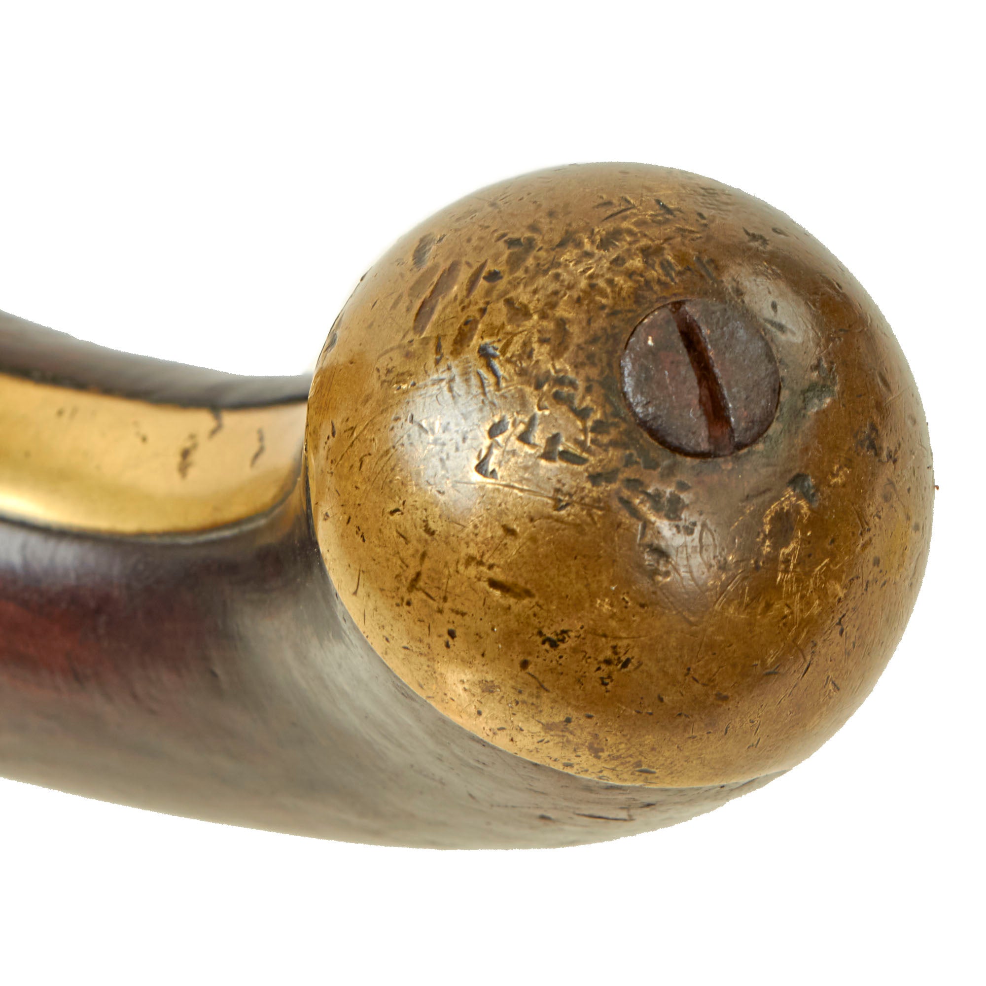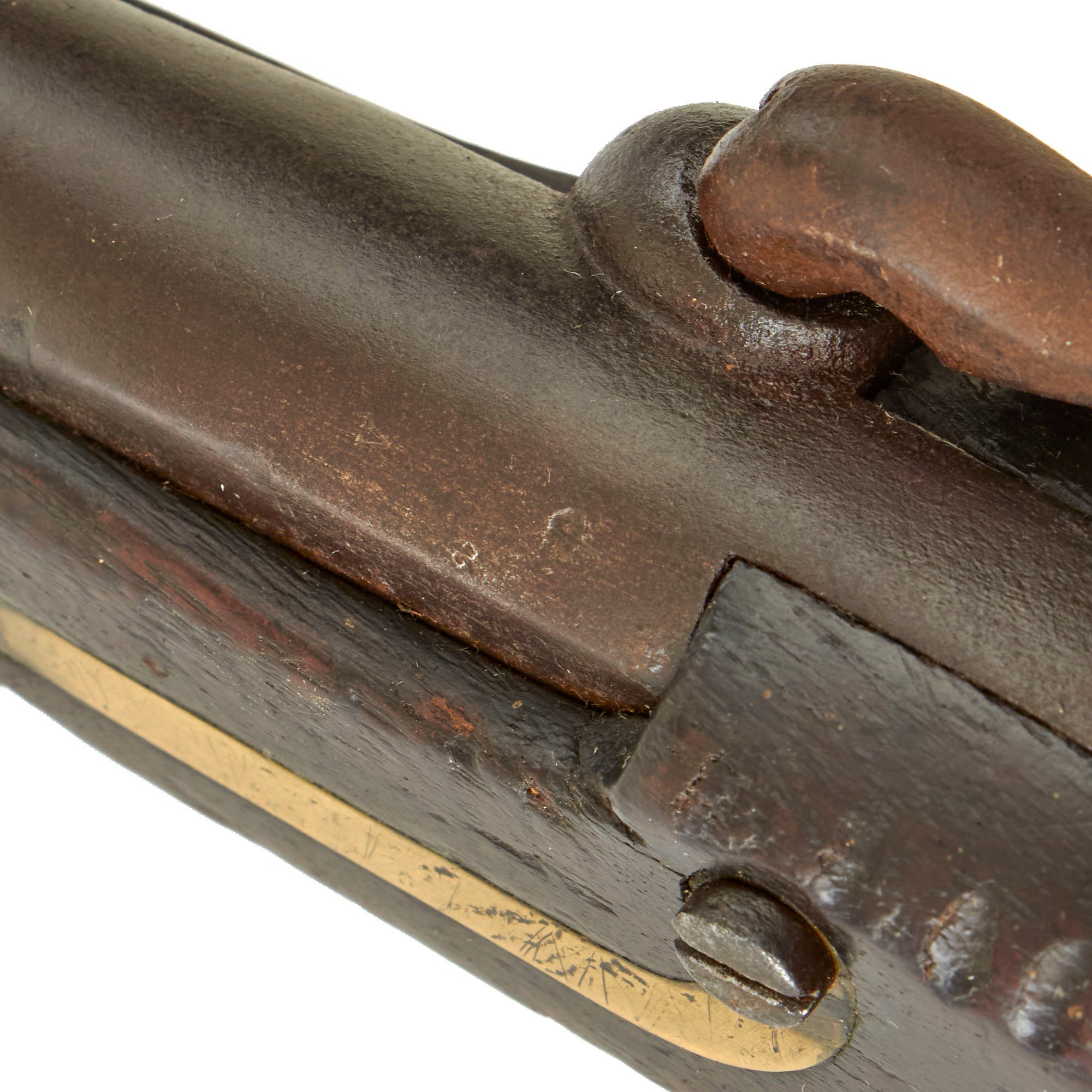 Aside from the markings, the pistol was originally a relatively standard Model 1842 Percussion Pistol, intended for use of Cavalry, and has a .54" caliber 8 1/2" barrel, measuring 14 1/4 inches long in total. Of note is that the original "captured" ramrod was removed at some point, and the bolster for it ground off, though we can still see evidence of it on the bottom of the barrel. The pistol is now fitted with a period replacement wooden ramrod, and still has a good amount of the markings, though they are worn. Overall the pistol now shows a lovely aged patina on the metalwork, and the stock shows that it saw long service.